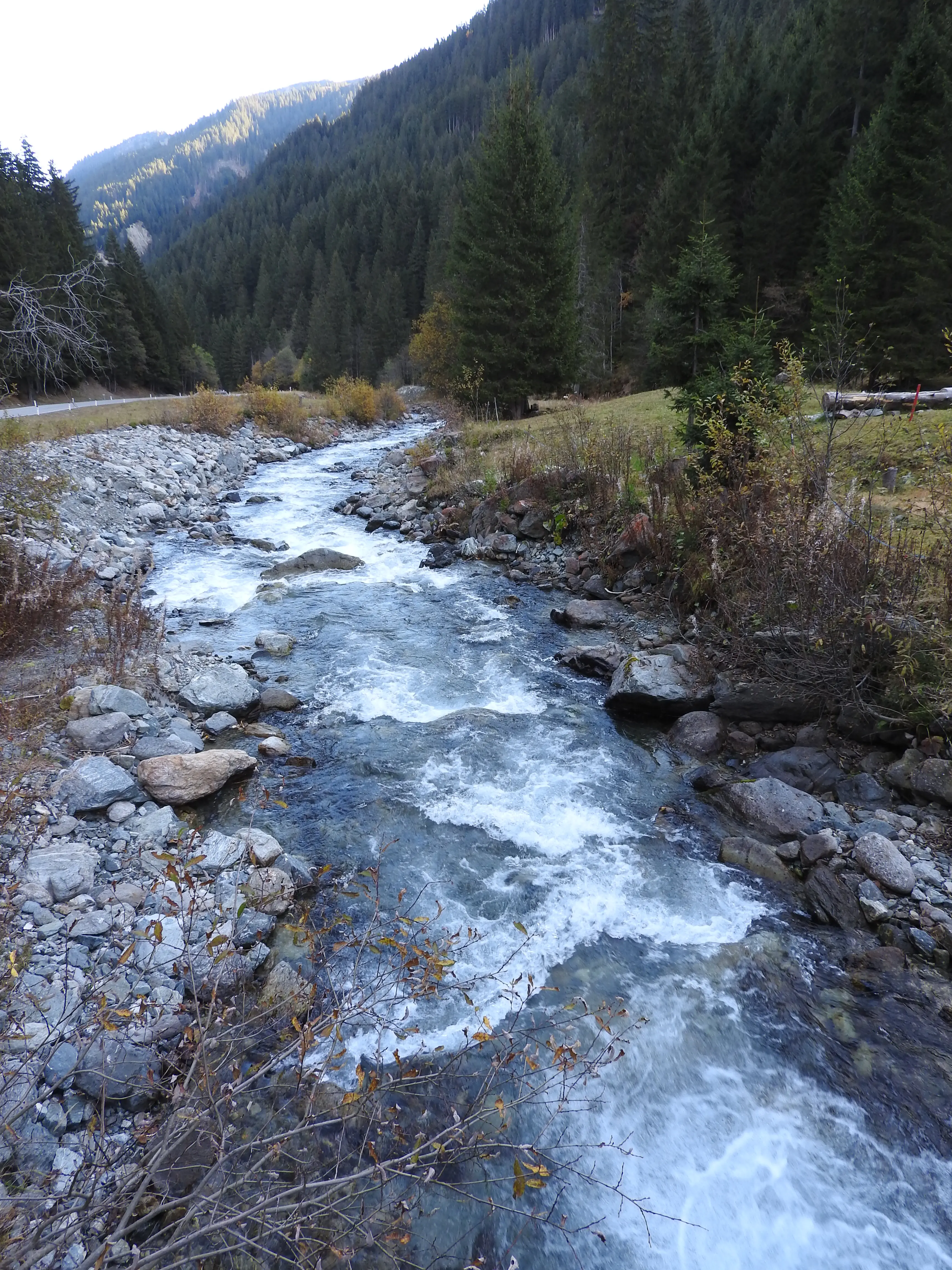 Terwijl wij de rivier aan het bekijken zijn komt er een busje langzaam voorbij rijden met een paar mannen achterin die de stokken voor de sneeuw aan het plaatsen zijn. Weten zij iets wat wij niet weten of is het gewoon de tijd voordat de winter en de sneeuw komen en moet alles op tijd klaar zijn.