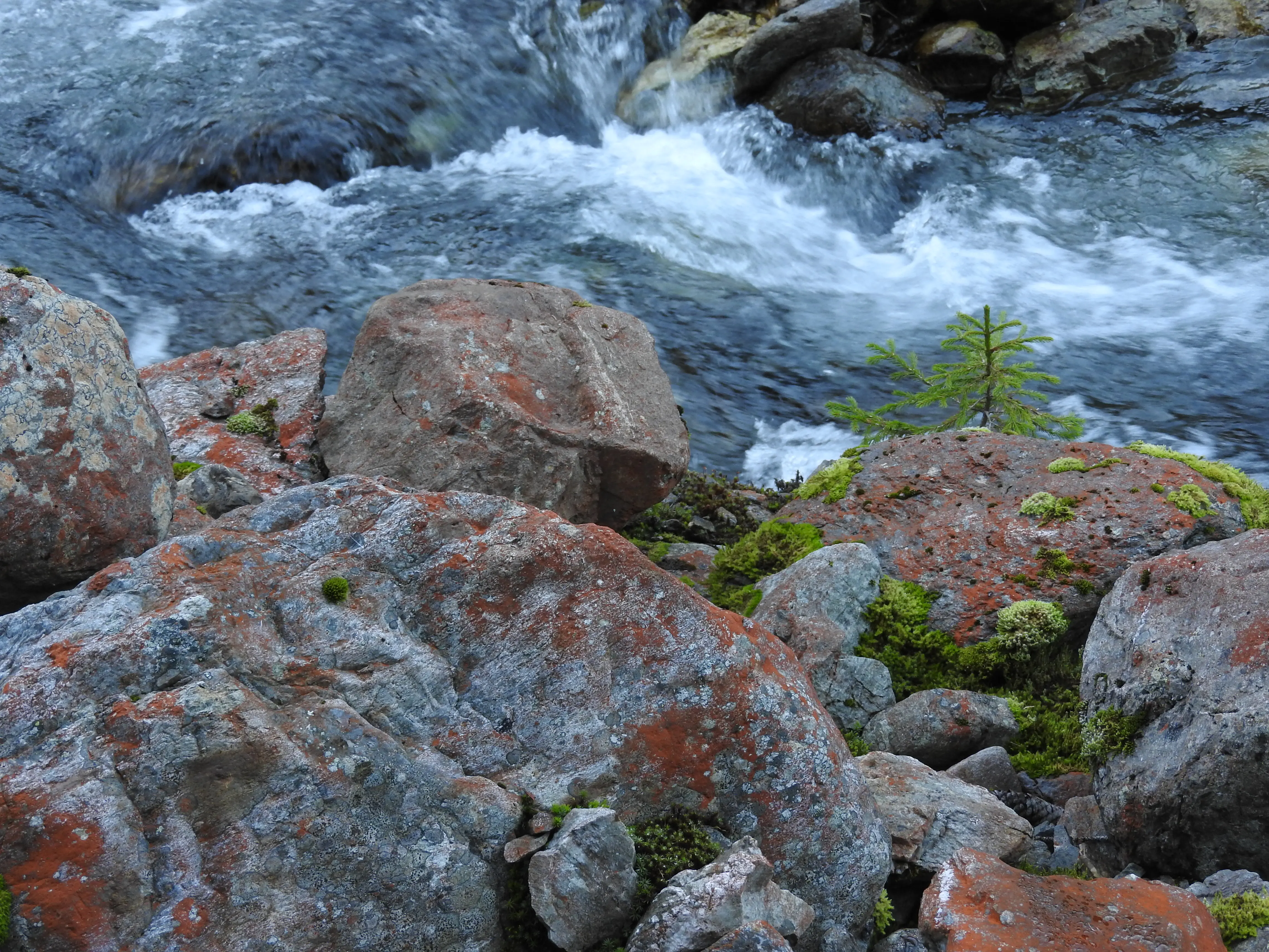 Helaas ligt het ’s morgens geheel in de schaduw dus het valt een beetje tegen. Wat ons wel opvalt zijn de rode stenen die her en der in het water en op de kant liggen. Er zit iets op of overheen maar wat blijft ons een raadsel.