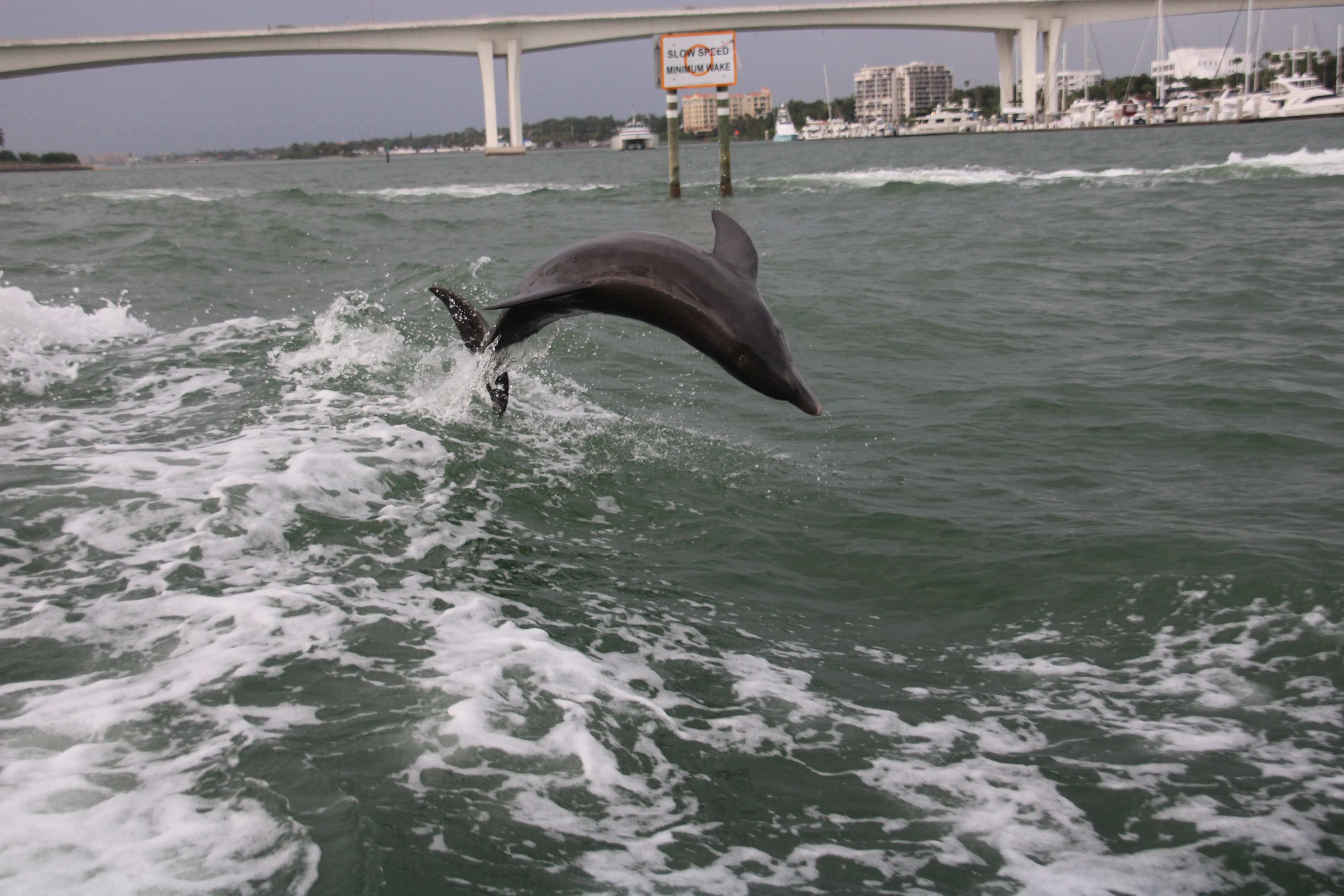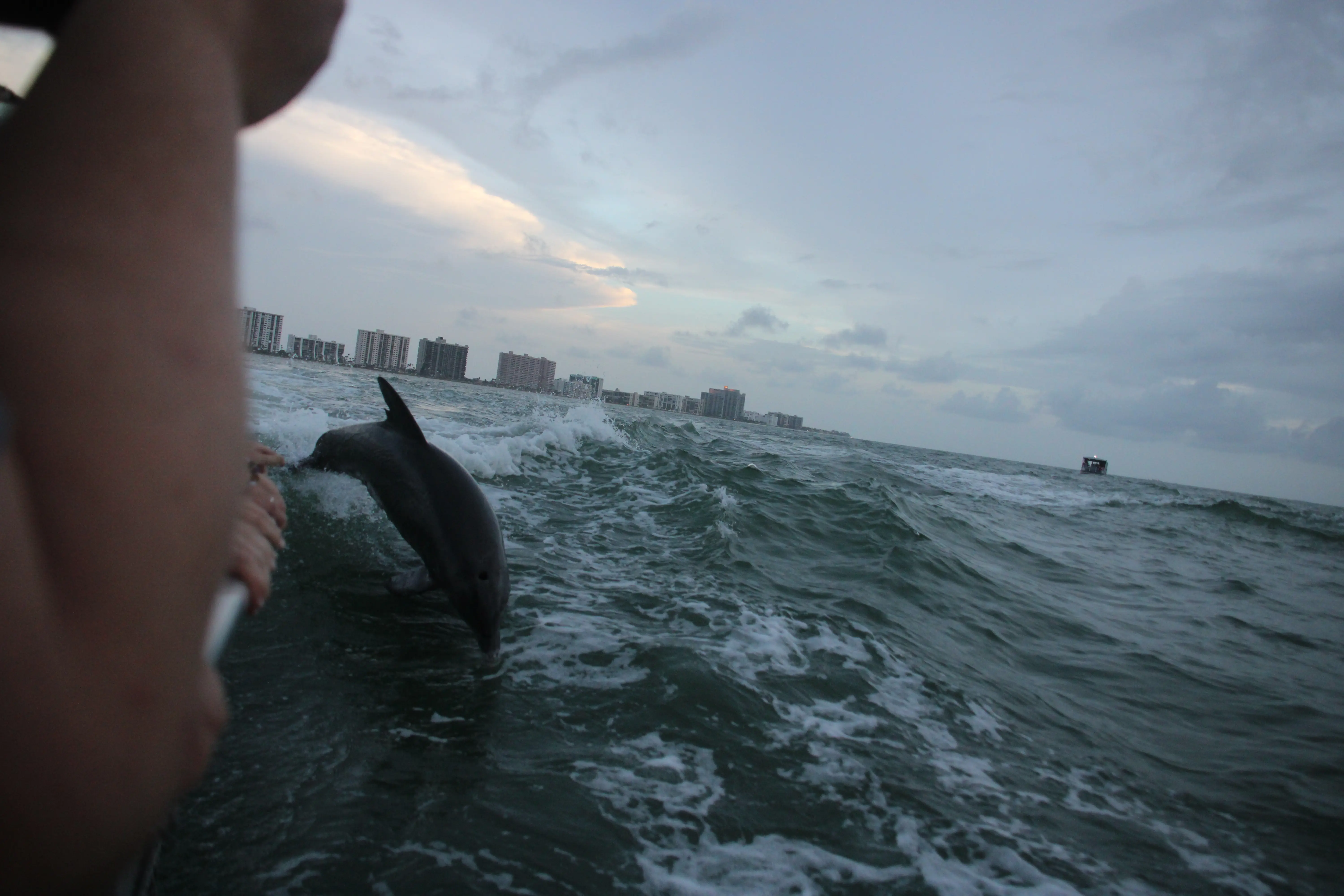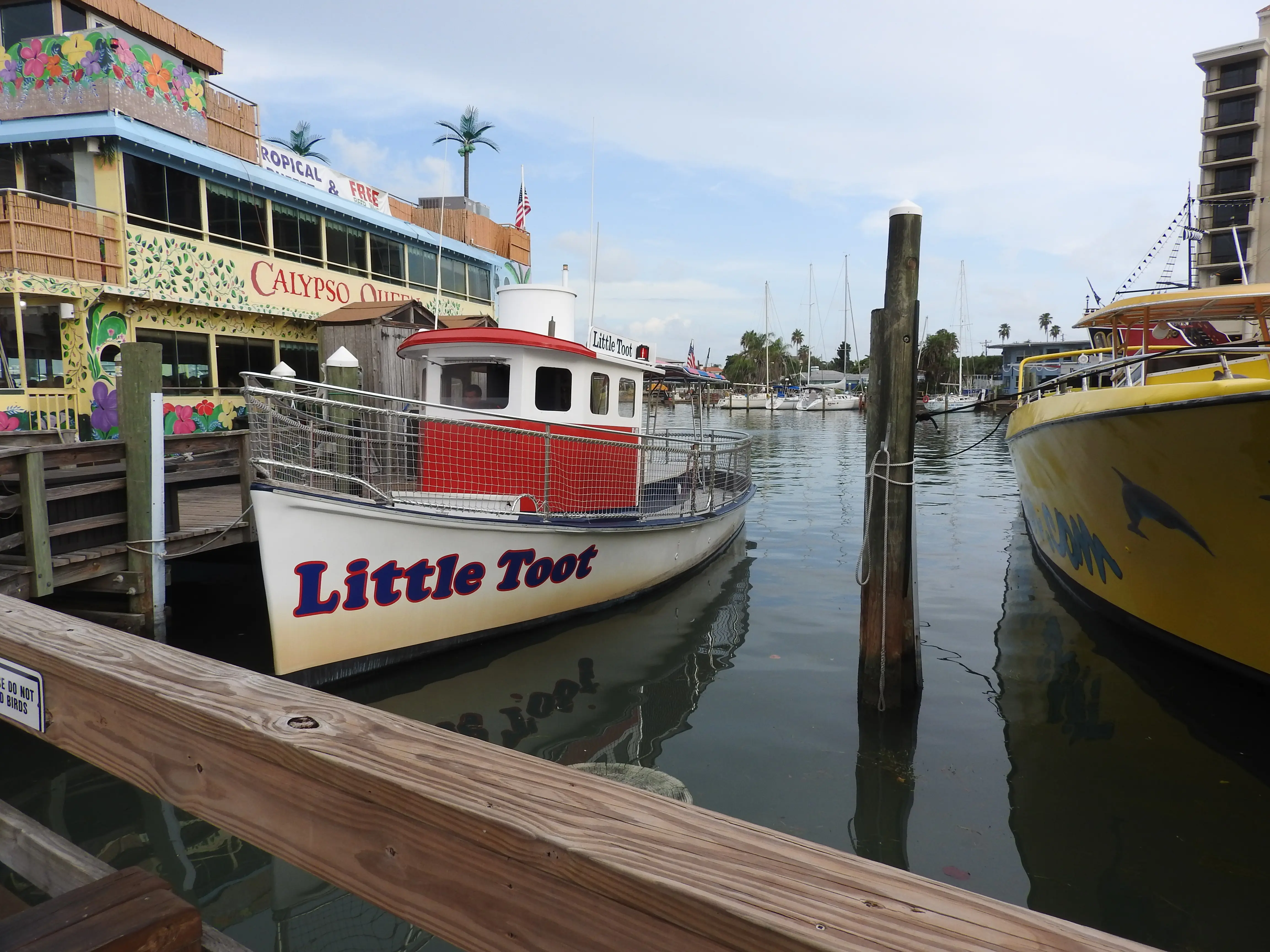 Gelukkig voor ons ligt het restaurant tegenover de haven waar Little Toot vandaan vertrekt. Dit is een klein bootje waar 30 personen op kunnen en die een hele grote golf aan de achterkant van de boot kan maken zodat de dolfijnen daarin komen spelen. Helaas voor ons zit die boot vol maar toch is er nog ruimte genoeg.
