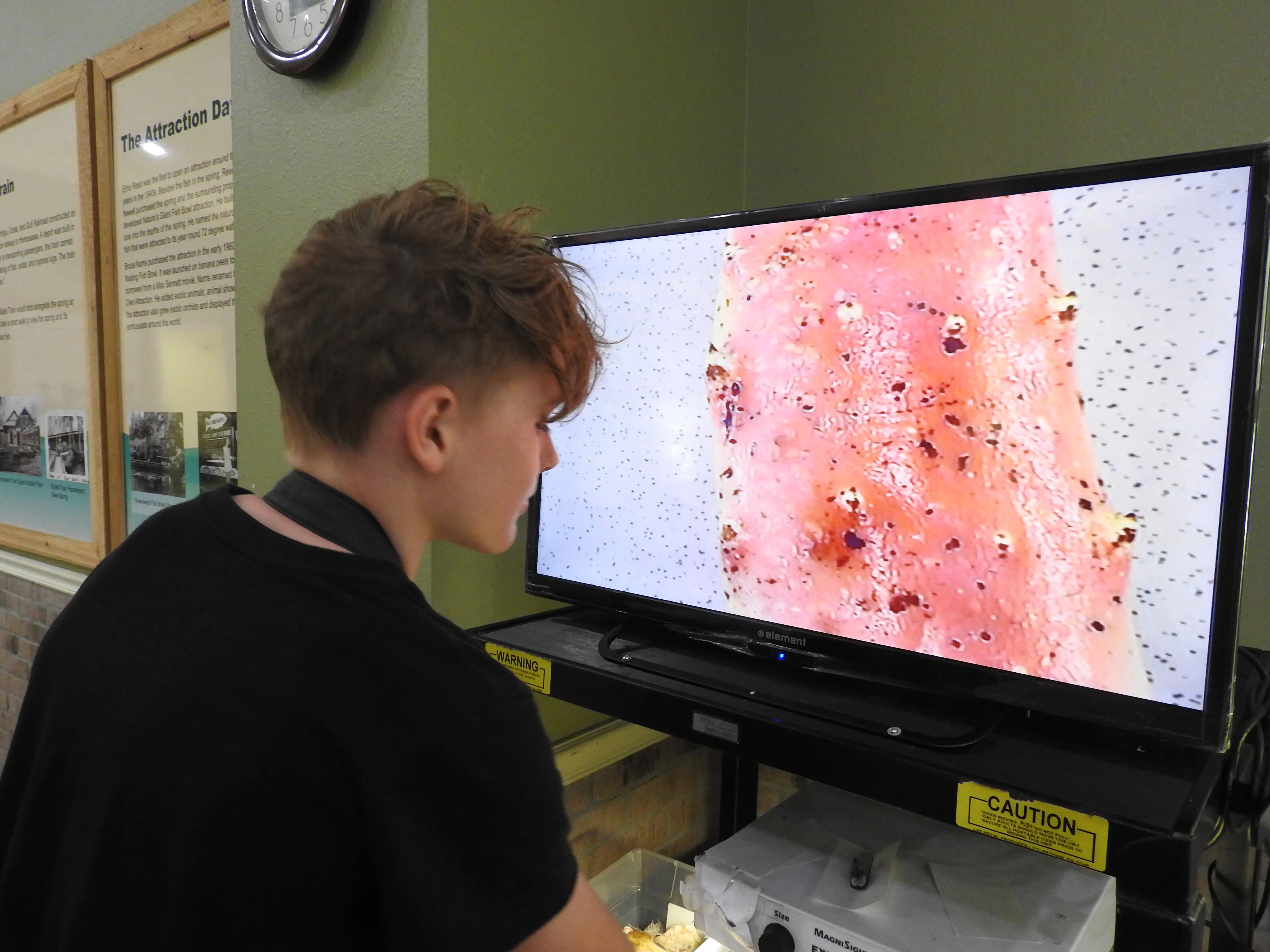 Daarna lopen we richting het info centrum want dat zou een cache in de buurt liggen, op de plek aangekomen niks te vinden dus even logjes lezen. Zie ik ineens een foto dat hij binnen ligt dus op naar binnen, daar kan Martijn ook meteen een microscoop proberen.