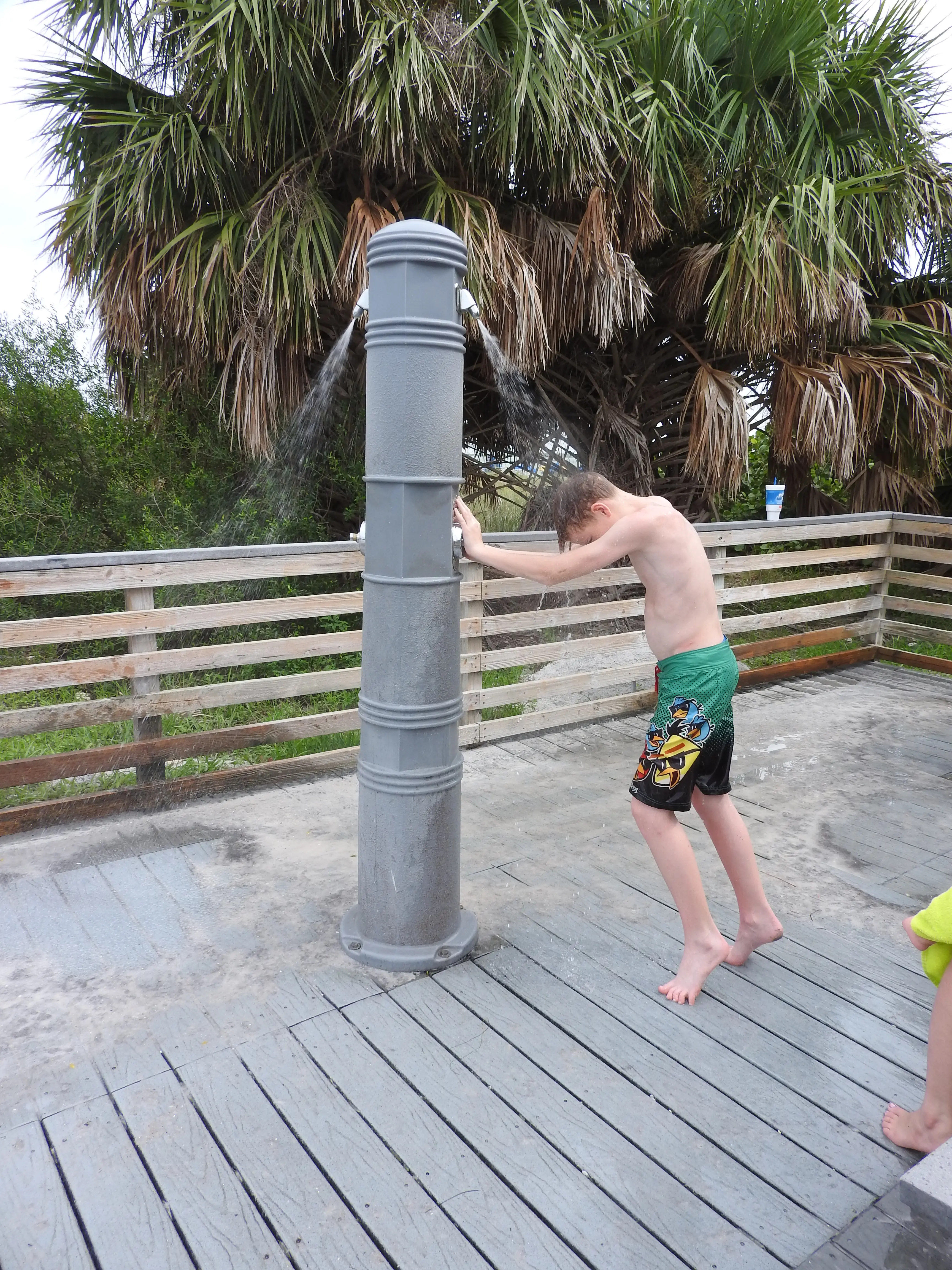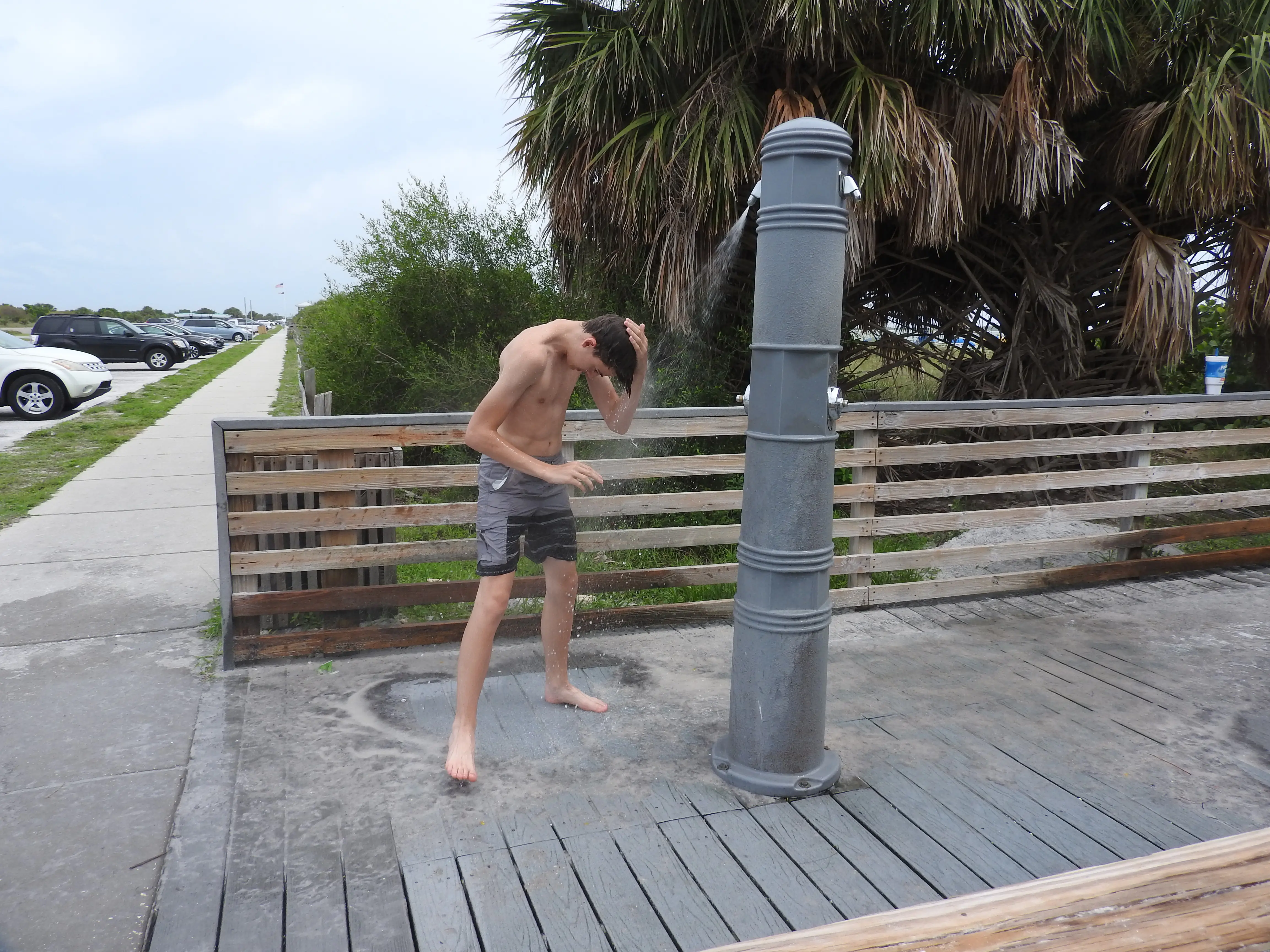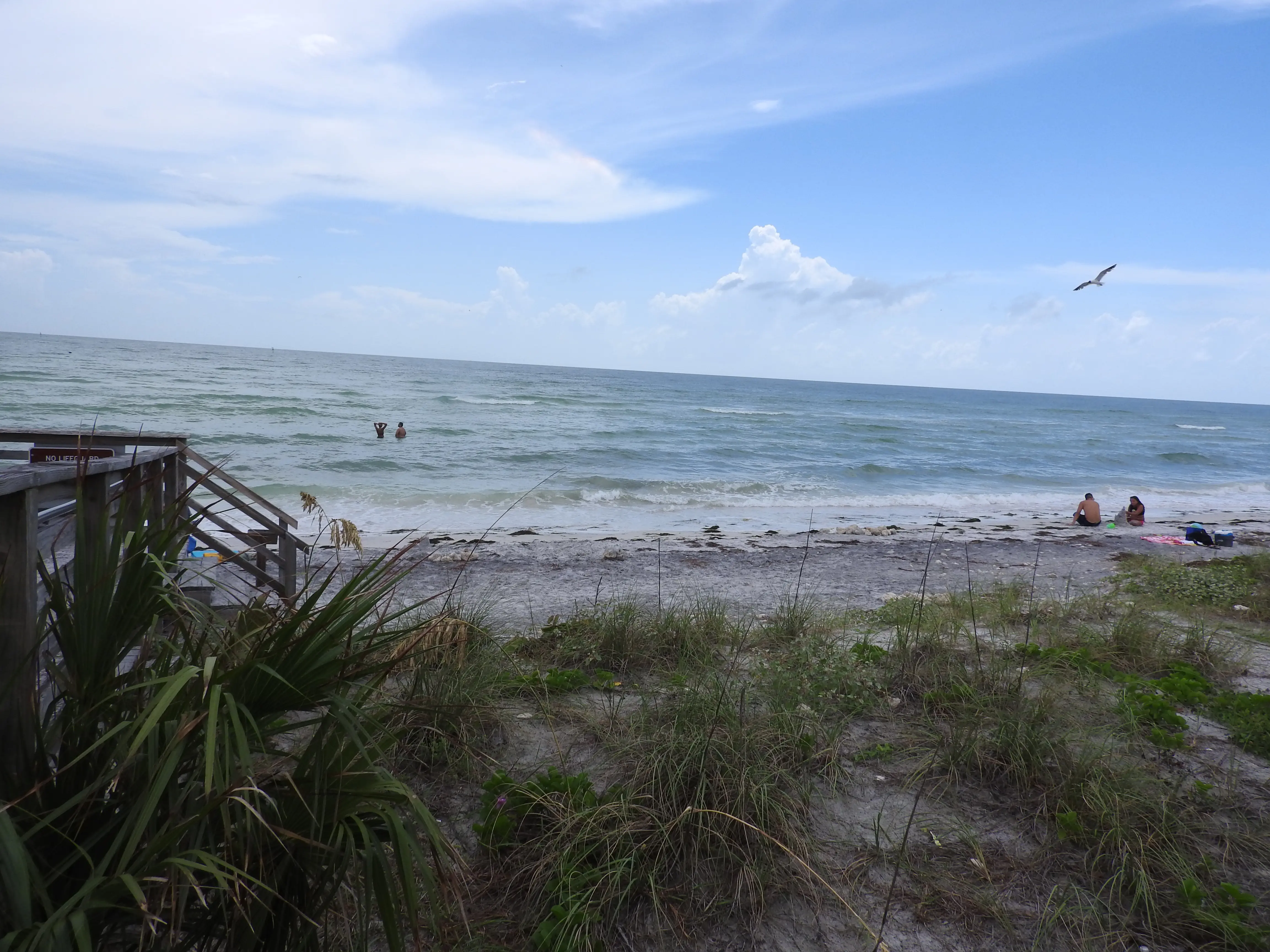 Honeymoon Island word het, het is ook Statepark dus alle voorzieningen zijn aanwezig, Wc’s douches en zelfs een Lifeguard. Het strand is hier niet zo mooi als ik had gedacht want er liggen veel stenen op. Dat drukt de pret niet voor de kids want na 5 meter door het water is het weer zand. Dus lekker even zwemmen, ik heb inmiddels weer een geocache gespot dus ben daar even mee bezig.