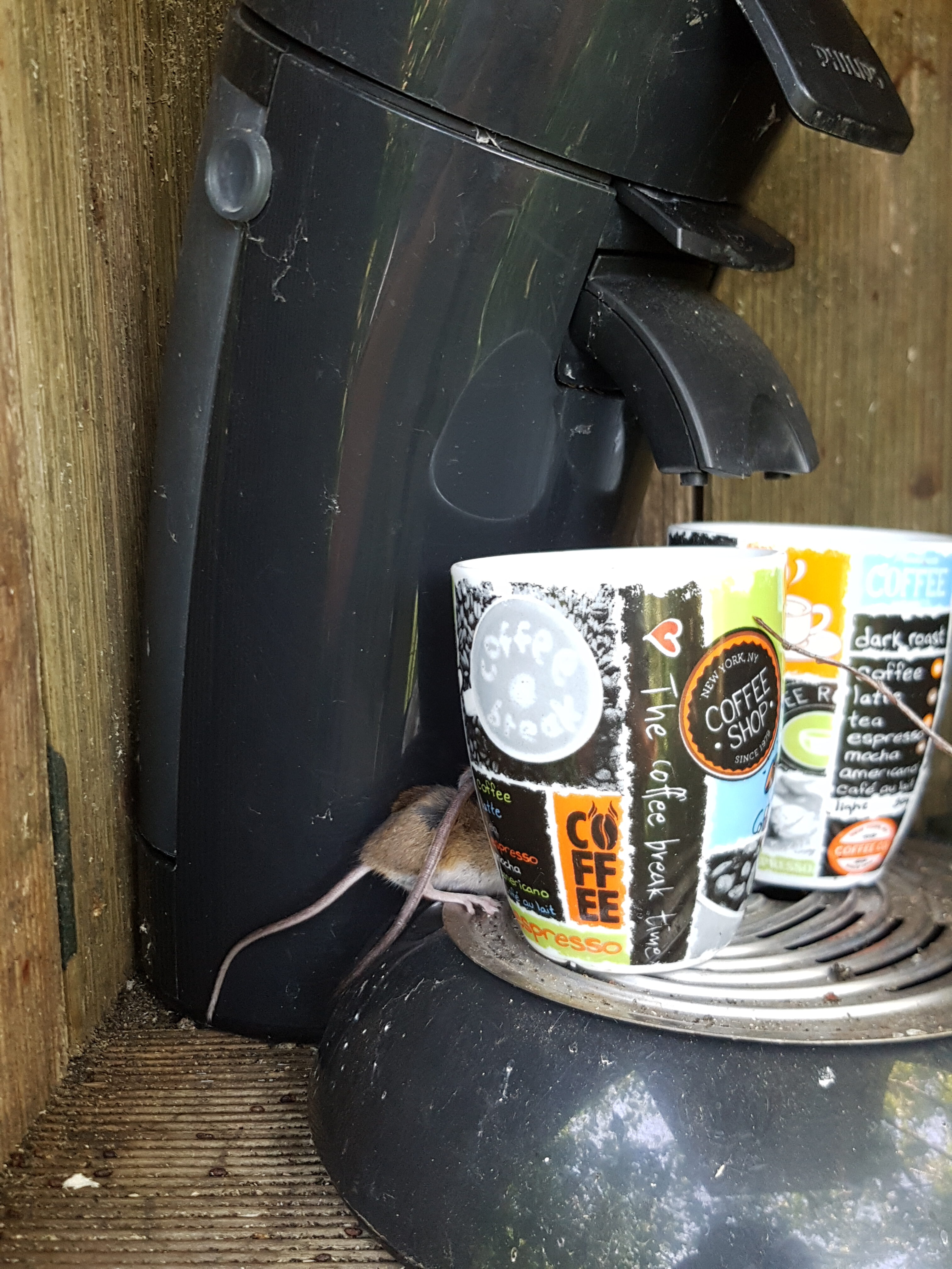 Daarna ben ik nog even op de koffie gegaan bij een “Muizen Familie” je doet de cache open en dan zie je een aantal muizen zitten, ze proberen zich te verstoppen maar zijn daar niet heel erg goed in.
