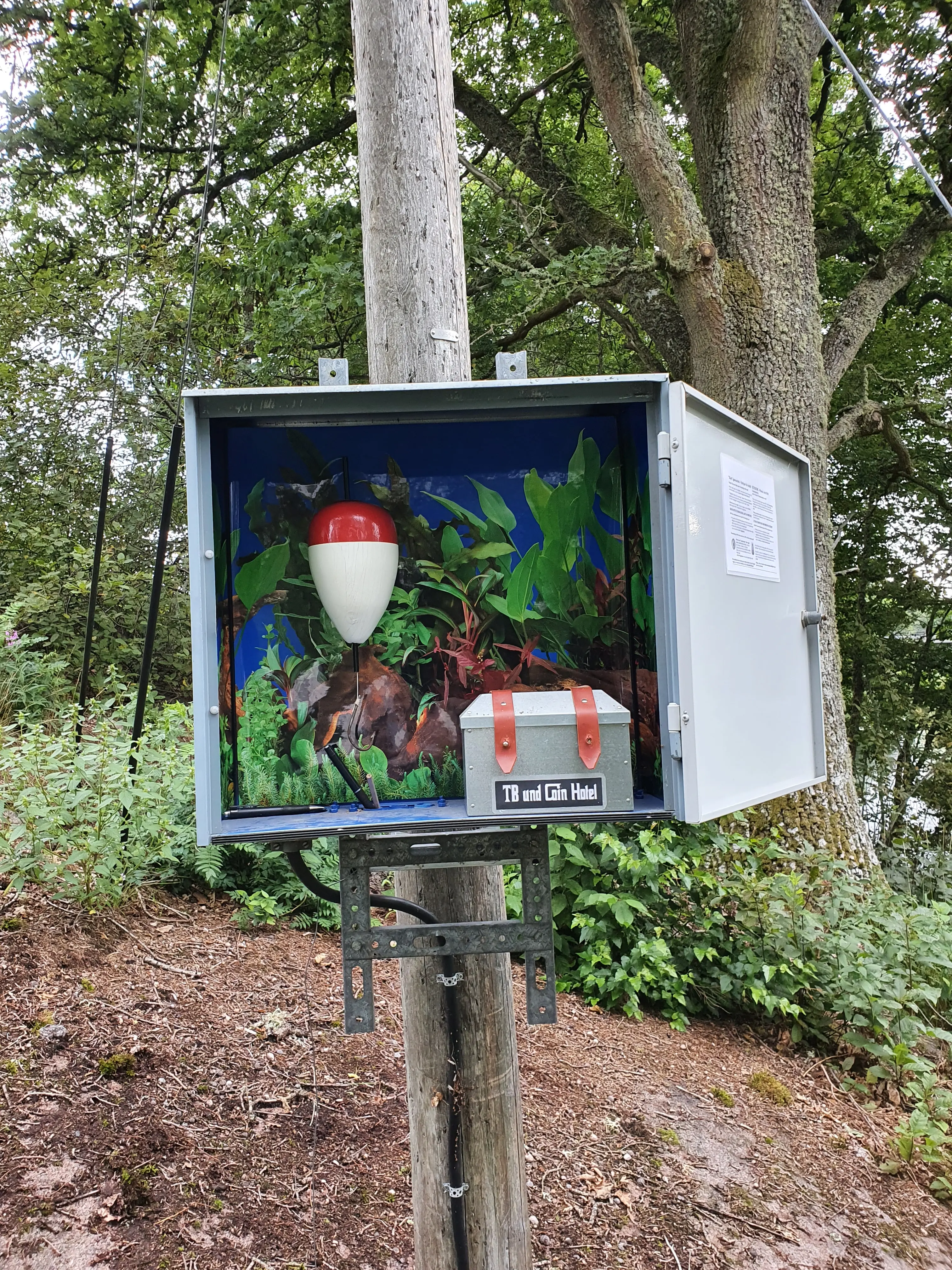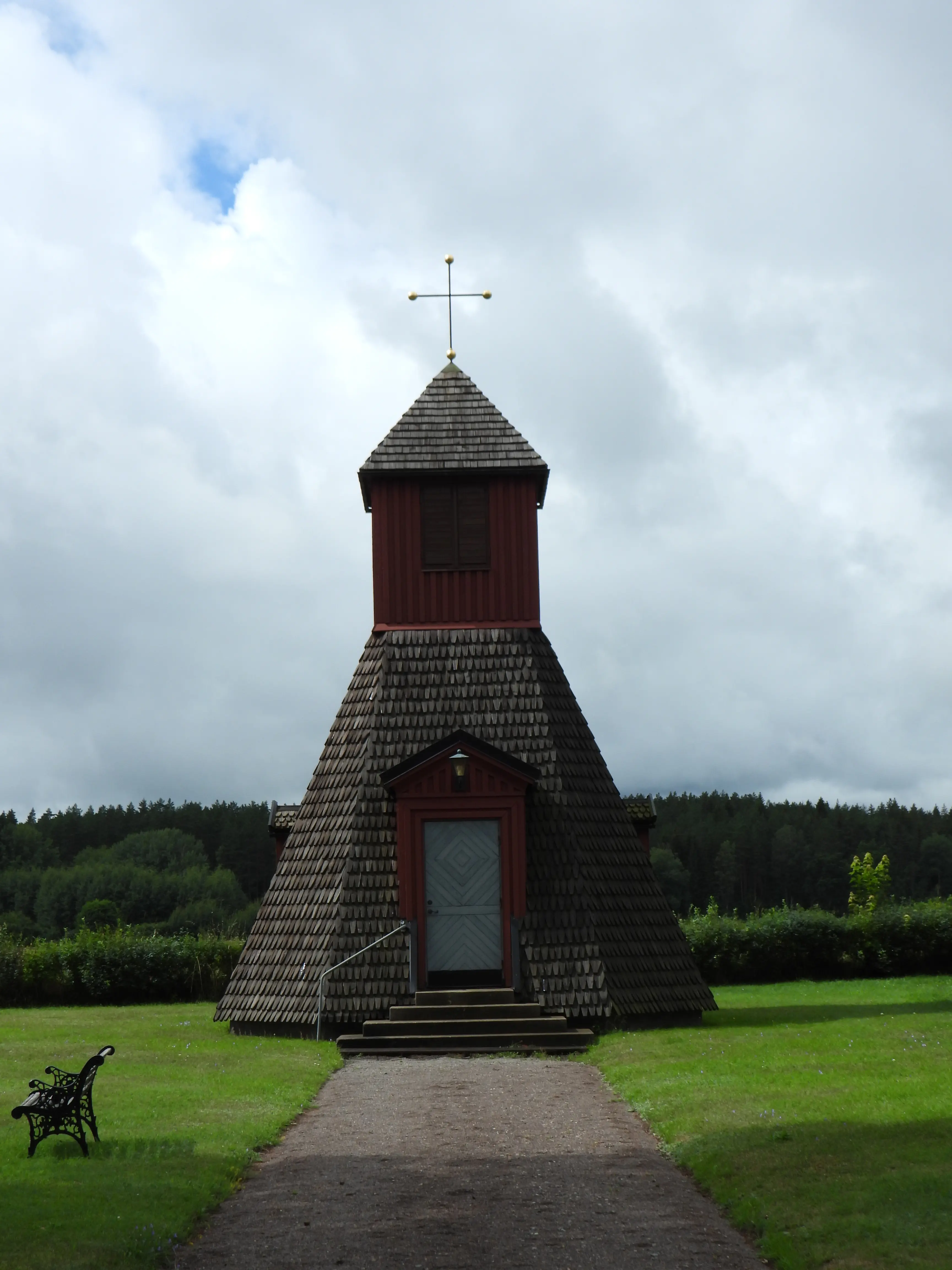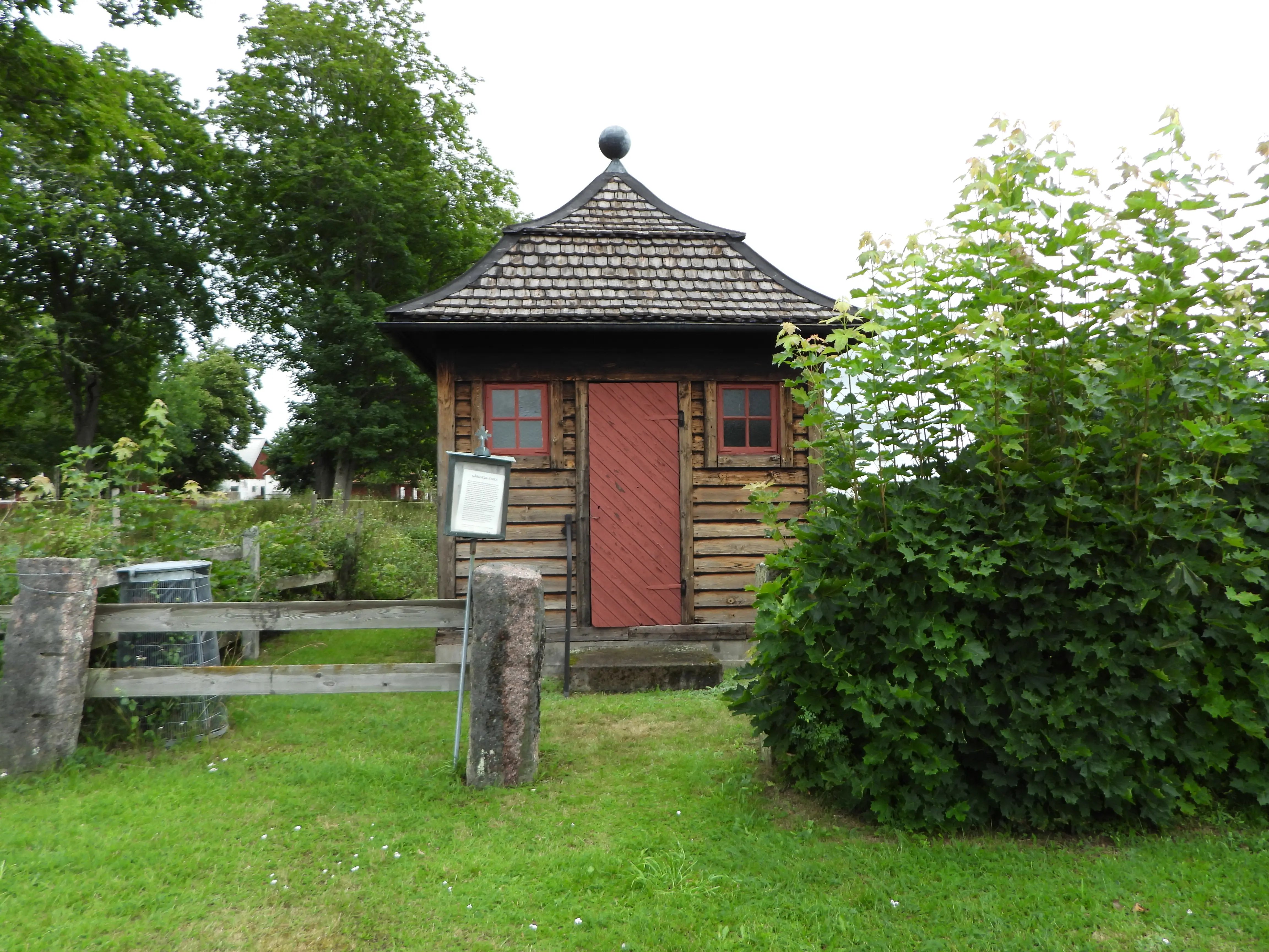 Daarna zijn we doorgereden naar een kerkje waar een multi ligt een makkelijke volgens de listing. Terwijl ik worstel met de vertaling van de vragen van wat bedoelen ze nu loop ik om een gebouwtje heen om palen te tellen en zie de cache al hangen, dus inderdaad heel makkelijk. Daarna nog even rondgekeken naar het vreemde bouwwerk.