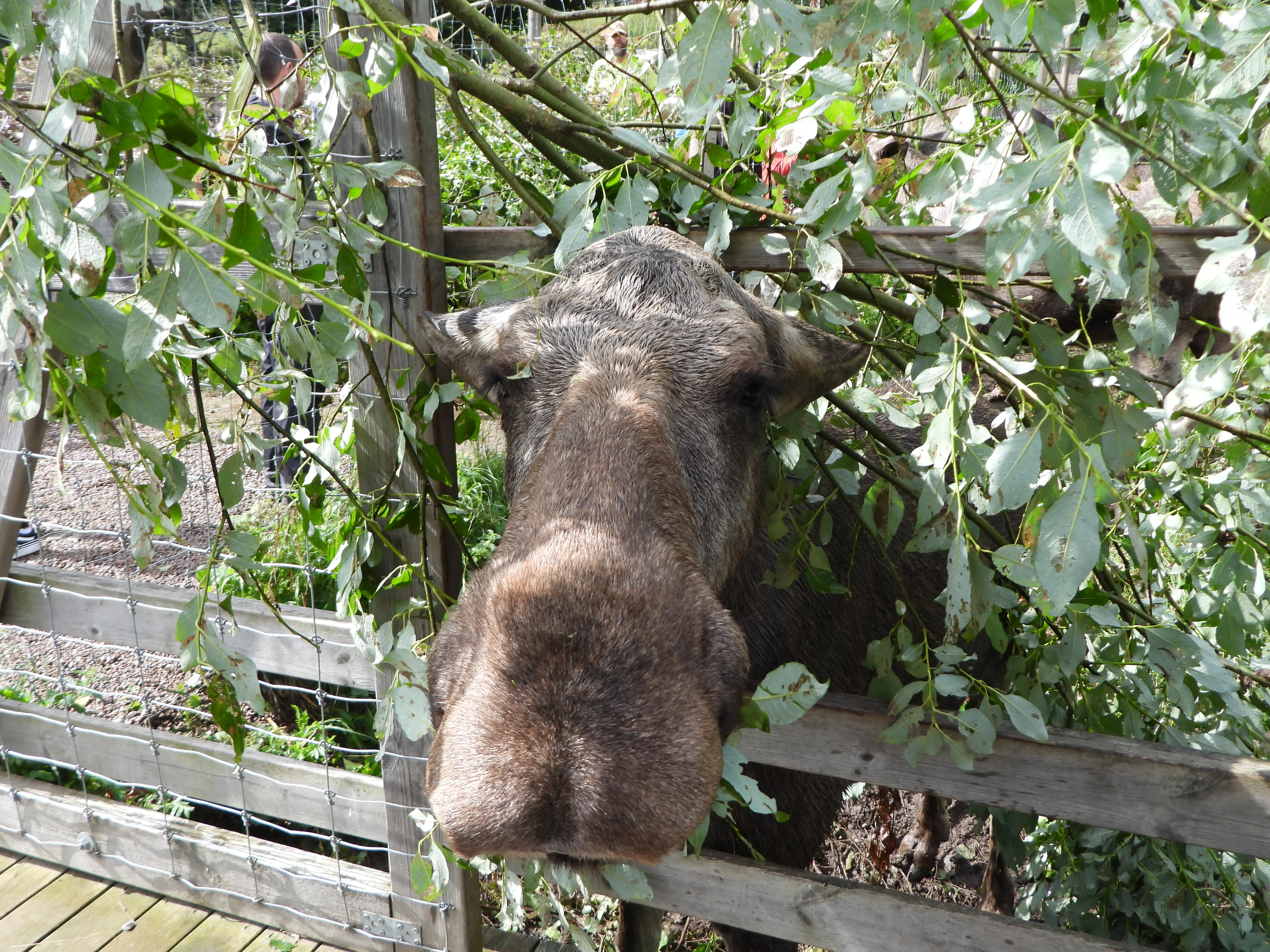Om 11 uur worden de elanden gevoerd en komt er een grote kar met verse takken aanrijden, ze weten het precies want ze komen allemaal naar het hek.