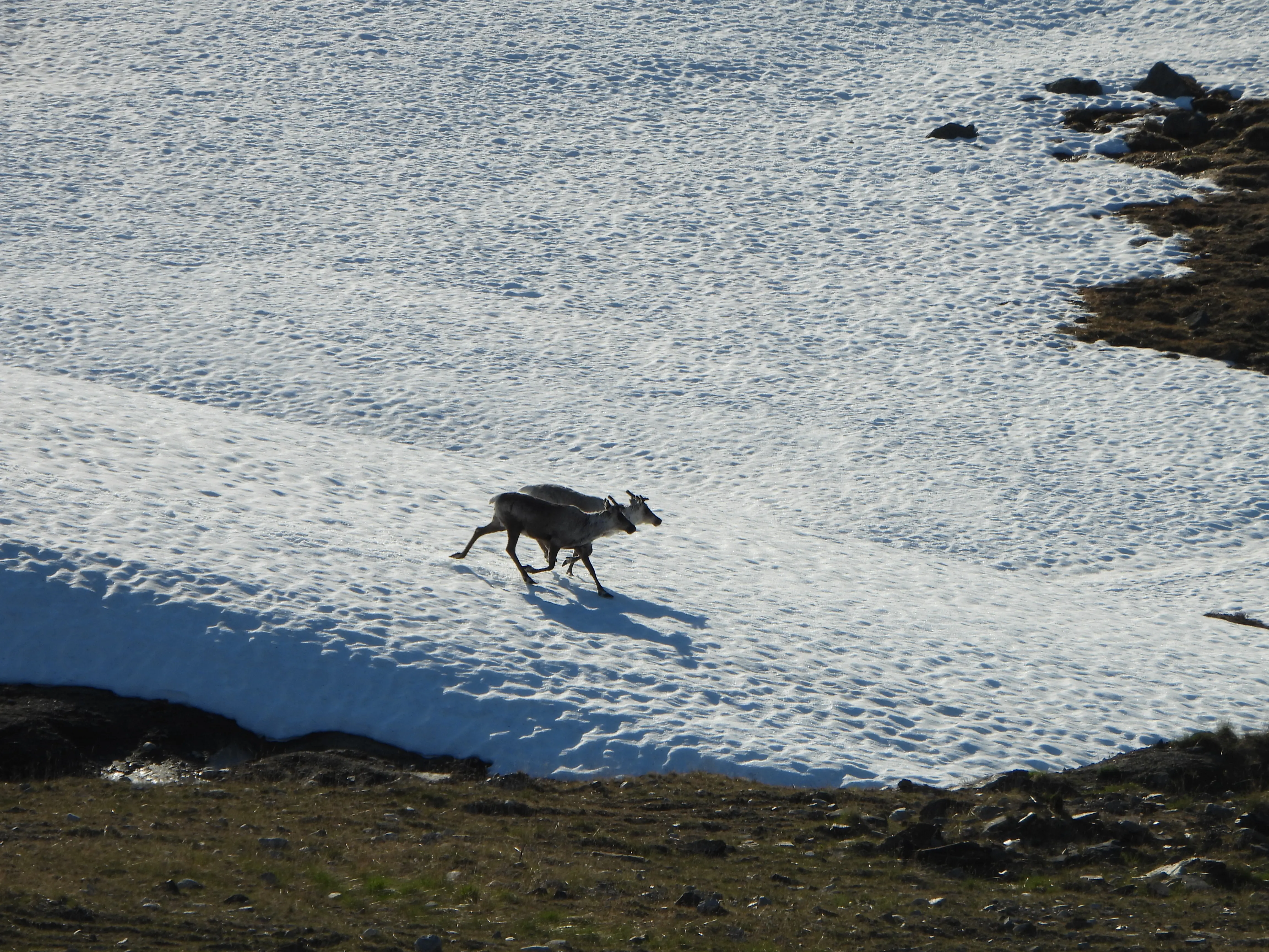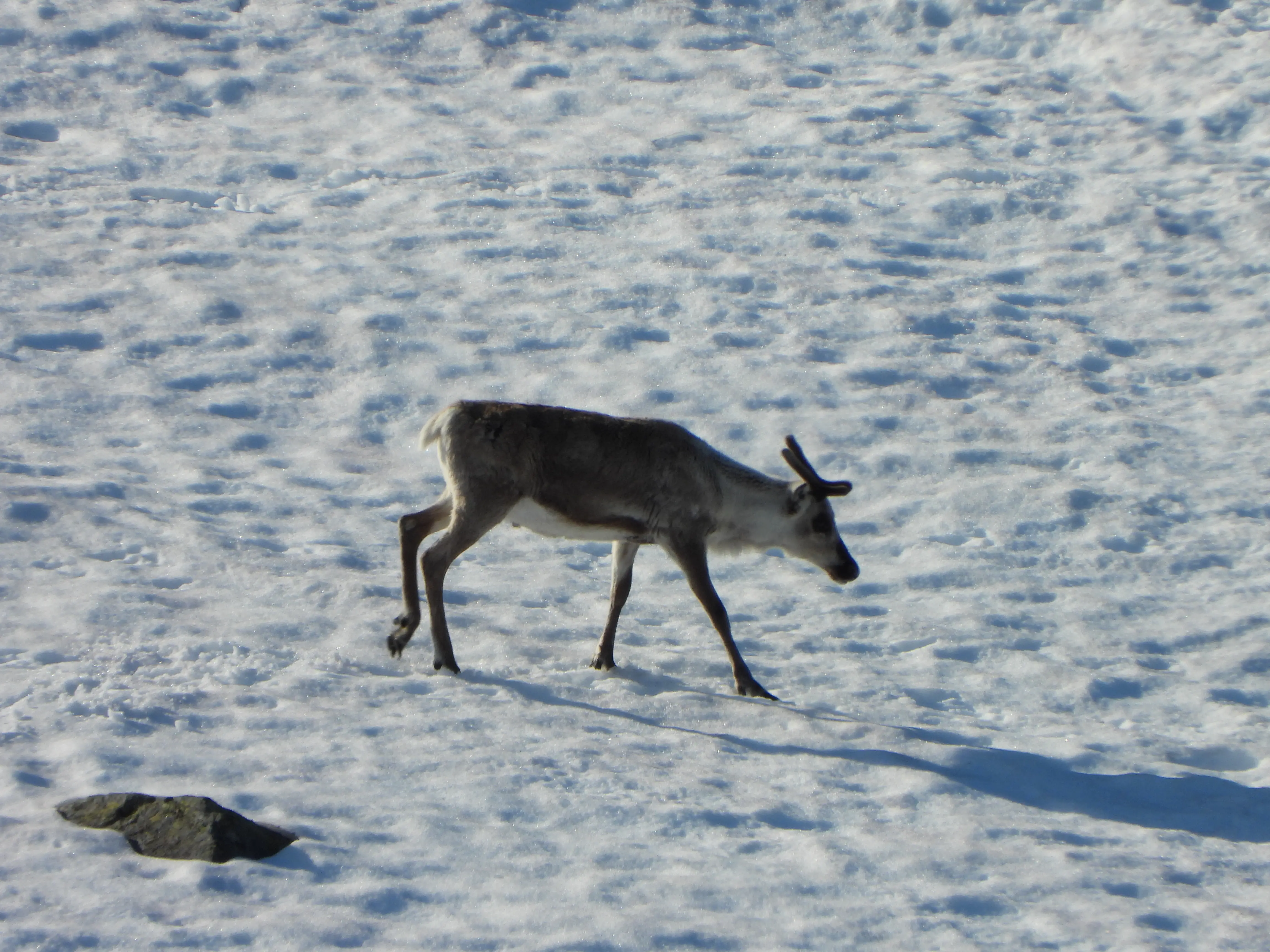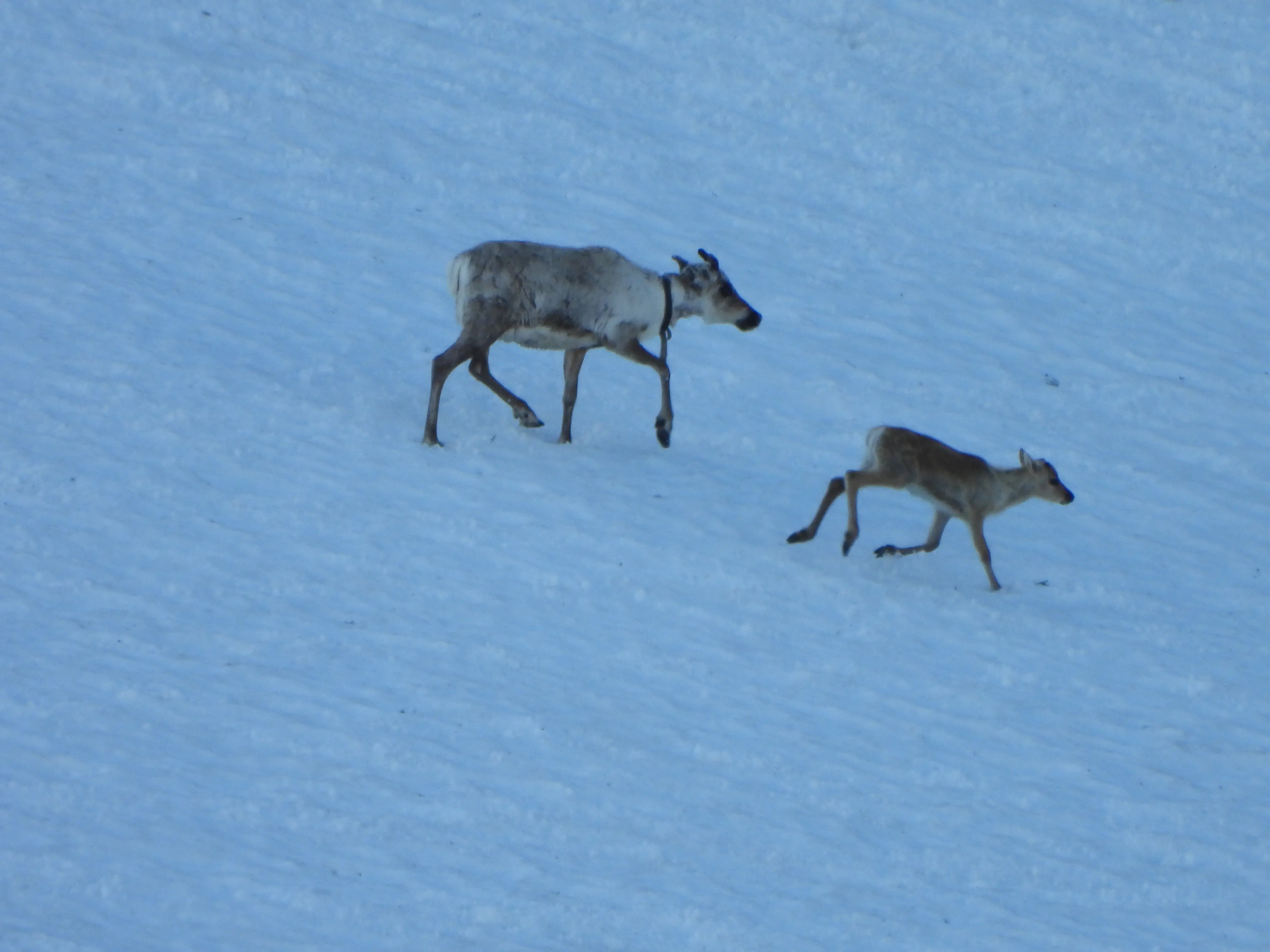 Op een gegeven moment besluiten we maar door te rijden, aangezien het er wel heel veel zijn. We maken een grote klim naar het topje van de berg die 400 meter hoog is. Waar we genieten van het uitzicht en dan opeens komen er vanuit de verte weer een heleboel rendieren aanlopen die allemaal dezelfde kant op gaan. Sommige door de sneeuw waarbij de jonge dieren rare capriolen uithalen. Ook daar blijven we vol verbazing kijken.