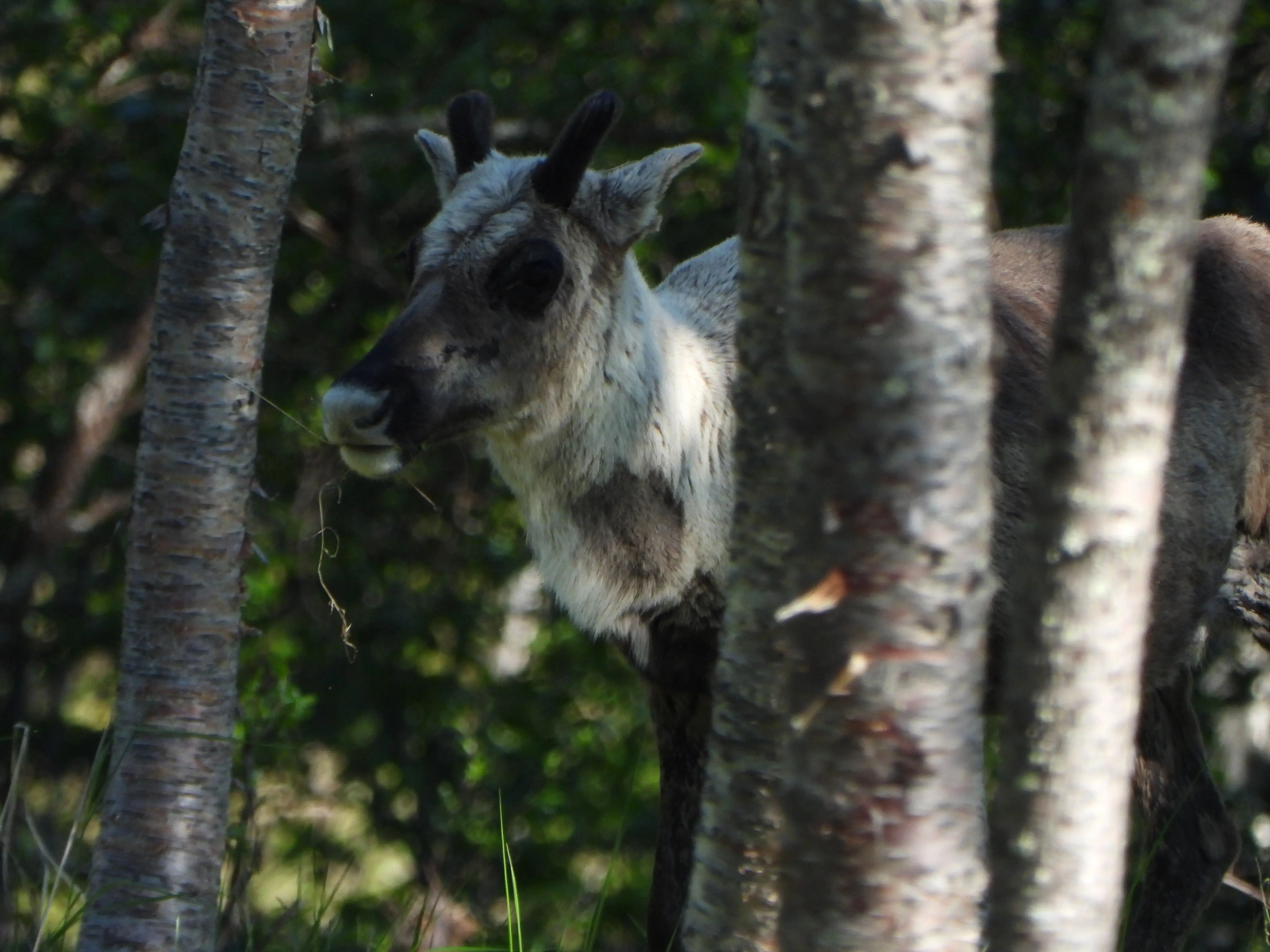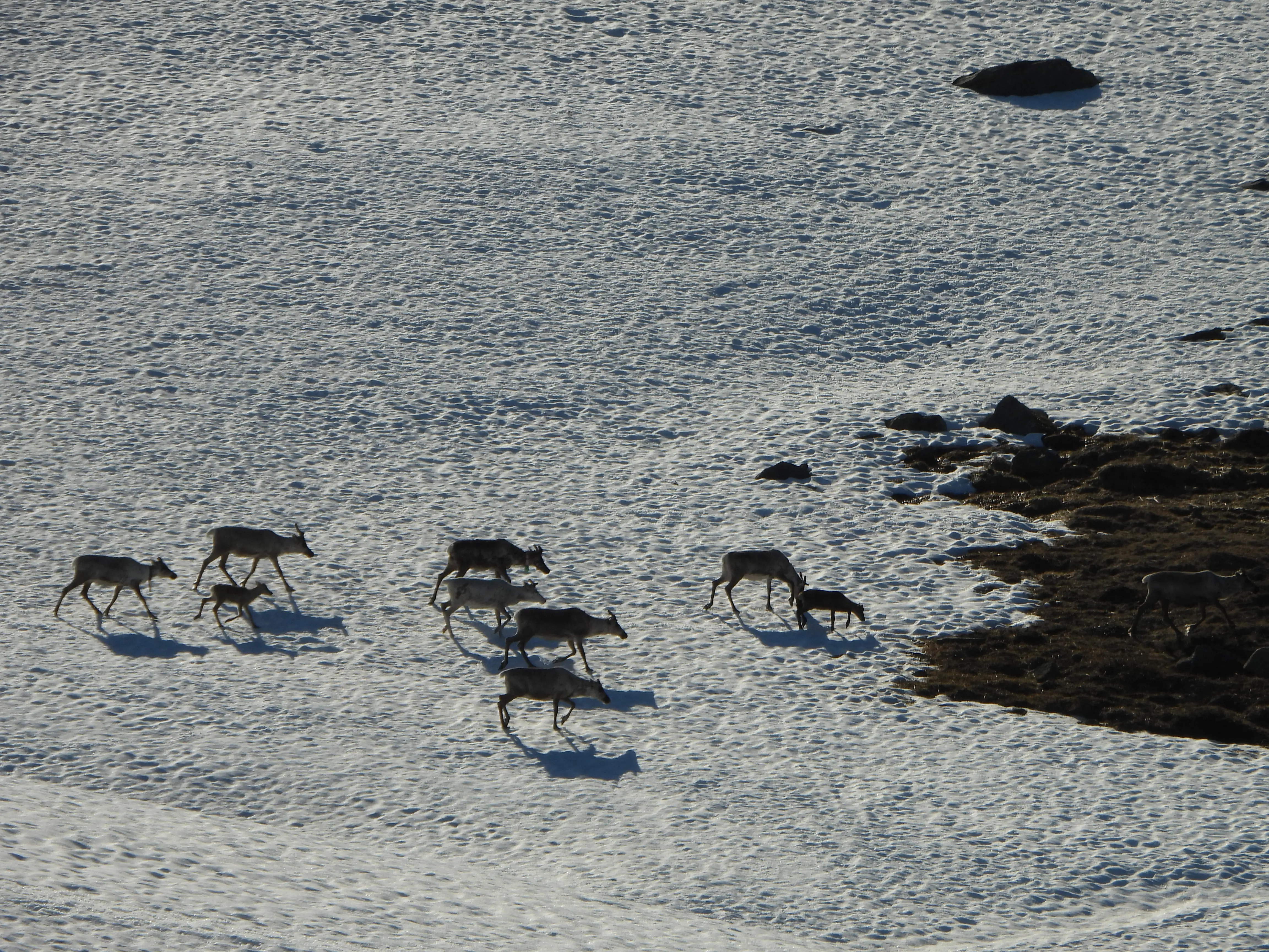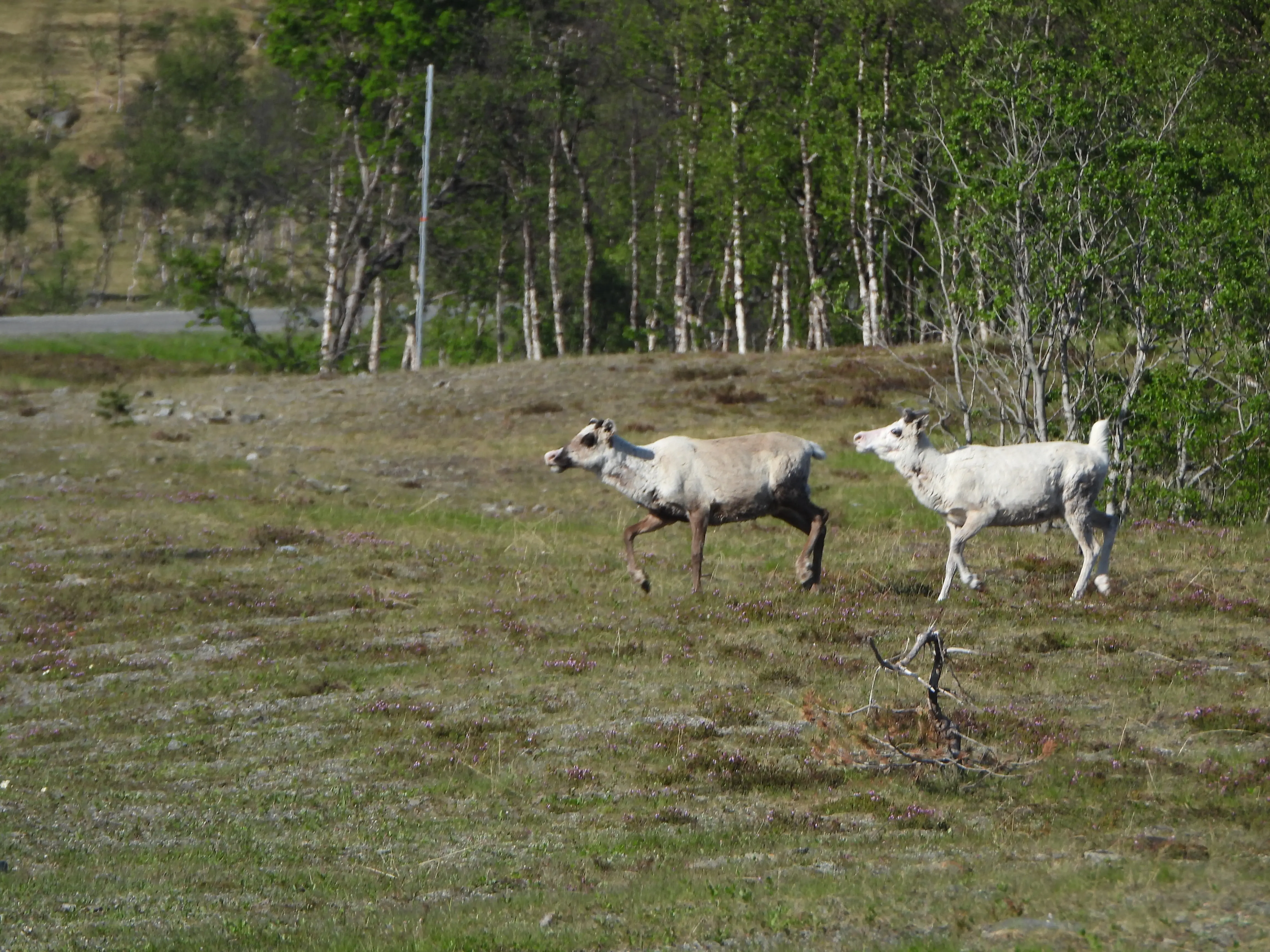 Op een gegeven moment besluiten we maar door te rijden, aangezien het er wel heel veel zijn. We maken een grote klim naar het topje van de berg die 400 meter hoog is. Waar we genieten van het uitzicht en dan opeens komen er vanuit de verte weer een heleboel rendieren aanlopen die allemaal dezelfde kant op gaan. Sommige door de sneeuw waarbij de jonge dieren rare capriolen uithalen. Ook daar blijven we vol verbazing kijken.