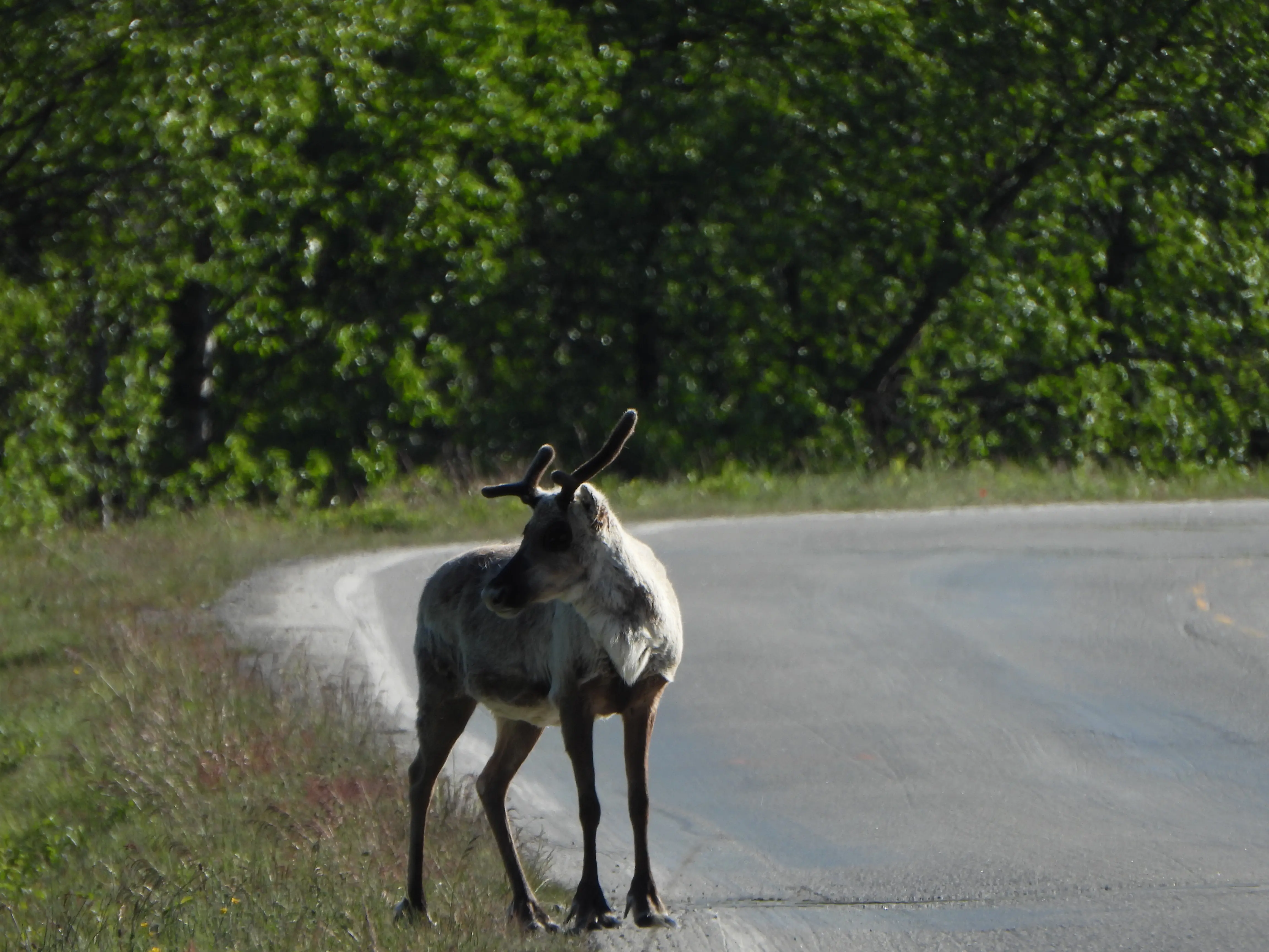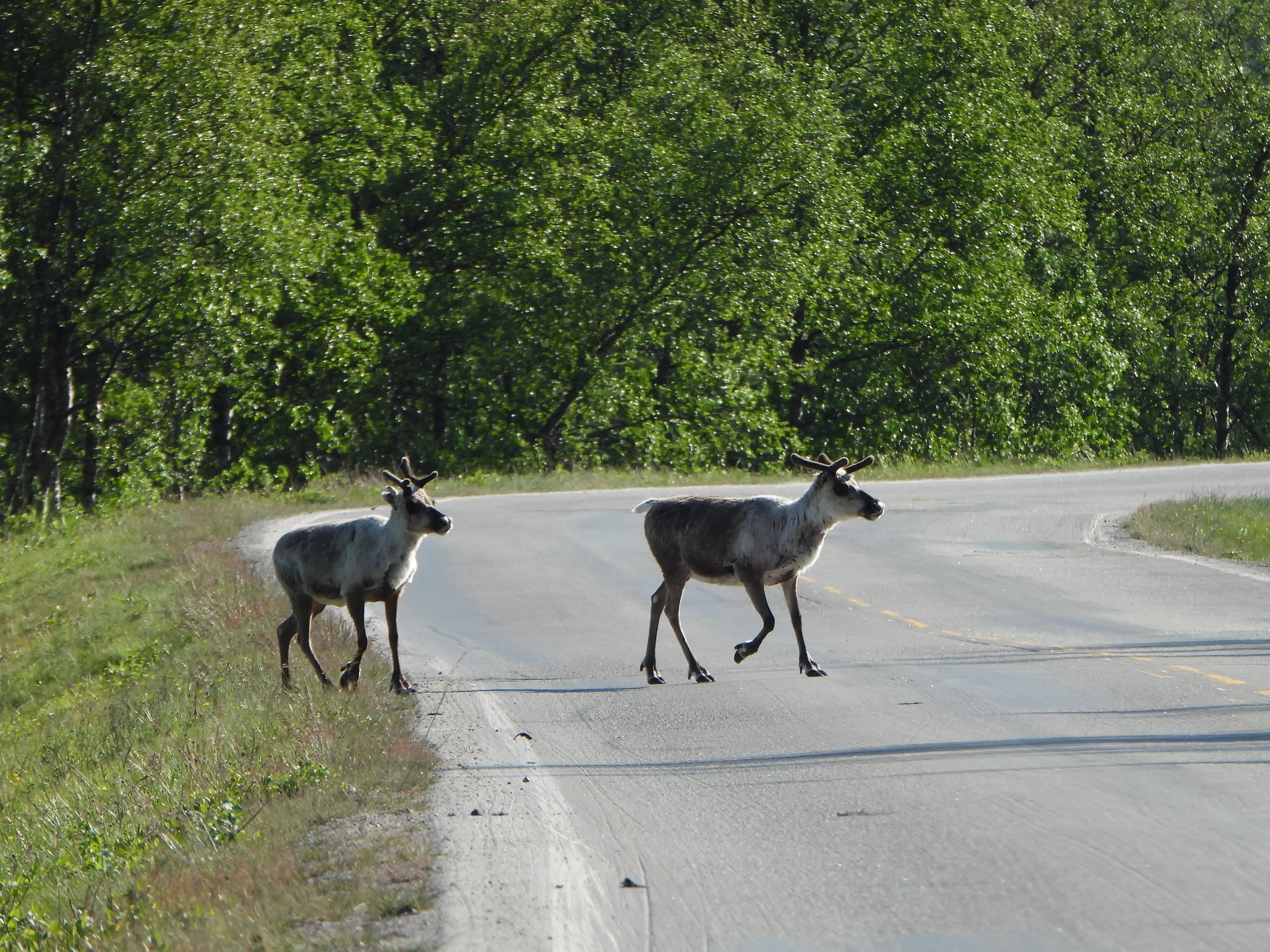 Al snel rijden we weer door na een tijdje gaat Rob vol in de remmen hij heeft wat gezien, terwijl we allemaal kijken zien we een paar rendieren staan. De camera’s worden snel gepakt en we kunnen en hele hoop foto’s maken want ze blijven maar komen. Ze lopen rondom ons heen om de weg over te steken, wat een mooie dieren zijn het toch. Een aantal van de Rendieren heeft een halsband om met een soort bel, Terwijl anderen een nummer op hun vacht hebben staan.