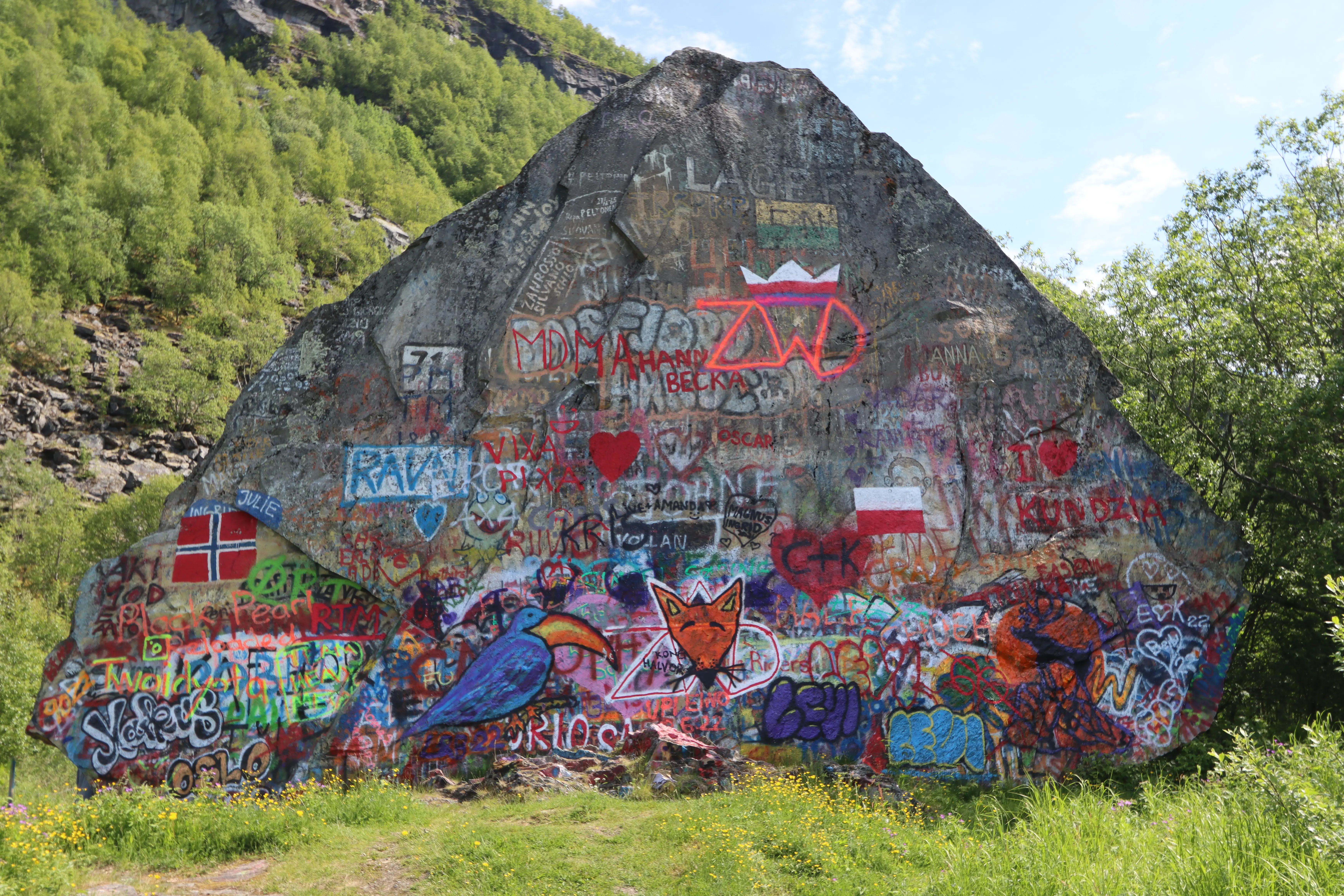 De volgende stop is bij een bijzondere steen, de Piggsteinen een steen waar mensen van oudsher hun naam opschreven als ze van Noord naar Zuid reisden. Tegenwoordig gebruikt men daarvoor spuitbussen verf. Duizenden namen hebben een hele dikke laag gevormd.