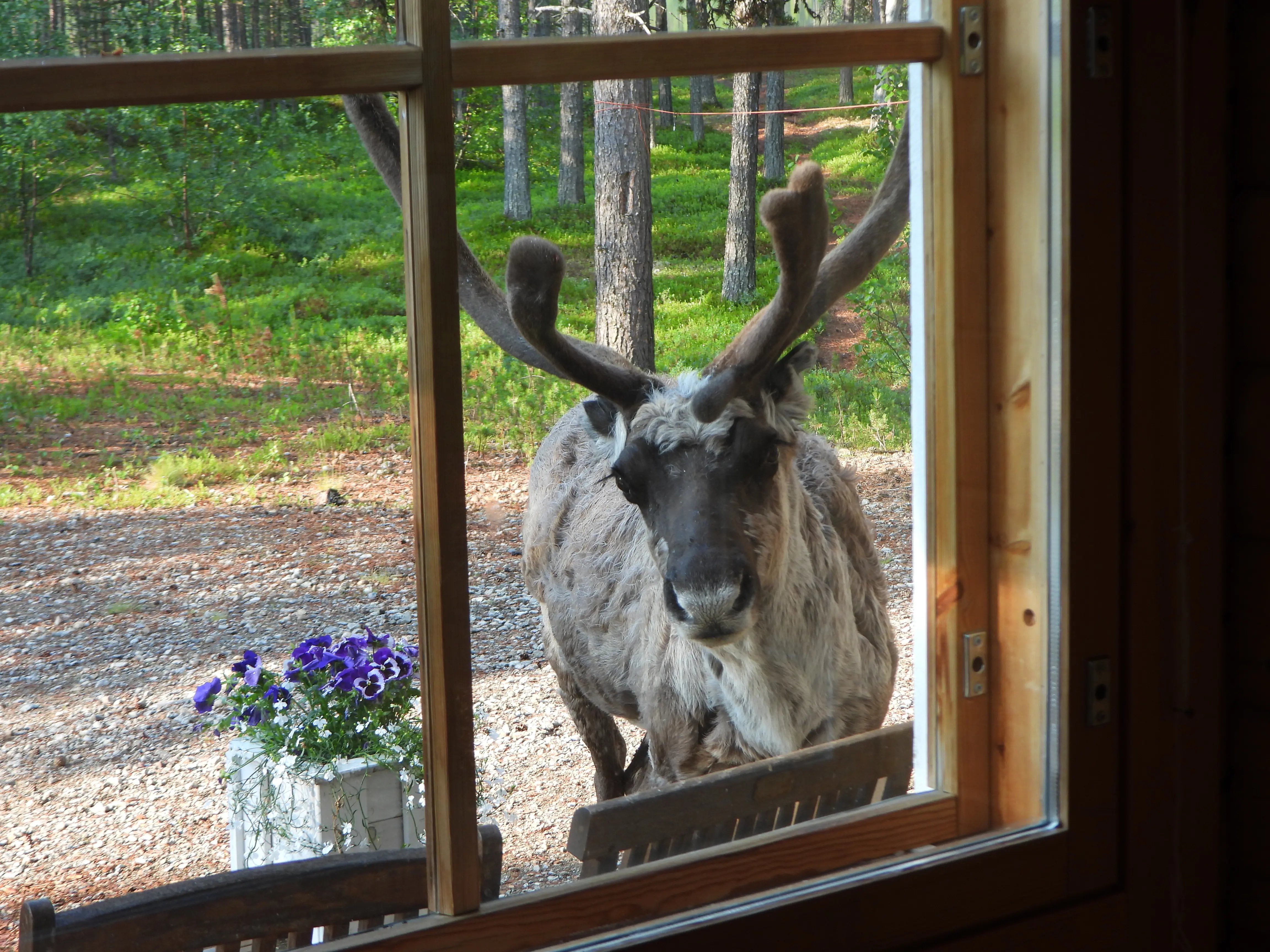 Vandaag staan we weer op tijd op, Peter bakt de bacon en eieren zodat we lekker kunnen smullen voordat we weggaan. Als we aan het inpakken zijn staat er ineens een Rendier door ons raam te gluren.