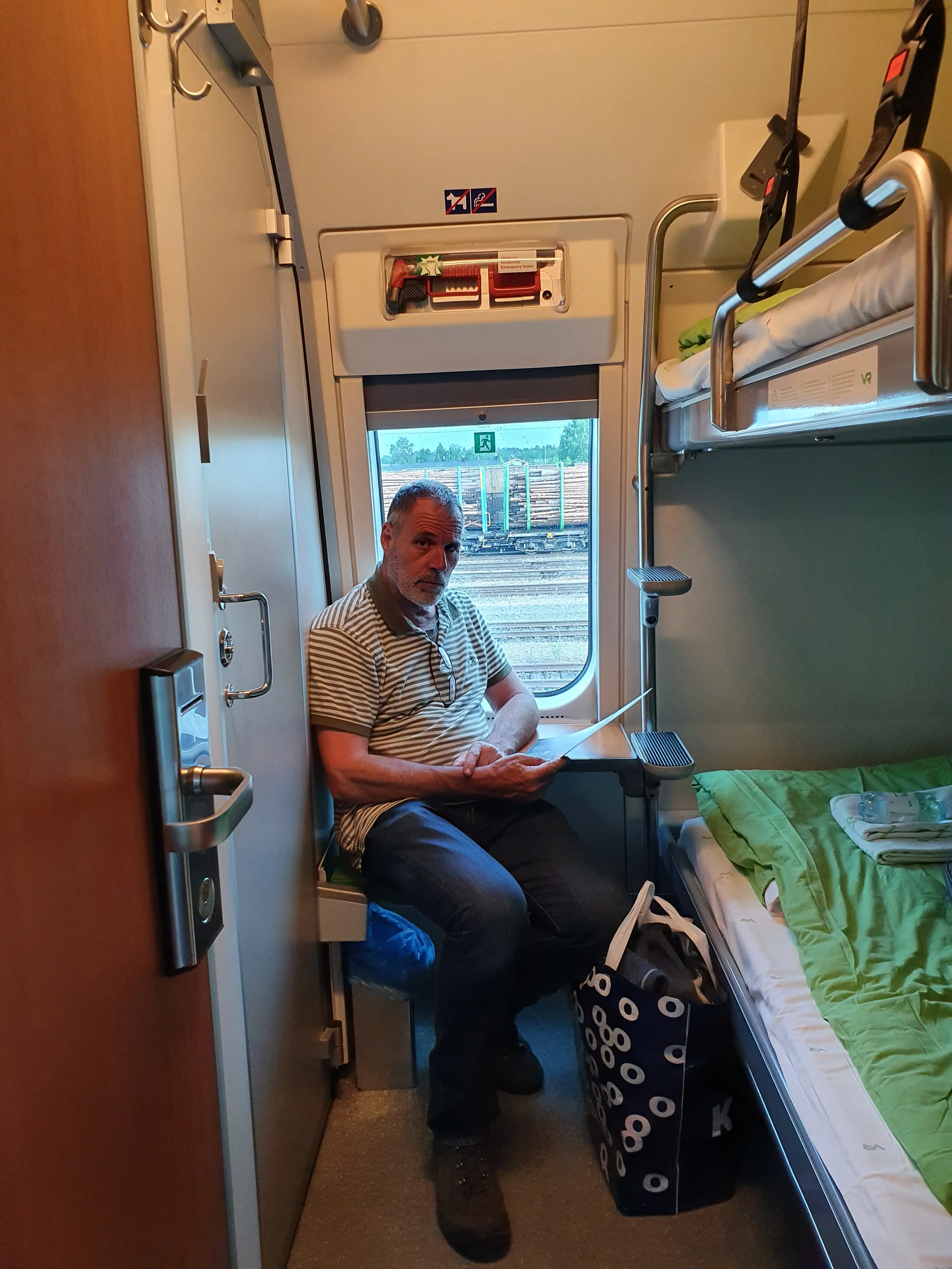 We laten Rob achter met de auto want hij is de enige die erin mag zitten als hij hem op de trein gaat rijden. Gelukkig loopt het allemaal voorspoedig en als snel kunnen we de trein in om onze coupe te vinden. Erg klein maar wel alles erin, 2 stapelbedden, een wastafel, wc en zelfs een douche. Je moet dan in de wc een stukje muur verplaatsen om te douchen, dat slaan we vanavond maar een keer over.