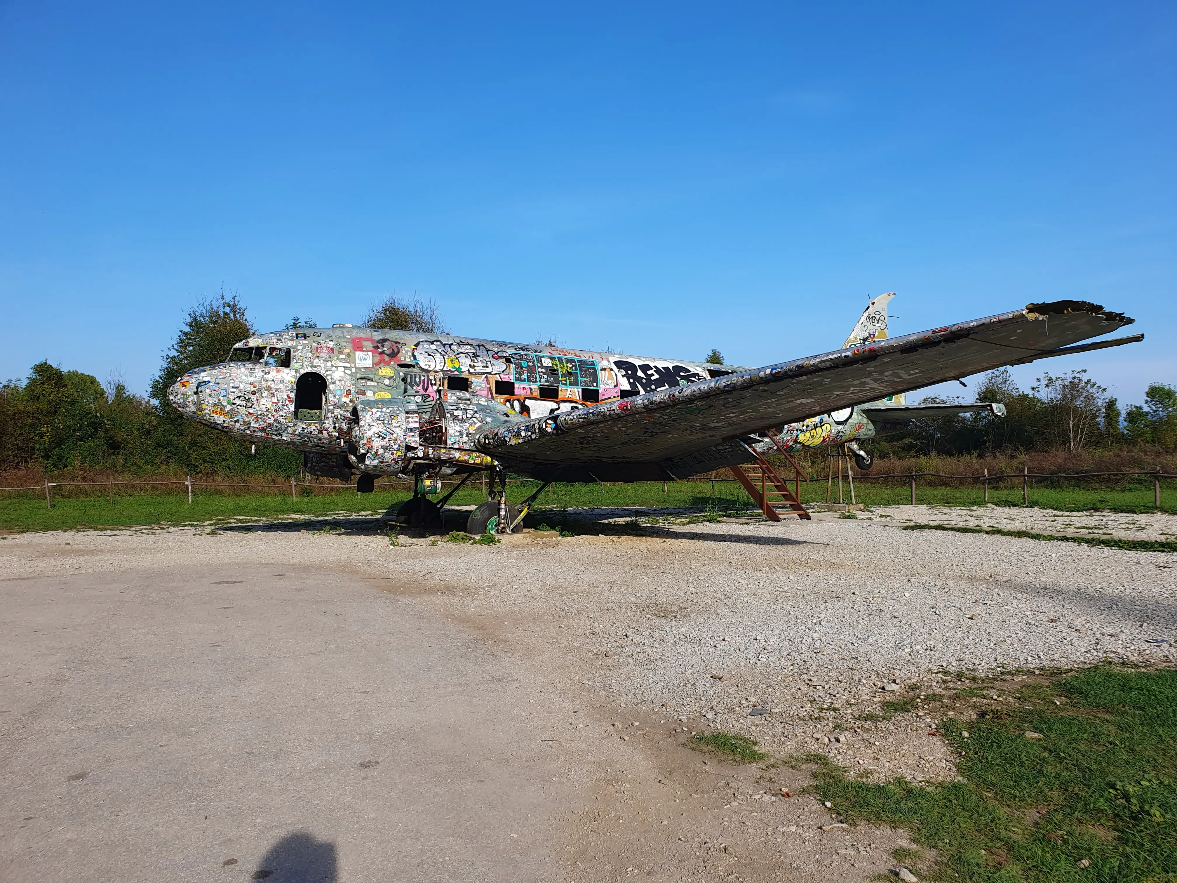 We schieten aardig op en onze laatste stop is ook een geocache maar dan bij een vliegtuig. Ik had er wat meer van verwacht maar het is toch mooi om te zien. We moeten even wachten totdat een groep motorrijders klaar is met poseren en dan kunnen wij ook foto’s maken.