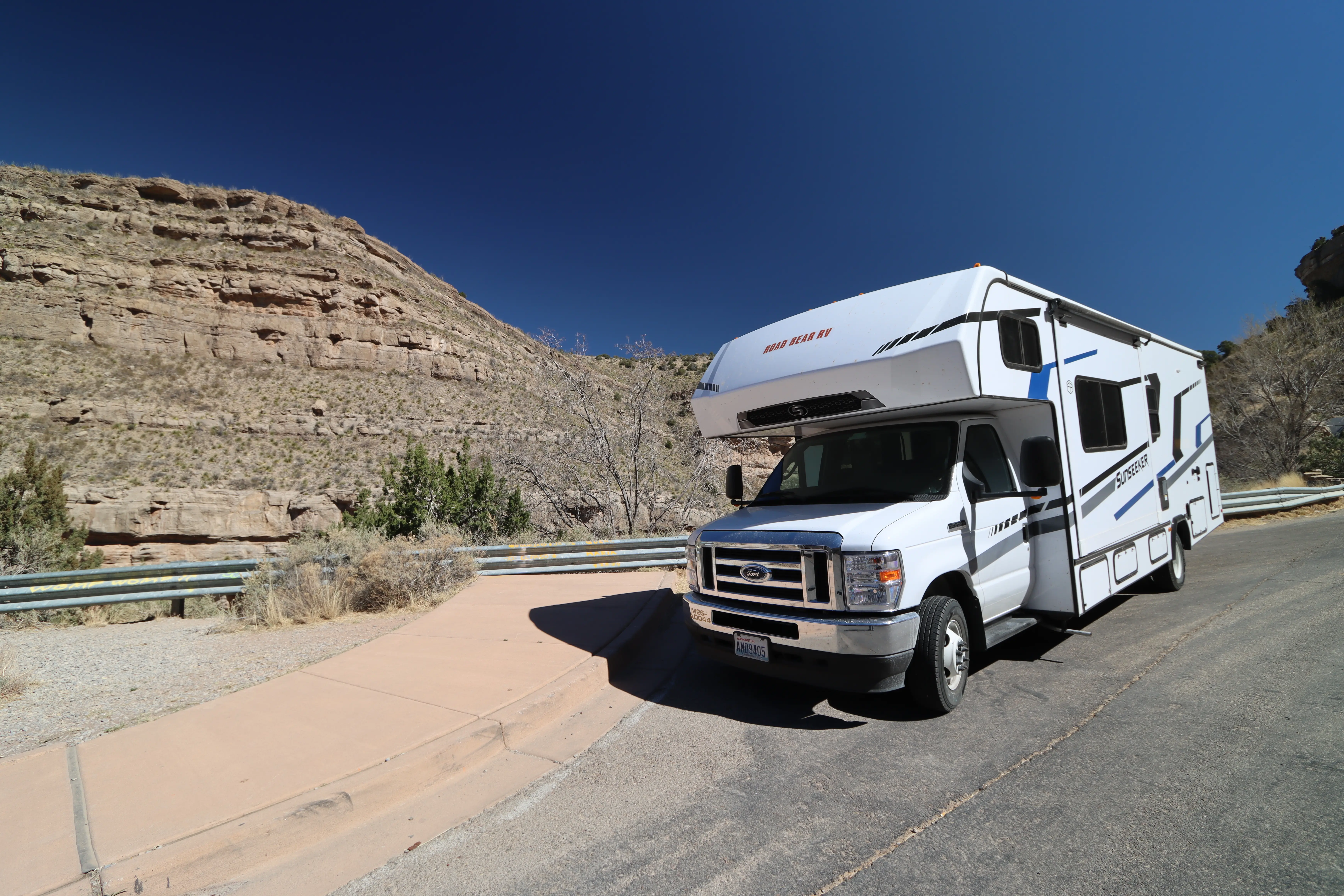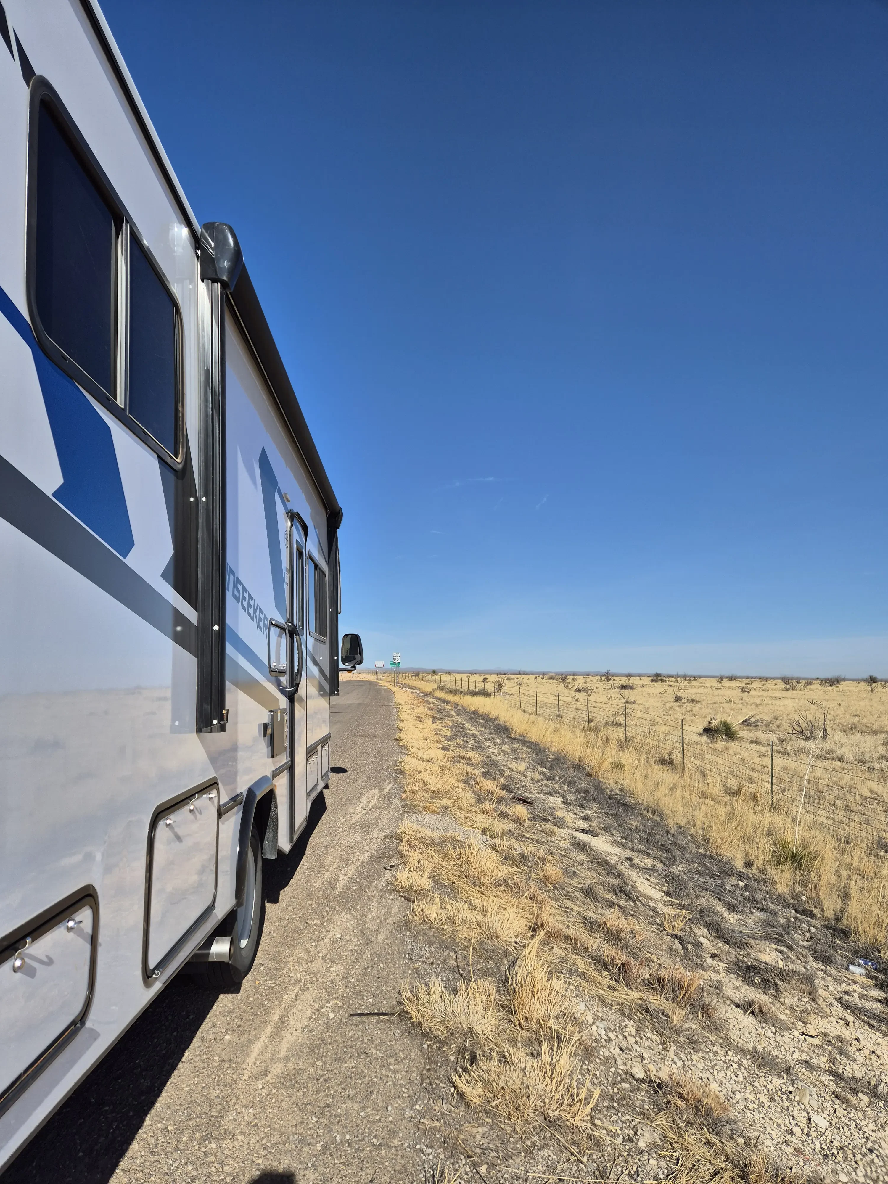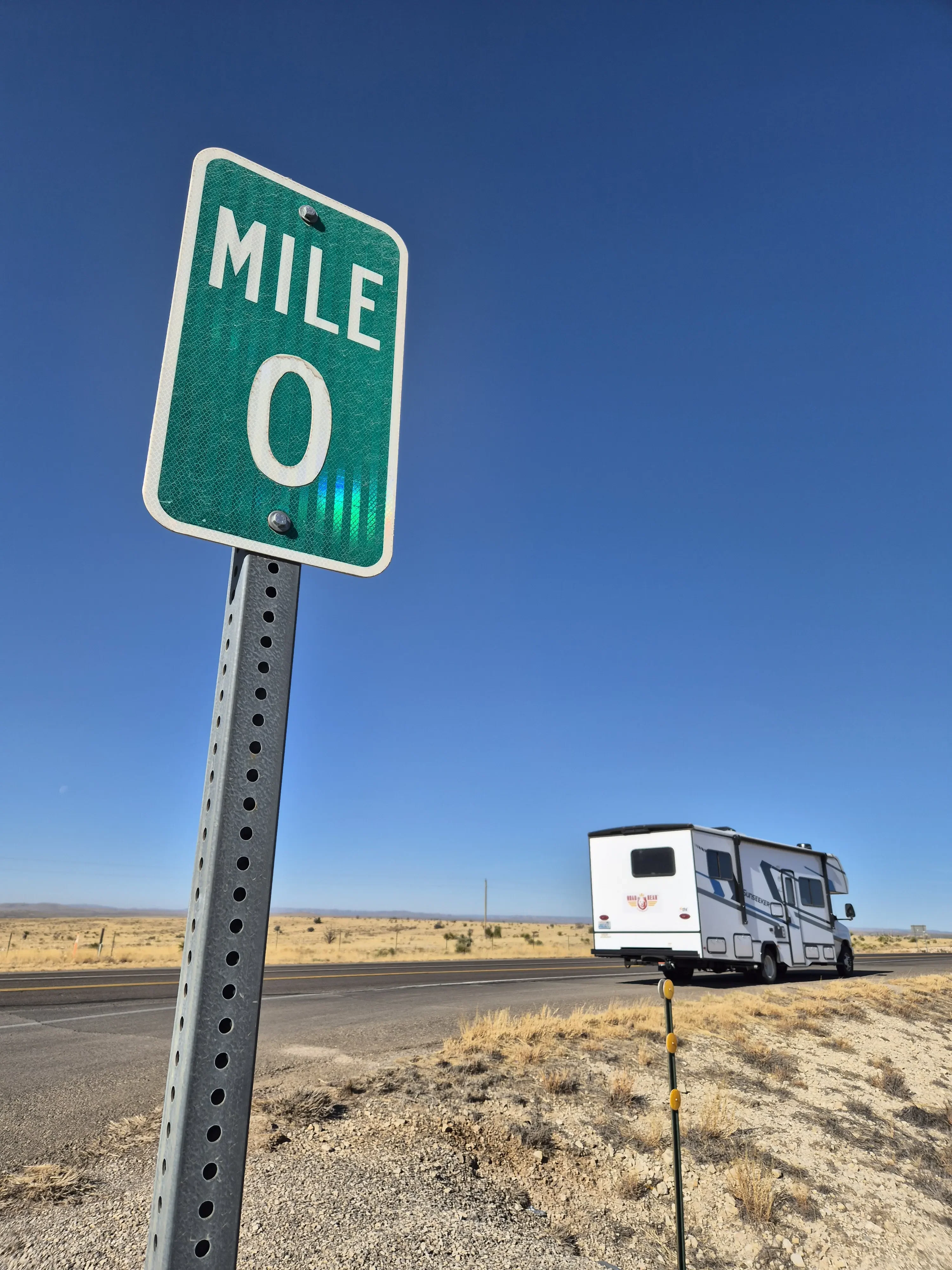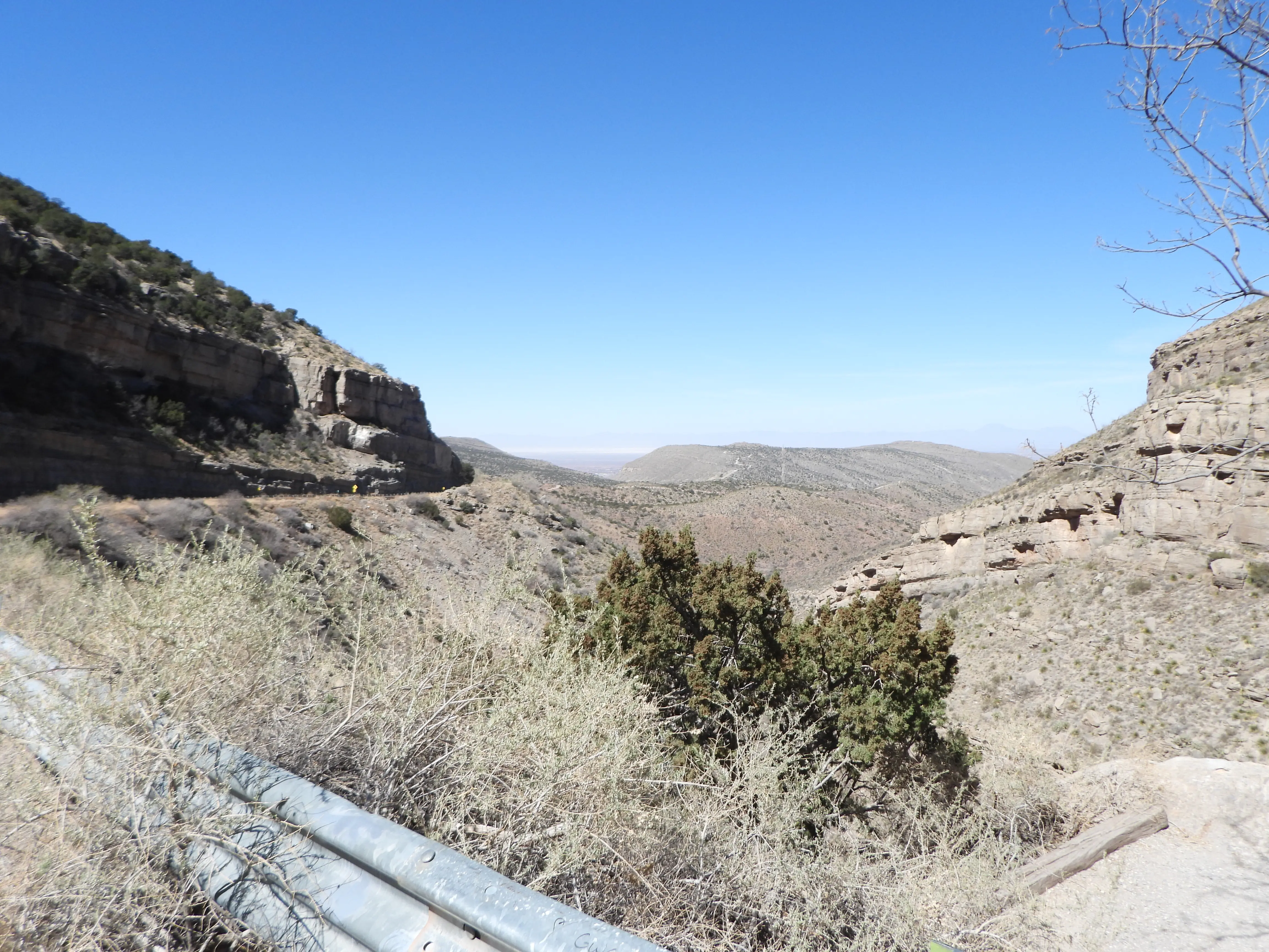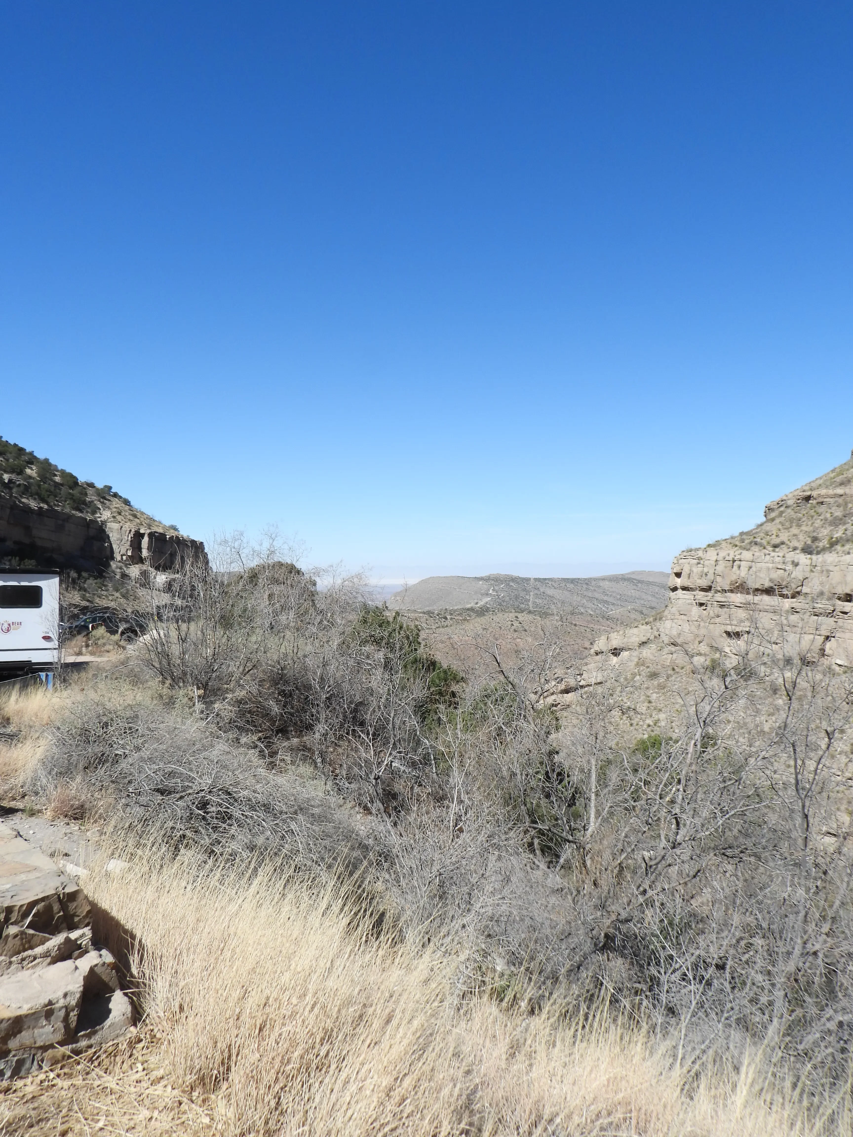 Vandaag worden we uitgerust wakker in een lekker warme camper we hebben de verwarming aan laten staan ivm de kou het zou hier nog rond het vriespunt kunnen zijn. Na een simpel ontbijtje gaan we de spullen opruimen en zijn we bij de waterslang de ijsbloemen op de grond staan. Na verder onderzoek blijkt de hele slang bevroren dus water bijvullen gaat het niet worden. Gelukkig hadden we gisteravond al iets bij gevuld dus zonder zitten we niet, toch wel handig om de wc te kunnen doortrekken onderweg. Als snel gaan we rijden een stukje terug over dezelfde weg als gisteren waar ineens een hoop politie langs de weg staat. Wij hebben er geen last van dus rijden lekker door. Na een aantal mijlen zien we een bord met daarop waarschuwingen dat truckers de remmen moeten controleren ivm met steile hellingen. Maar waar wij ook kijken die zien wij in de verste verte niet. We rijden door een heel leeg landschap een beetje woestijnachtig, met af en toe wat koeien.