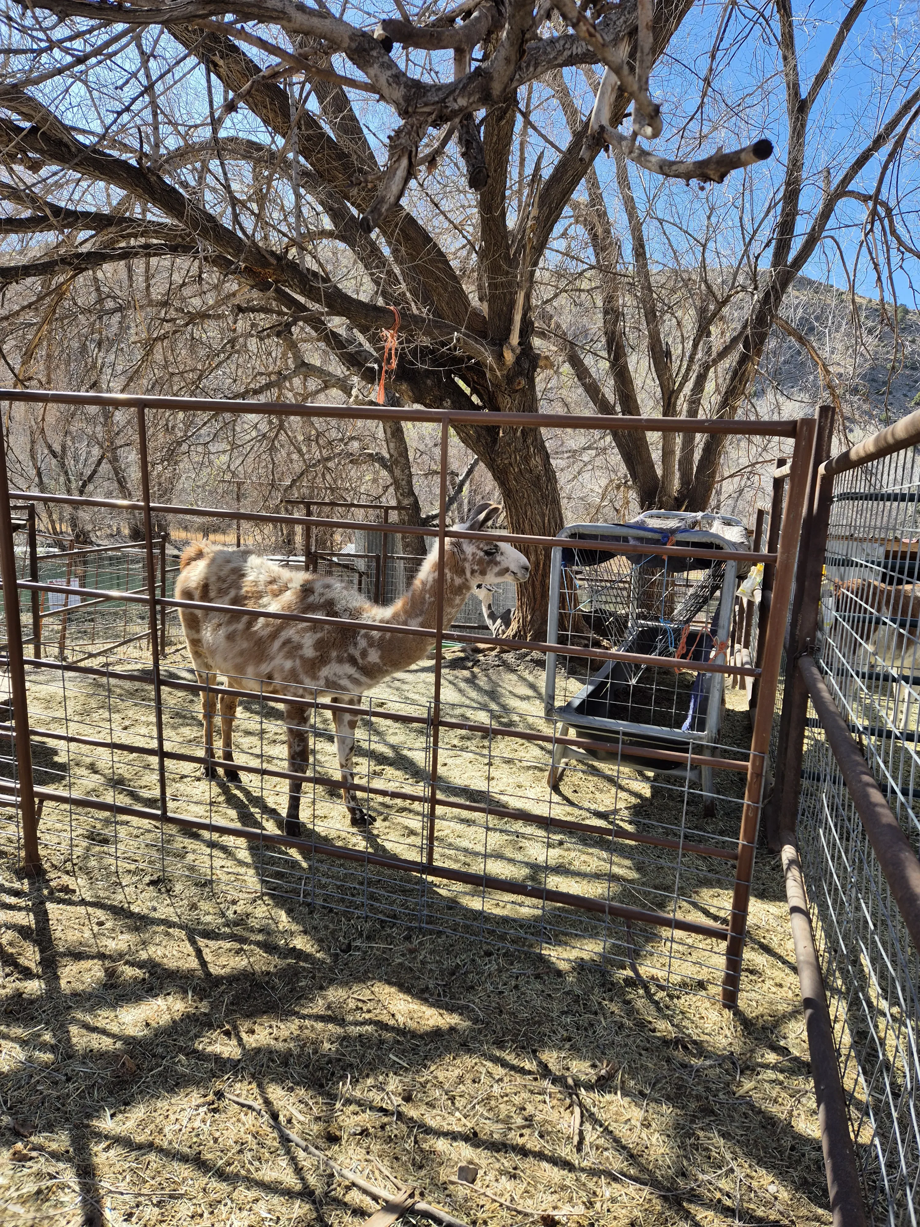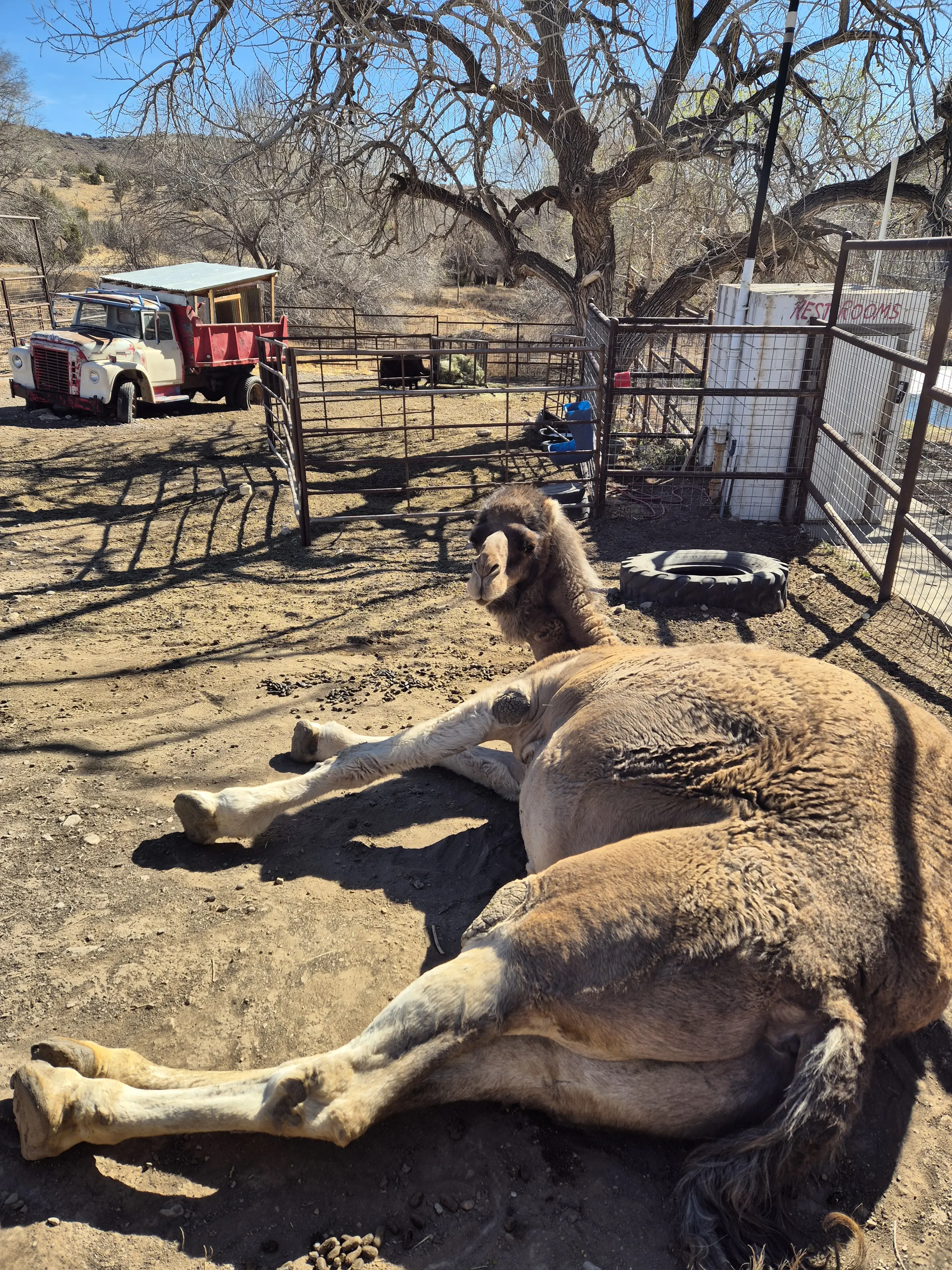 Aan de hand van geocaches kijk ik verder op de route en zie een leuke stop waar je verse appelsap en nog veel meer spullen kunt kopen. We besluiten om daar te stoppen, maken een praatje met een oude meneer die heel in de verte ook familie uit Nederland heeft. Op zoek naar de geocache zie we een hele grote dikke kameel, nog wat lama’s, geiten, kippen en konijnen.