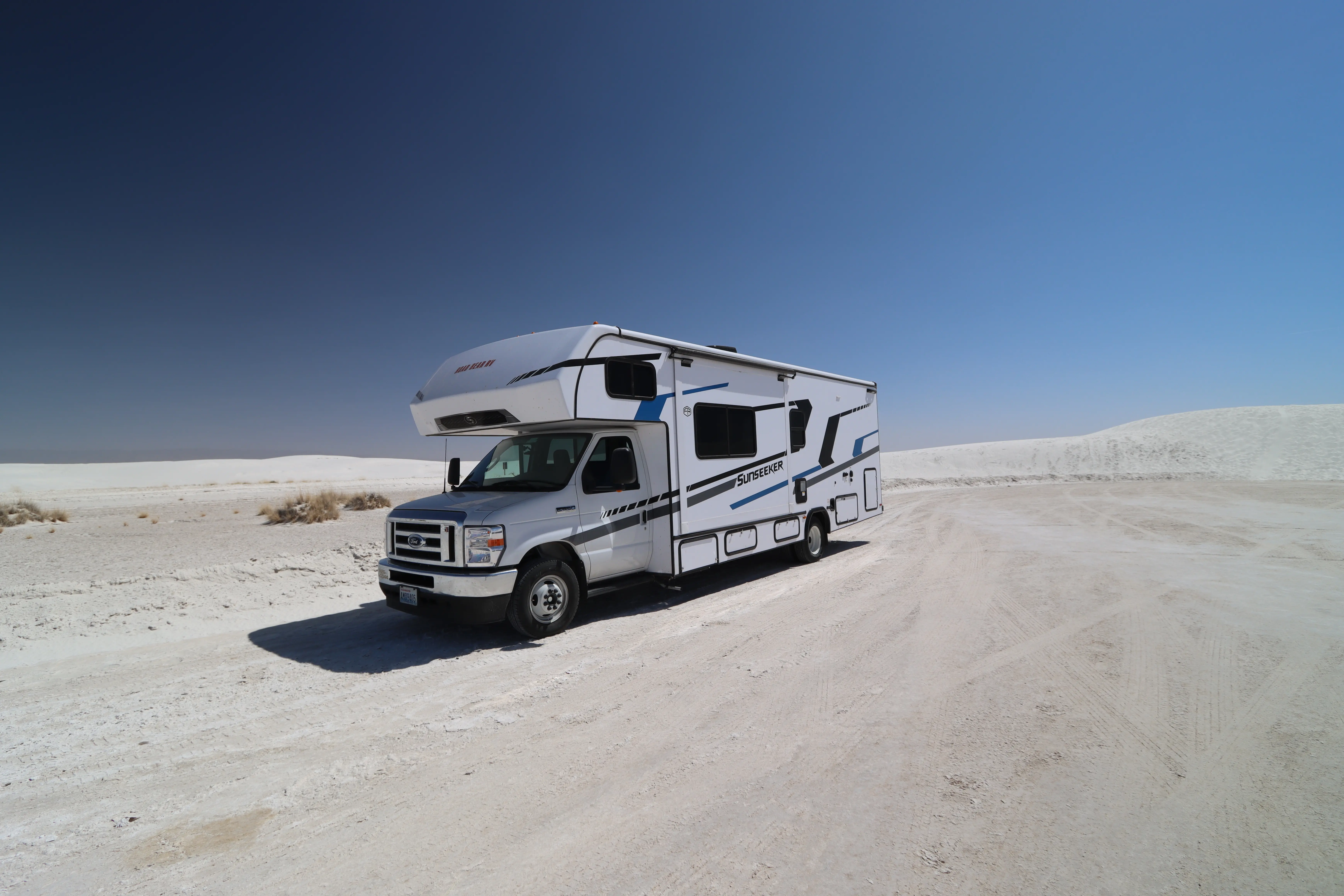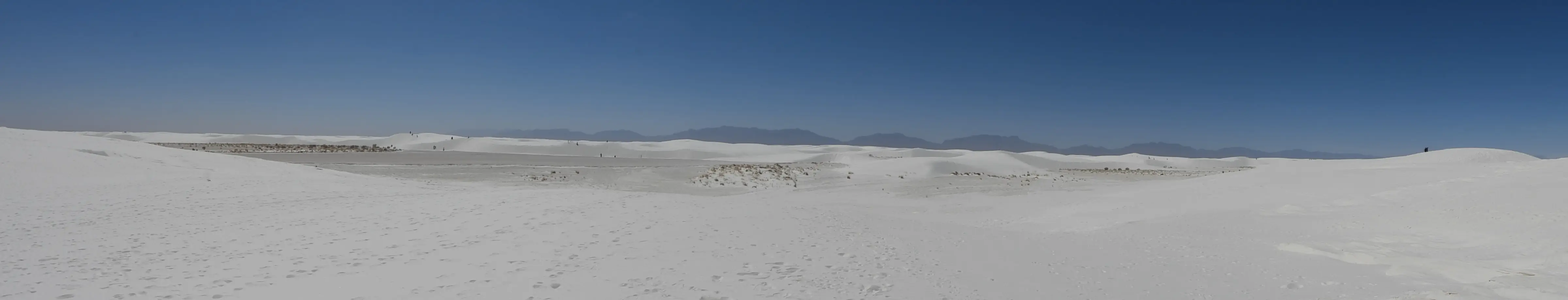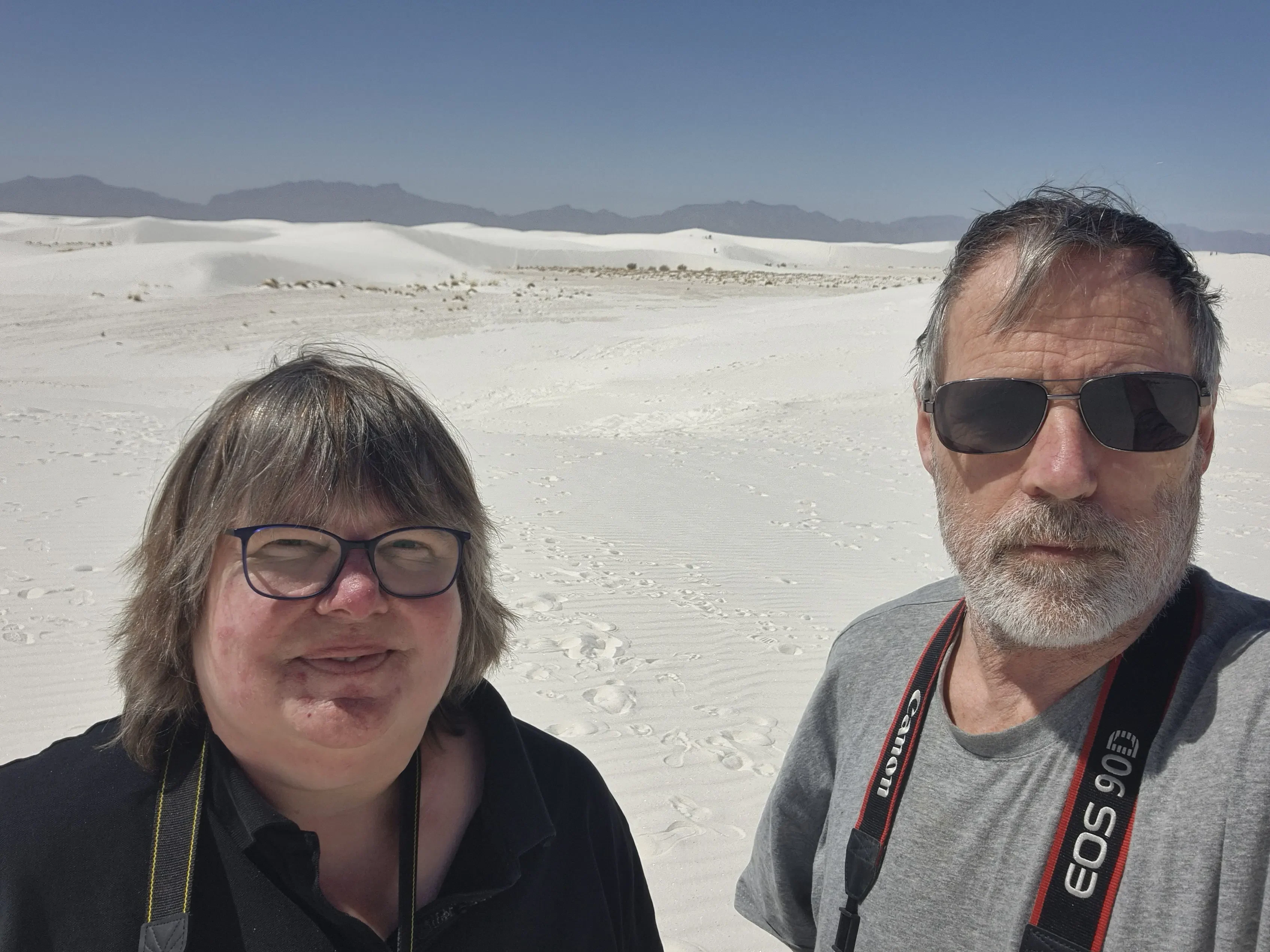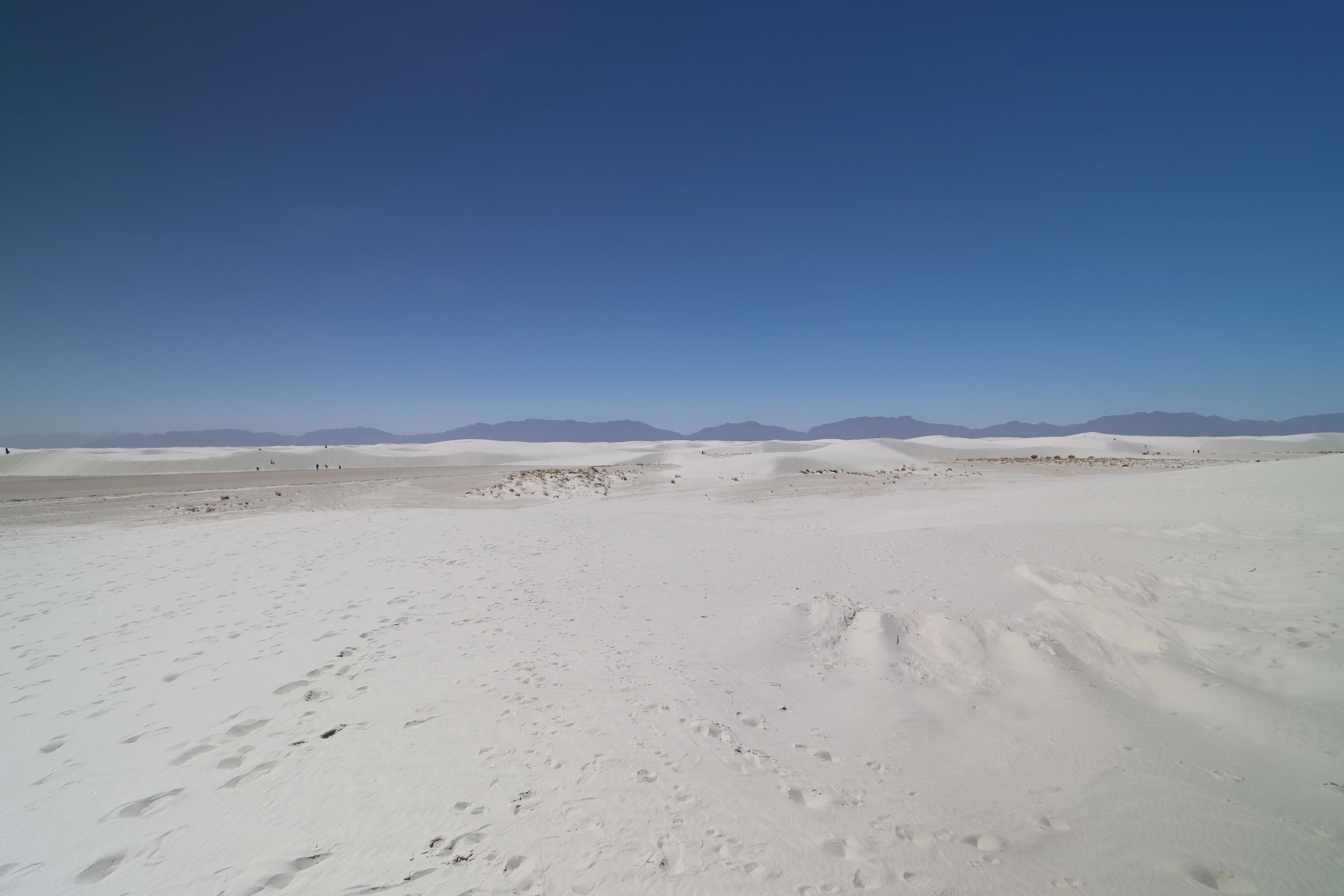 Als we de bergen uitrijden zie je een hele grote vlakte, zo ver als je kunt kijken. Onze volgende stop is White Sands National Park. Zoals ik al gelezen had op facebook is het daar erg druk, we stonden al meteen in de rij om het park in te rijden en alle parkeerplaatsen stonden vol met auto’s. Ook alle plekjes waar een picnic tafel staat zijn vol, overal zie je kinderen met sleetjes van de duinen afglijden. Ergens halverwege is nog een plekje vrij en gaan wij even lekker lunchen. Daarna proberen we een wat rustiger plekje te zoeken waar we even kunnen lopen maar waar je ook kijkt overal zijn mensen. Na een kleine wandeling en het maken van een paar foto’s houden we het voor gezien.