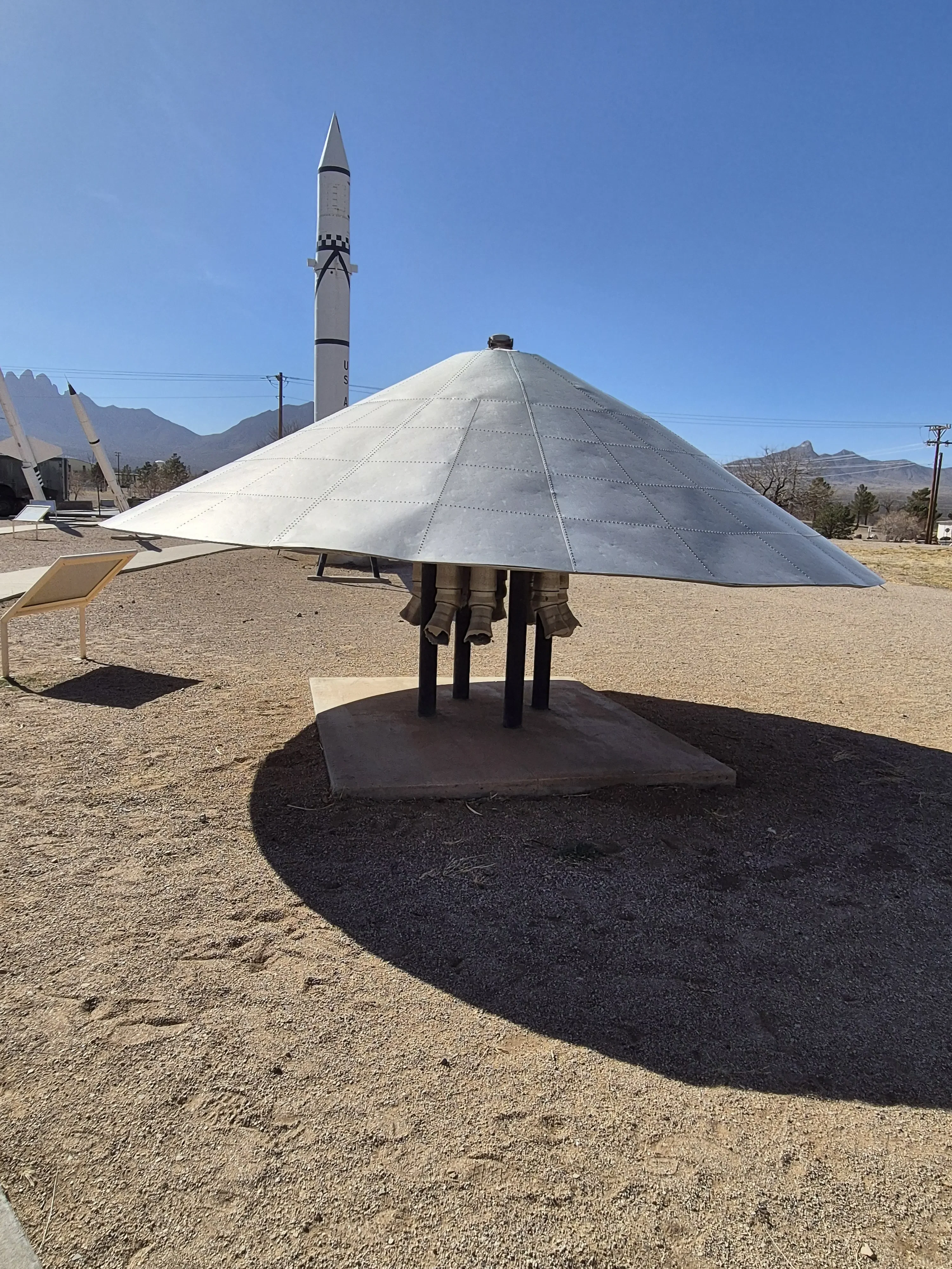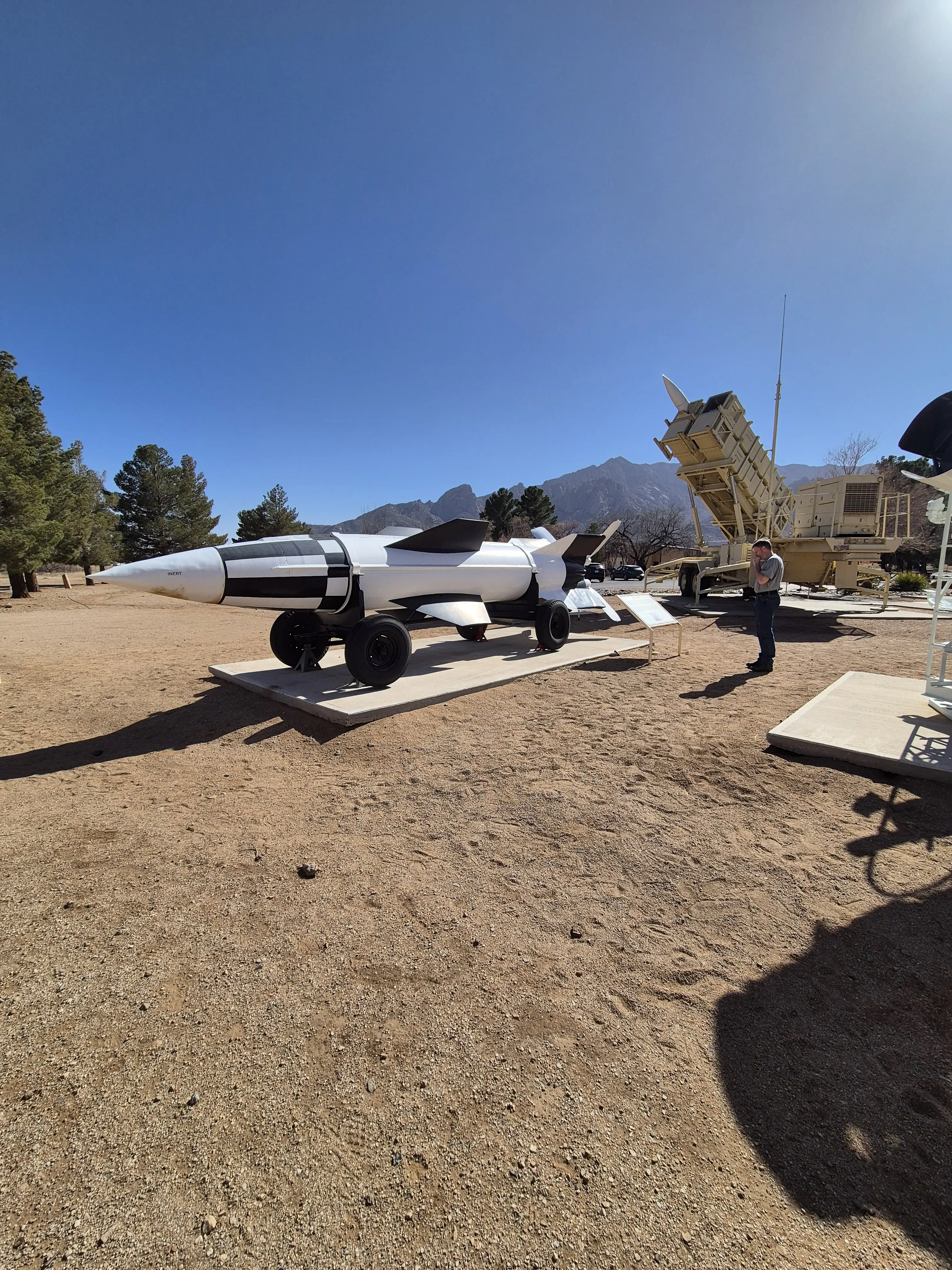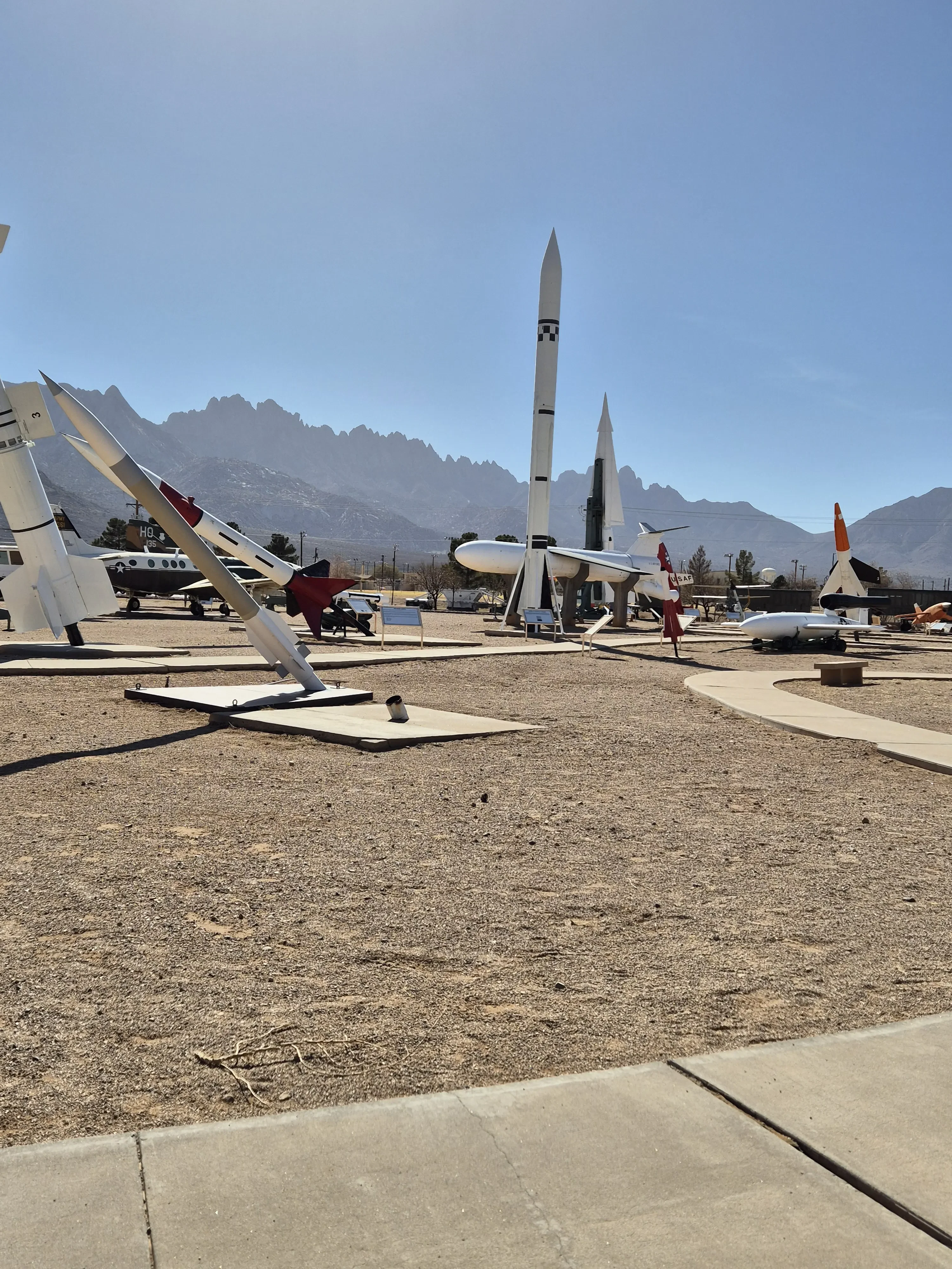 Aangezien de plannen in mijn route veranderd zijn besluiten we om naar, het White Sands Missile Range Museum te gaan. Dit is een museum die op een legerbasis ligt, ik had daarover gelezen, en nu past het erin dus we gaan op weg. Daar aangekomen is het ook redelijk druk en waar moeten we nu heen geen idee, we sluiten maar aan in de rij auto’s. De verkeerde rij uiteindelijk draaien is geen optie dus we mogen doorrijden en een U-turn maken om daarna na nog een U-turn in de goede rij te gaan staan, dachten we. Toch maar even vragen hoe of wat in het Visitor Center en wat blijkt wij mogen met de camper helemaal niet het terrein op maar moeten ervoor parkeren, daarna daarbinnen met je paspoort een dagpas aanvragen om dan lopend het terrein op te gaan. Dus ik naar buiten Rob was inmiddels flink opgeschoten en die moest dus nu in zijn achteruit om weer uit de rij te komen. De meneer erachter moest ook even terug maar het lukte, de Camper geparkeerd en terug naar het visitor center. Daar moet je een heel formulier invullen wat je komt doen, waar je vandaan komt, waar je naar toe gaat, waar je woont, paspoort nummer en nog veel meer. Na het maken van een foto wordt er een papier uitgeprint met die foto erop en mag je door. Wat een gedoe zeg maar wel een leuke ervaring.