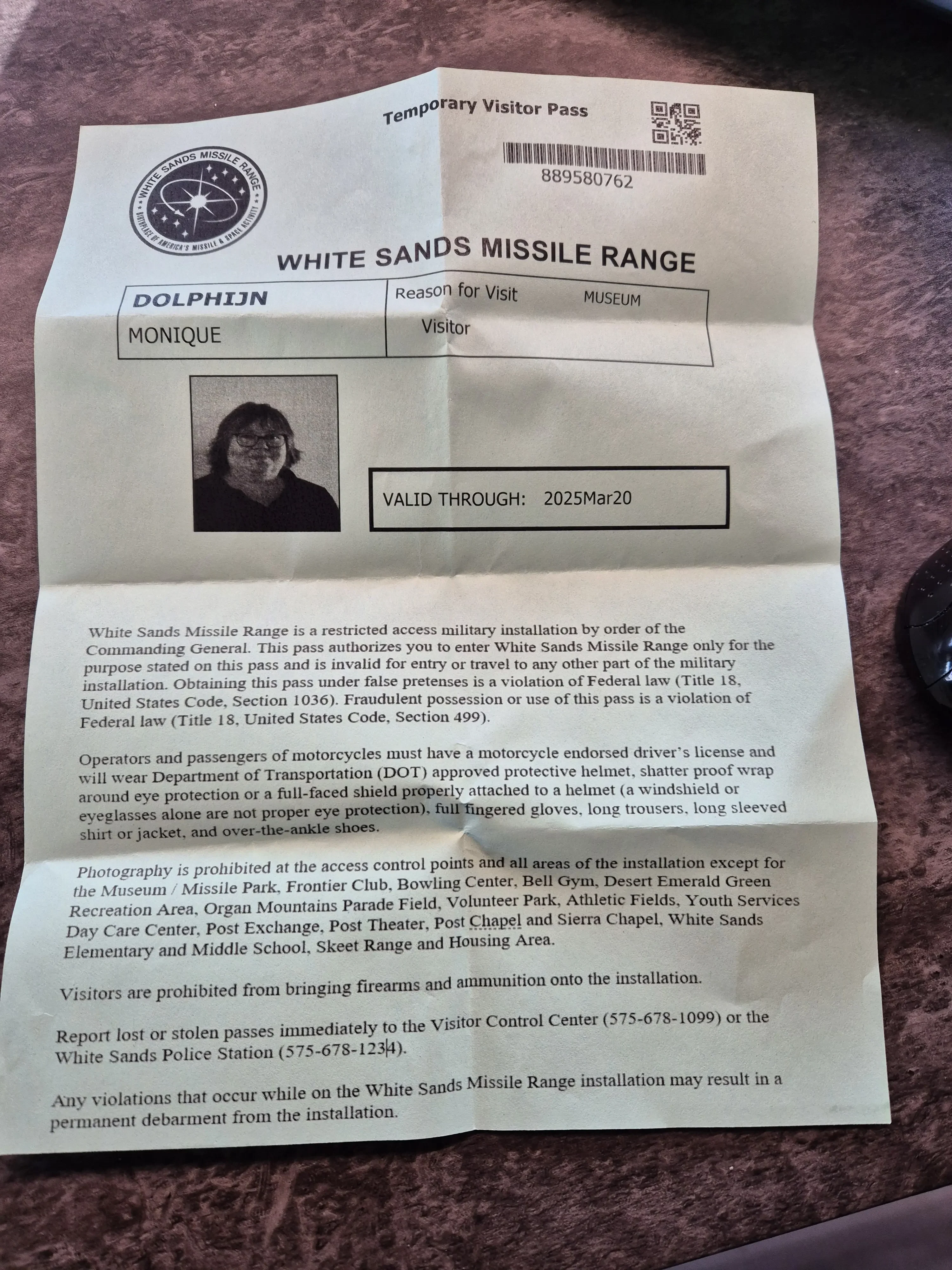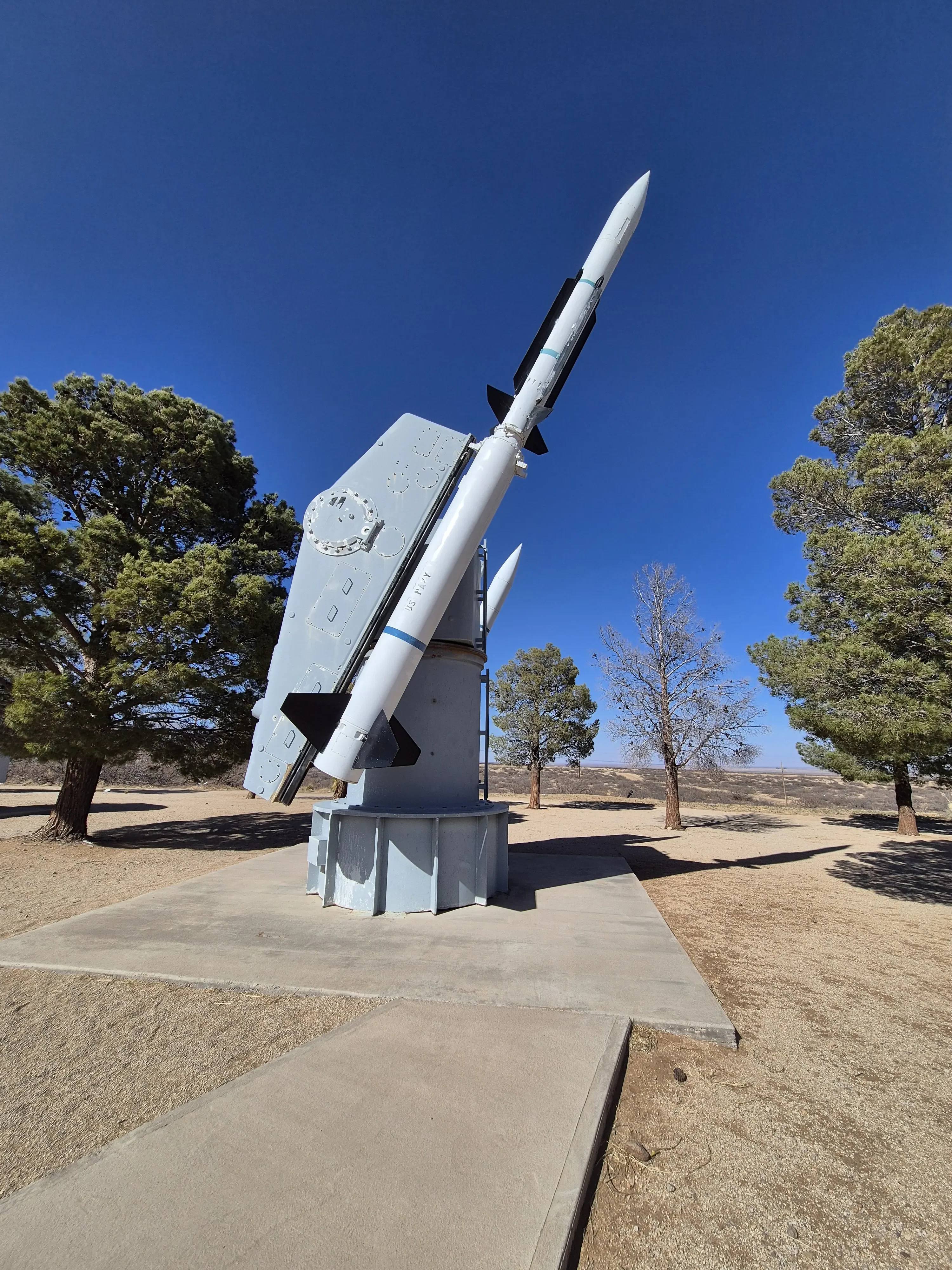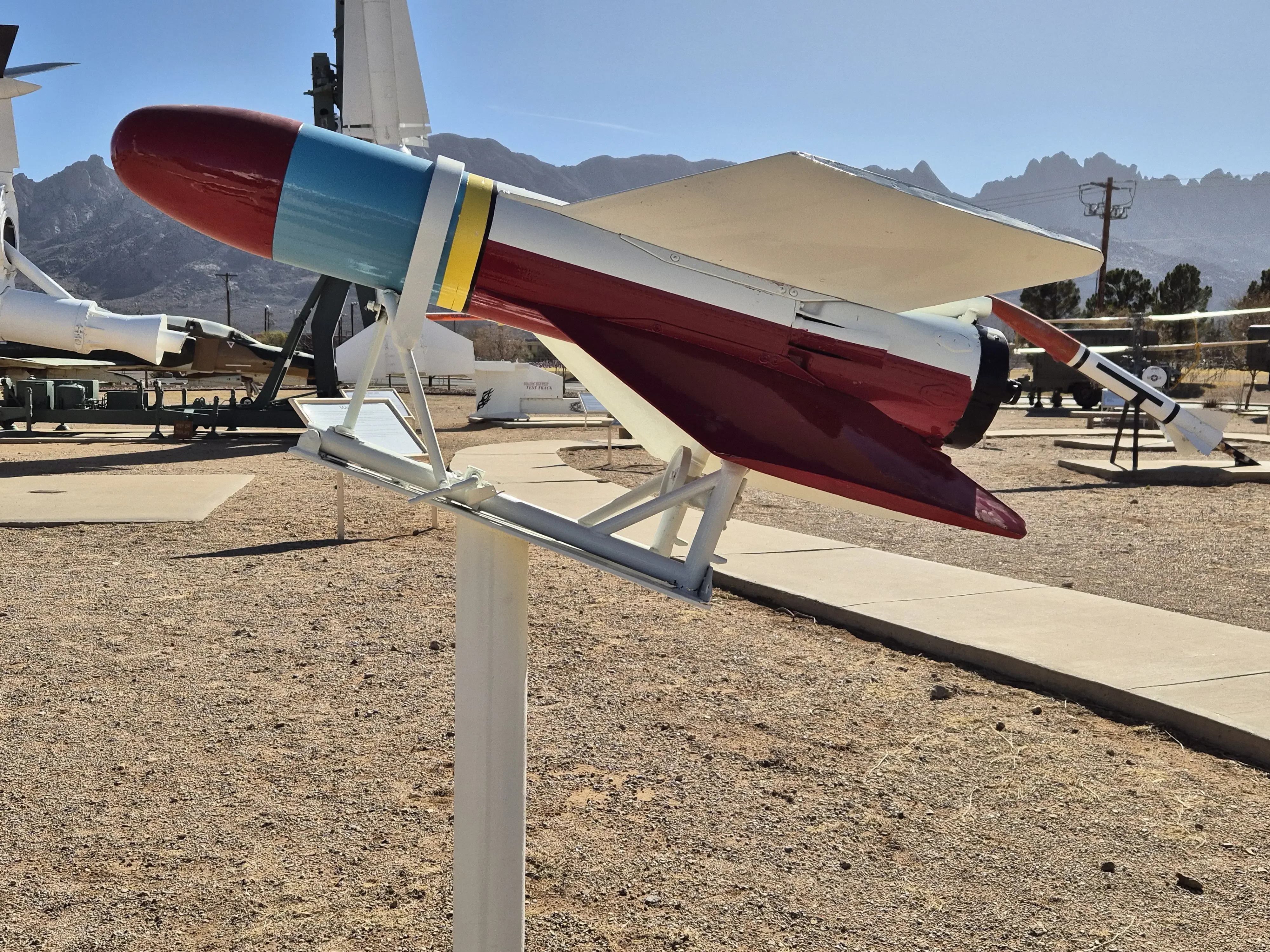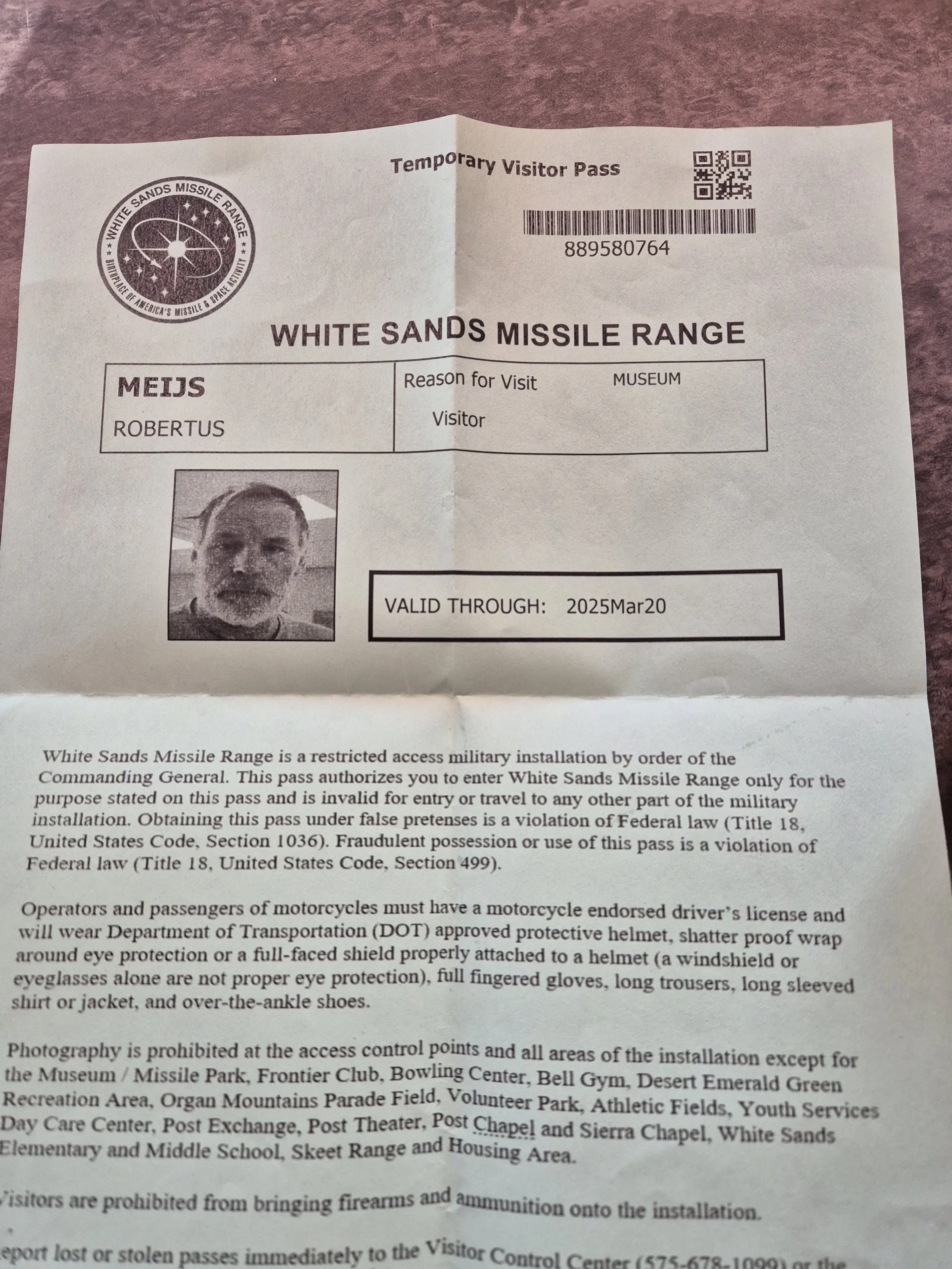 Aangezien de plannen in mijn route veranderd zijn besluiten we om naar, het White Sands Missile Range Museum te gaan. Dit is een museum die op een legerbasis ligt, ik had daarover gelezen, en nu past het erin dus we gaan op weg. Daar aangekomen is het ook redelijk druk en waar moeten we nu heen geen idee, we sluiten maar aan in de rij auto’s. De verkeerde rij uiteindelijk draaien is geen optie dus we mogen doorrijden en een U-turn maken om daarna na nog een U-turn in de goede rij te gaan staan, dachten we. Toch maar even vragen hoe of wat in het Visitor Center en wat blijkt wij mogen met de camper helemaal niet het terrein op maar moeten ervoor parkeren, daarna daarbinnen met je paspoort een dagpas aanvragen om dan lopend het terrein op te gaan. Dus ik naar buiten Rob was inmiddels flink opgeschoten en die moest dus nu in zijn achteruit om weer uit de rij te komen. De meneer erachter moest ook even terug maar het lukte, de Camper geparkeerd en terug naar het visitor center. Daar moet je een heel formulier invullen wat je komt doen, waar je vandaan komt, waar je naar toe gaat, waar je woont, paspoort nummer en nog veel meer. Na het maken van een foto wordt er een papier uitgeprint met die foto erop en mag je door. Wat een gedoe zeg maar wel een leuke ervaring.