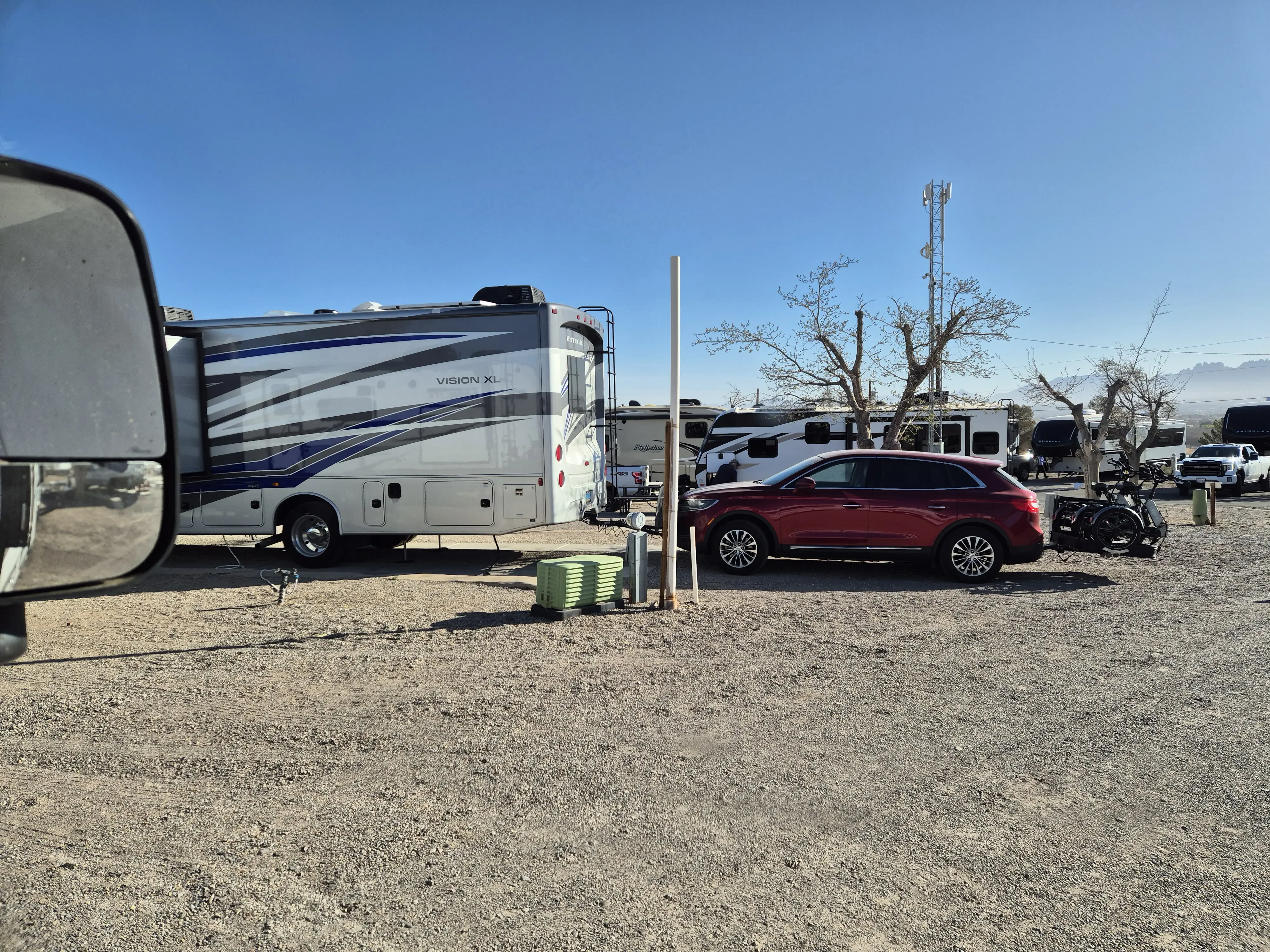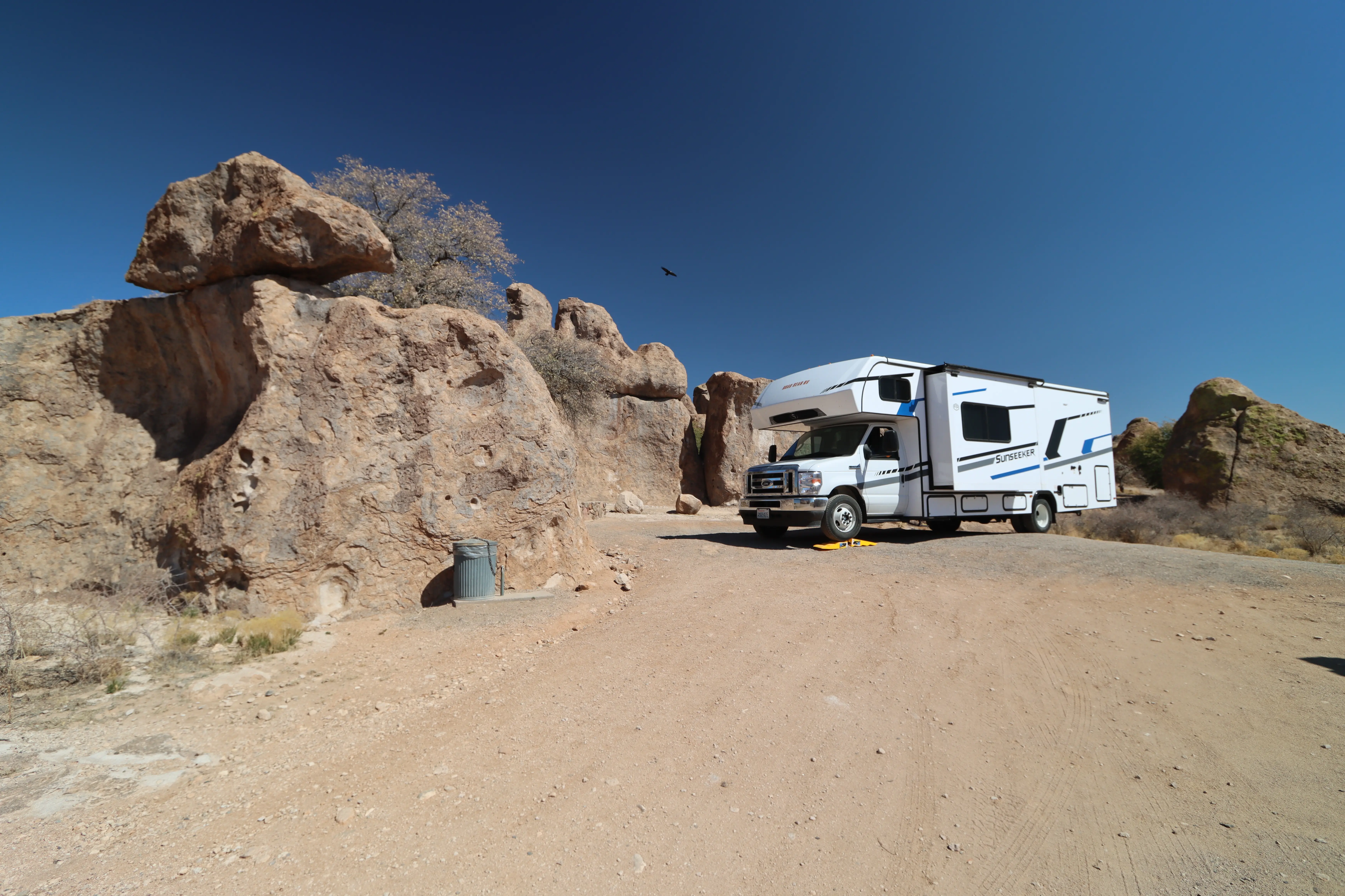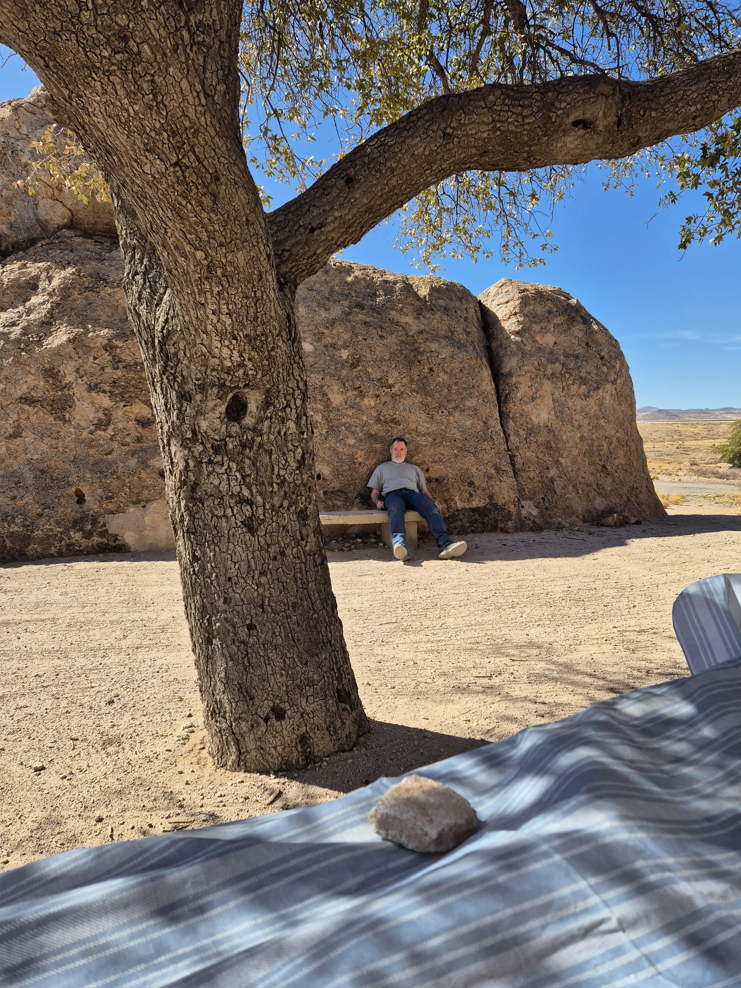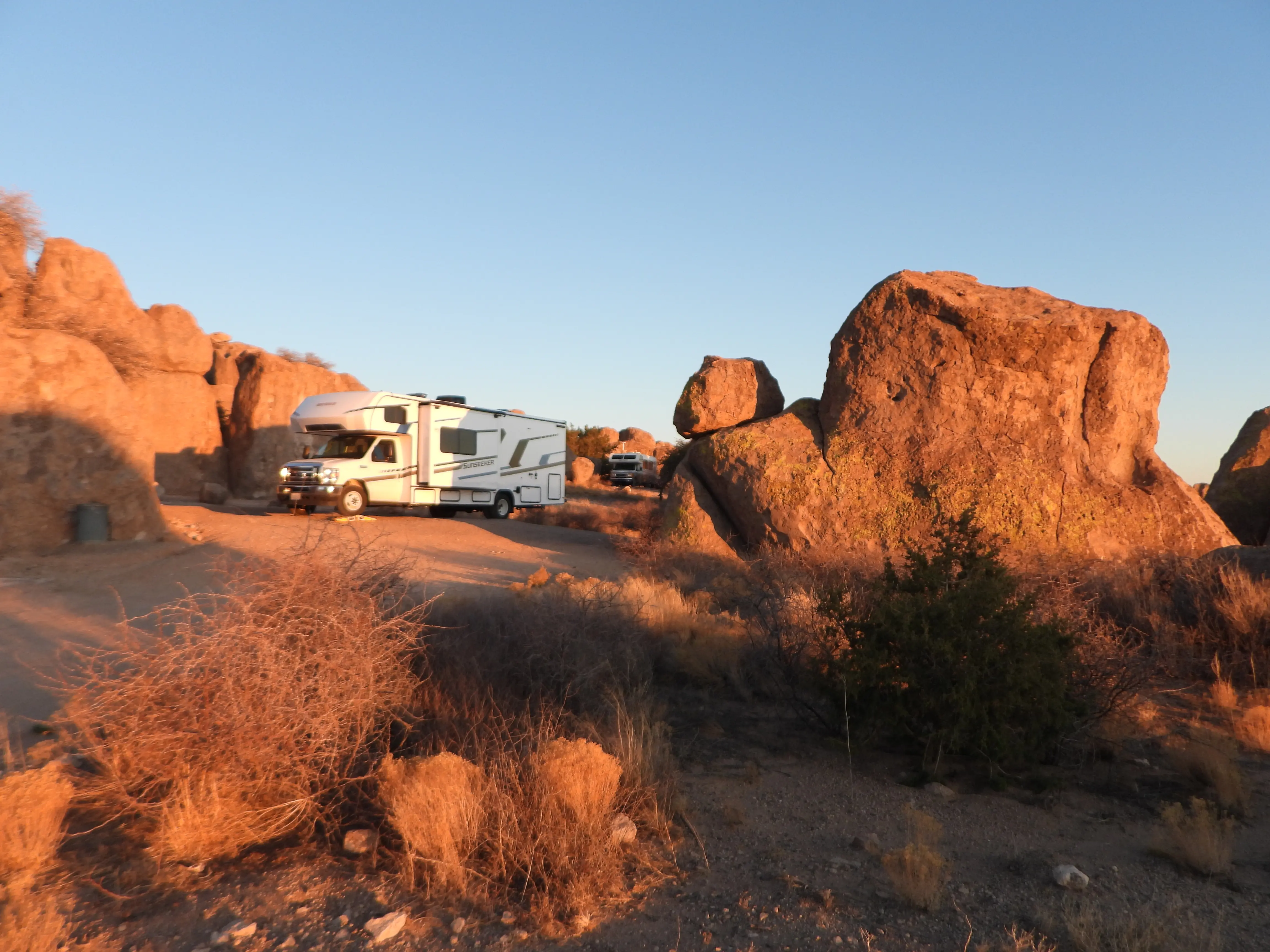 Vandaag doen we weer lekker rustig aan de Camping City of Rocks ligt hier niet zo ver vandaan en we moeten dus wat tijd overbruggen om daar niet te vroeg aan te komen. Bijna elke dag controleren we de olie soms is de motor al gestart en ja dan houdt het op, maar vandaag is het gelukt om het voor die tijd te doen. Waar wij ons ook over verbazen zijn de grote bus campers die hier rondrijden, de 9 van de 10 keer er ook nog een auto achter hebben hangen, en deze had daar zelfs nog een fietsendrager op met fietsen. Dat moet je in Nederland eens proberen.