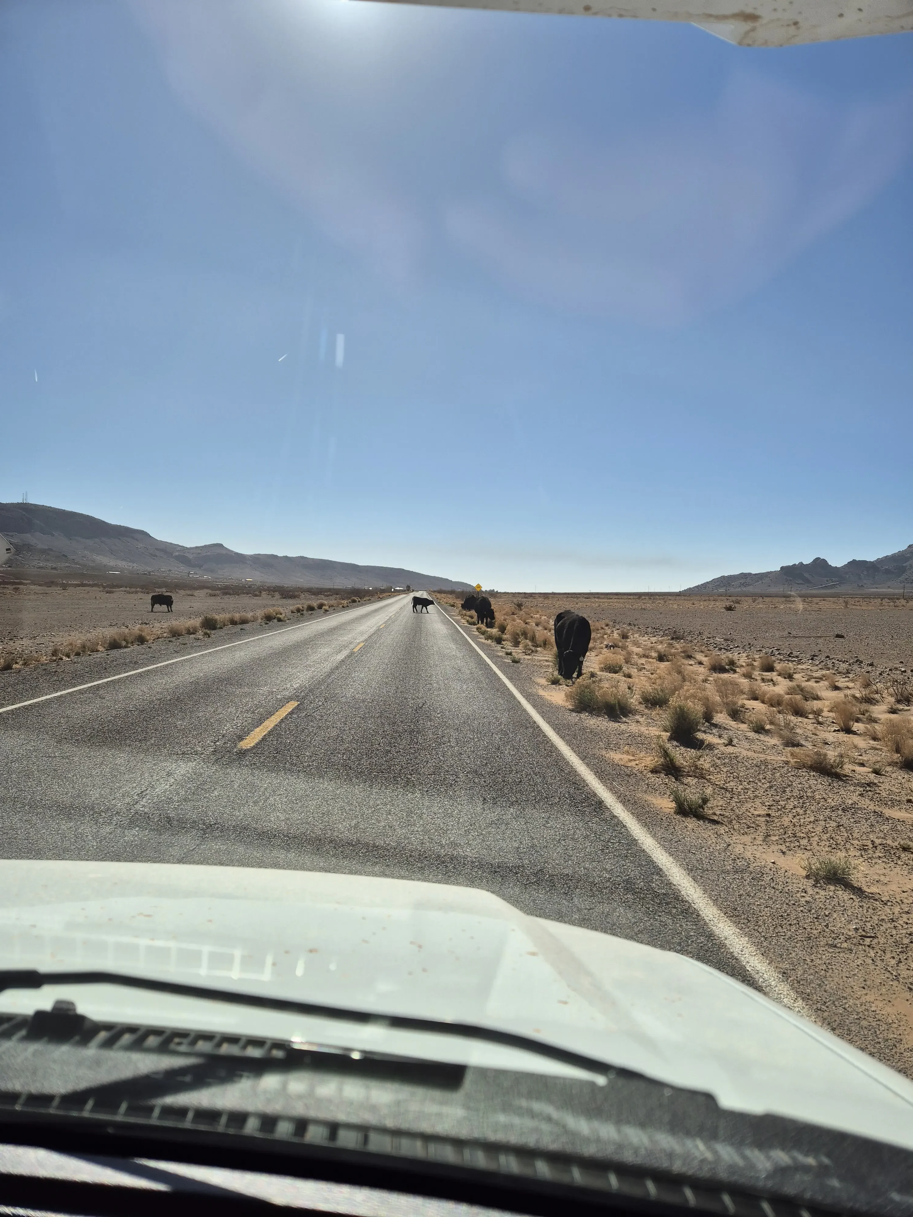 We blijven ons hier ook verbazen over de grote lege vlaktes die je overal zit, lange lege wegen zo ver als je kunt kijken. En dan in het midden van een grote dorre vlakte zie je de koeien gewoon over de weg lopen.