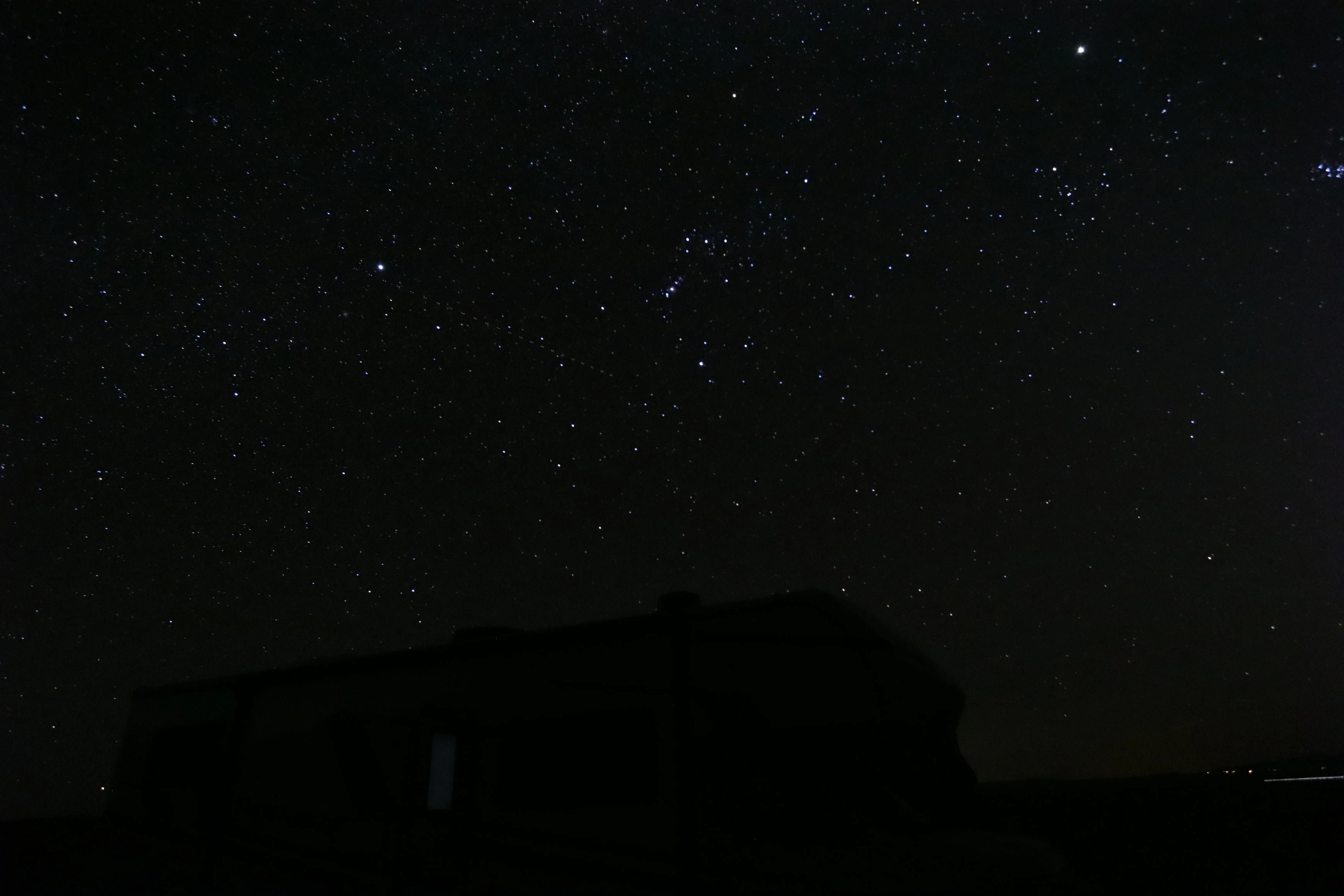 En als we dan zitten in het pikkedonker zien we miljoenen sterren wat is dit toch mooi, we doen pogingen om het op de foto vast te leggen maar op een of andere manier lukt dat met mijn camera niet. Rob heeft uiteindelijk de slag te pakken en kan er nog wat van maken, heel veel later gaan we naar binnen en meteen slapen. Het is inmiddels vrij koud geworden en aangezien we geen stroom hebben hier ook geen verwarming.