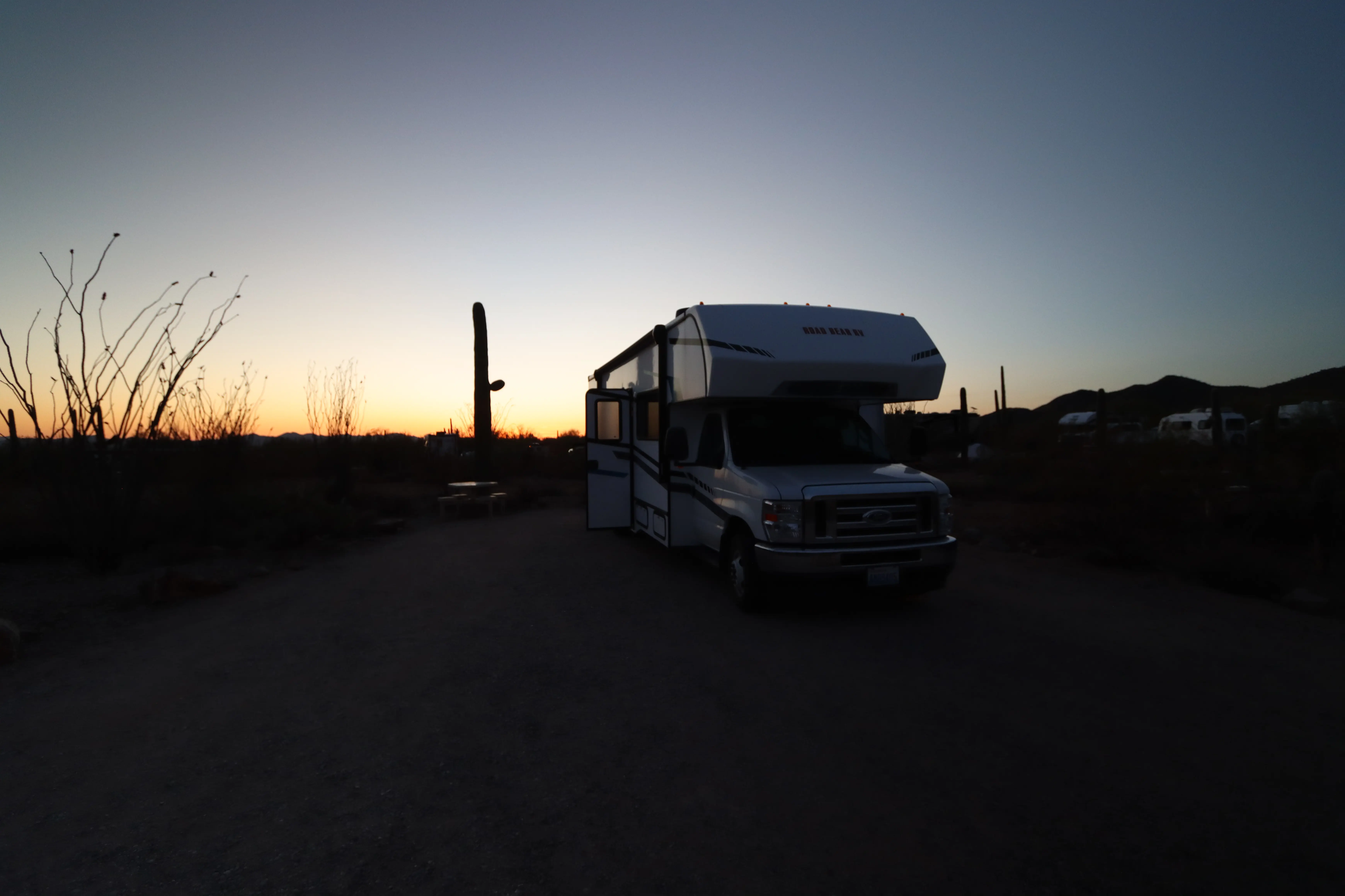 Gelukkig komen we nog voor het donker aan bij de Gilbert Ray Campground. Ook hier is het nog flink heet. We gaan lekker eten en daarna nog wat foto’s maken want ook hier zien we een mooie lucht als ze zon onder is.