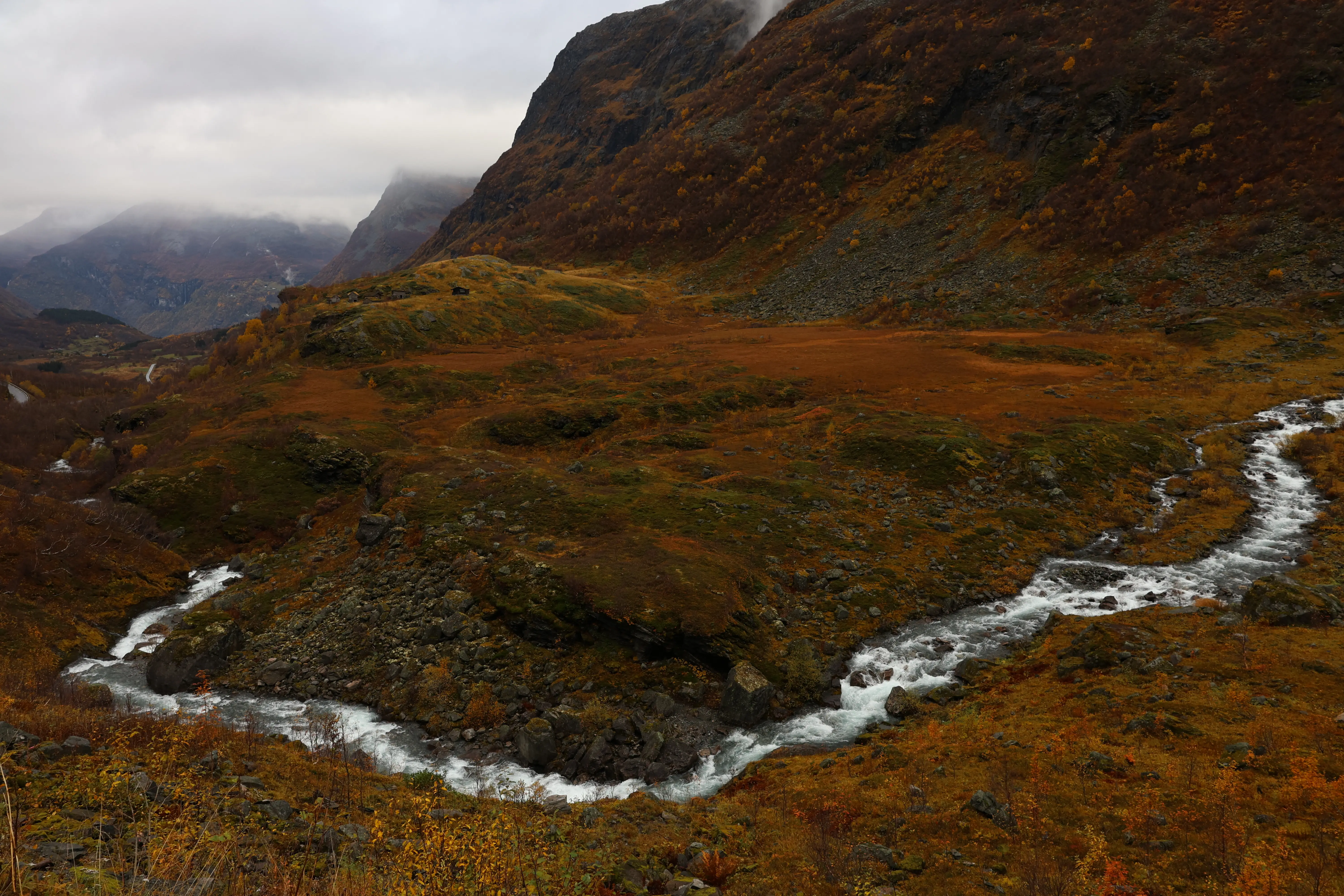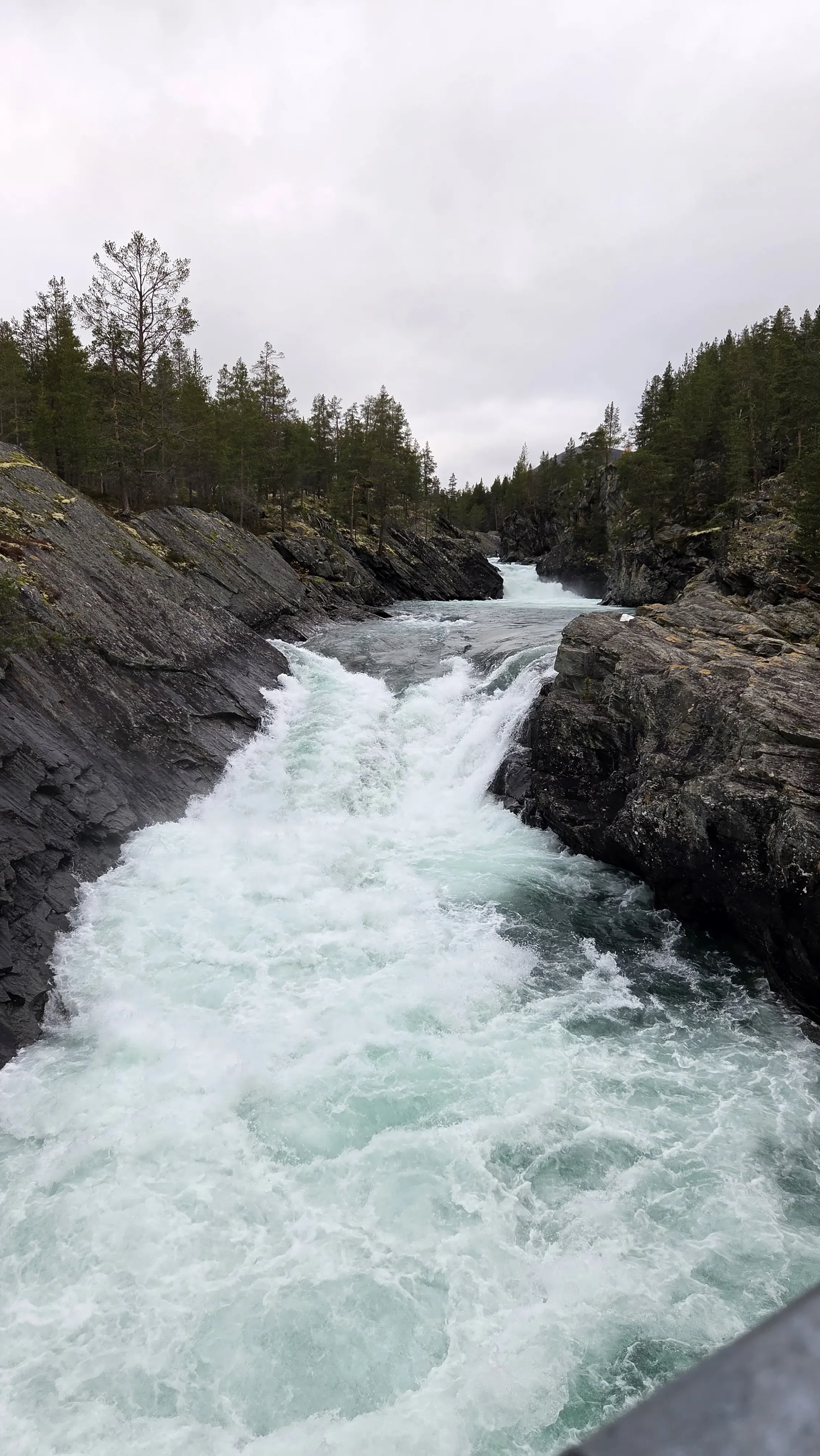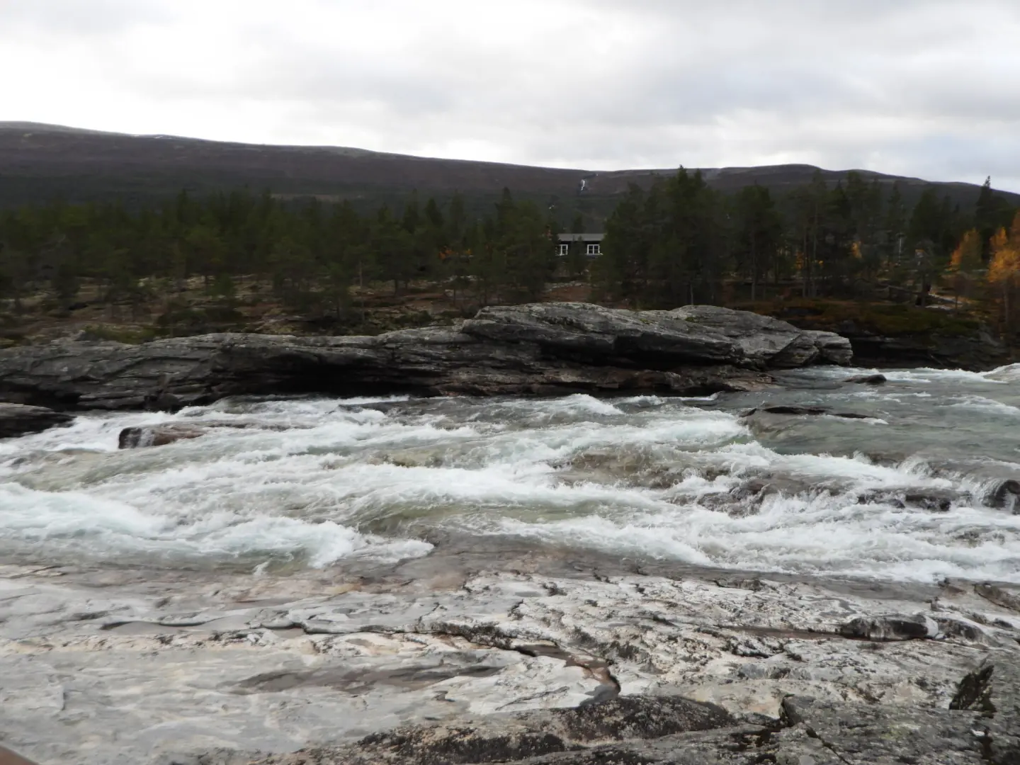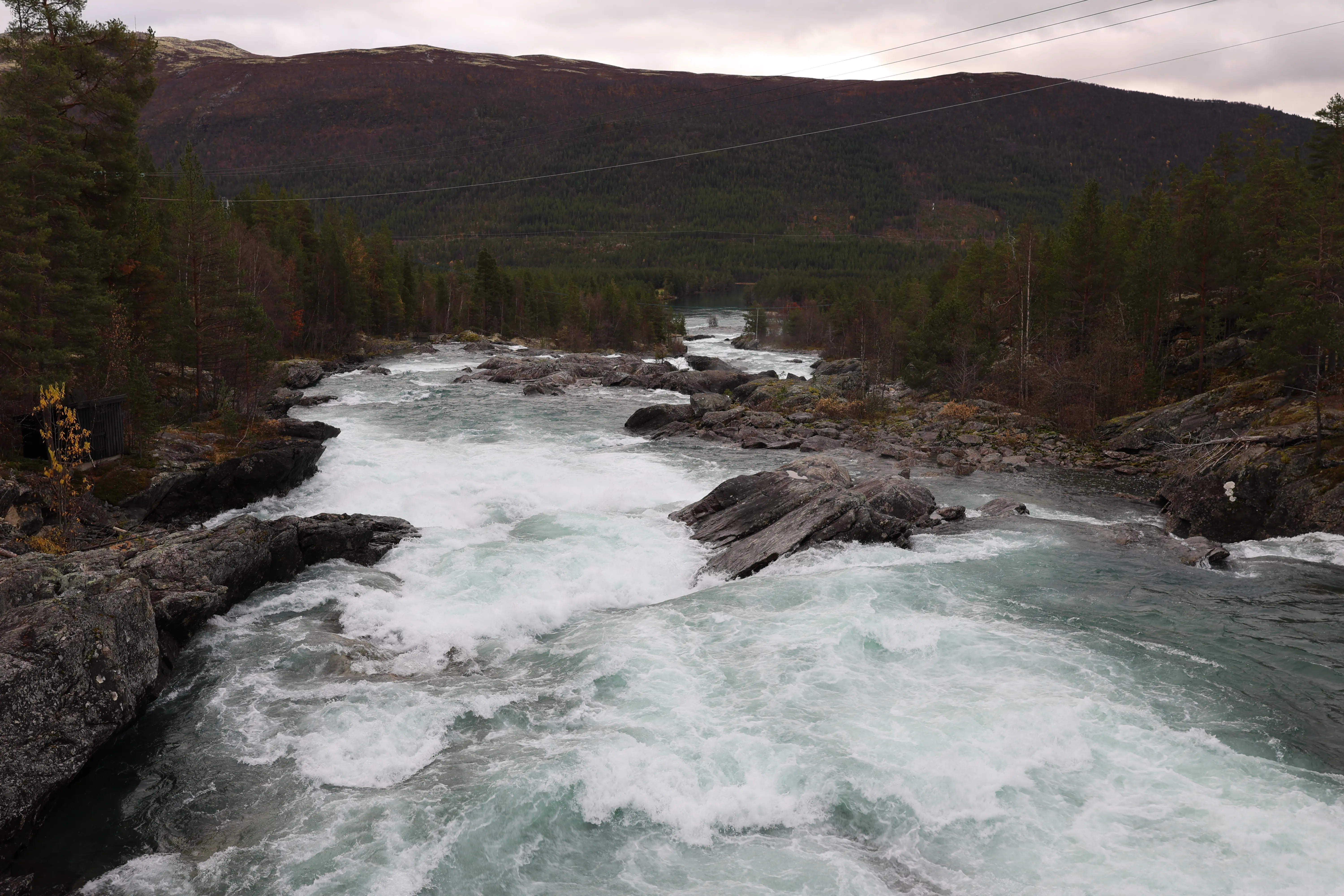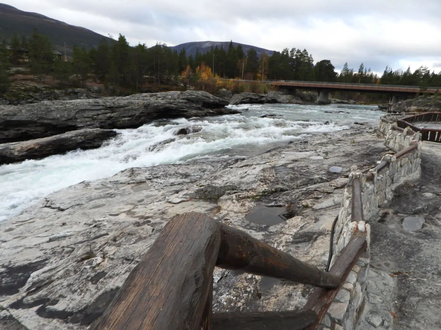 We rijden door naar de Dønfoss camping op het terrein ligt een klein uitkijkpunt waar je de rivier goed kunt bekijken. We lopen langs een leeg zwembad, bij een net zo lege camping je kunt hier echt zien dat het seizoen is afgelopen. Het water heeft hier de rotsen flink afgesleten en hier is ook een Giant Cauldron, deze worden gemaakt door het draaiende water en stenen die in de cauldron blijven liggen en draaien.