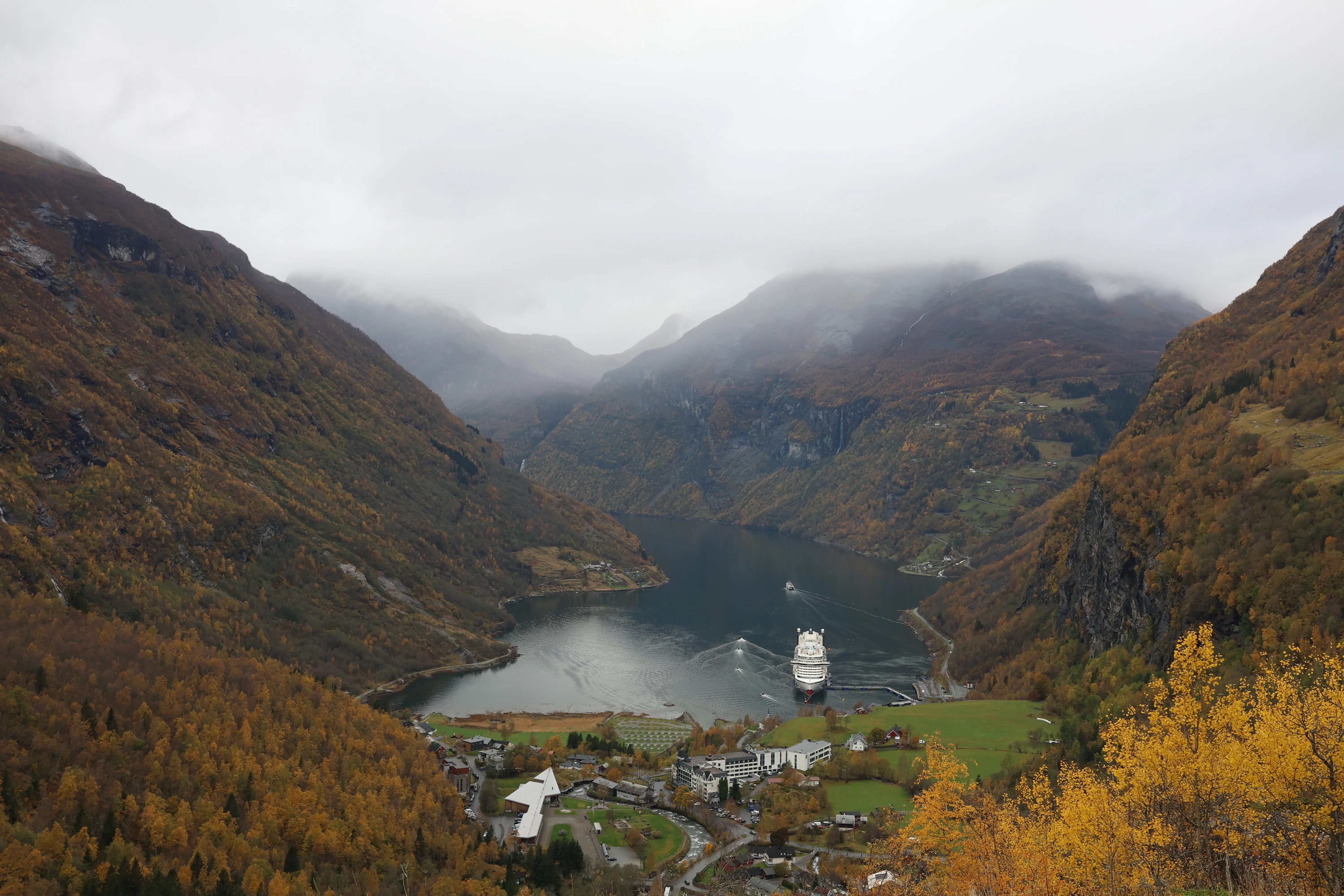 Onderweg stoppen we nog een keer voor een aantal grote watervallen bij elkaar het komt met heel veel geweld naar beneden. Bijna beneden is een uitzichtpunt waarbij je over het Fjord heen kunt kijken en we zien dat er een cruiseschip aangemeerd ligt. We kunnen hier even rondlopen en genieten van het uitzicht.