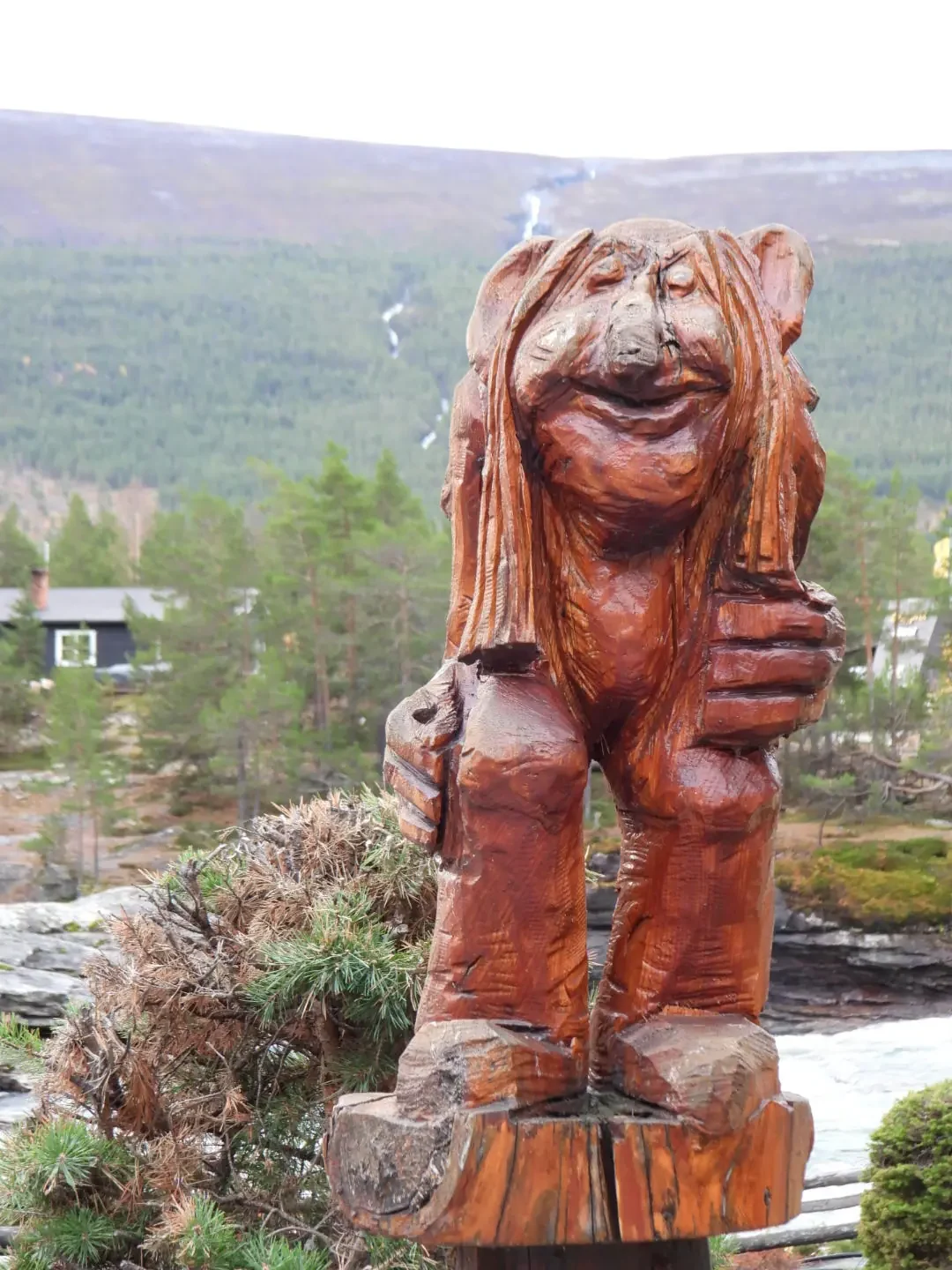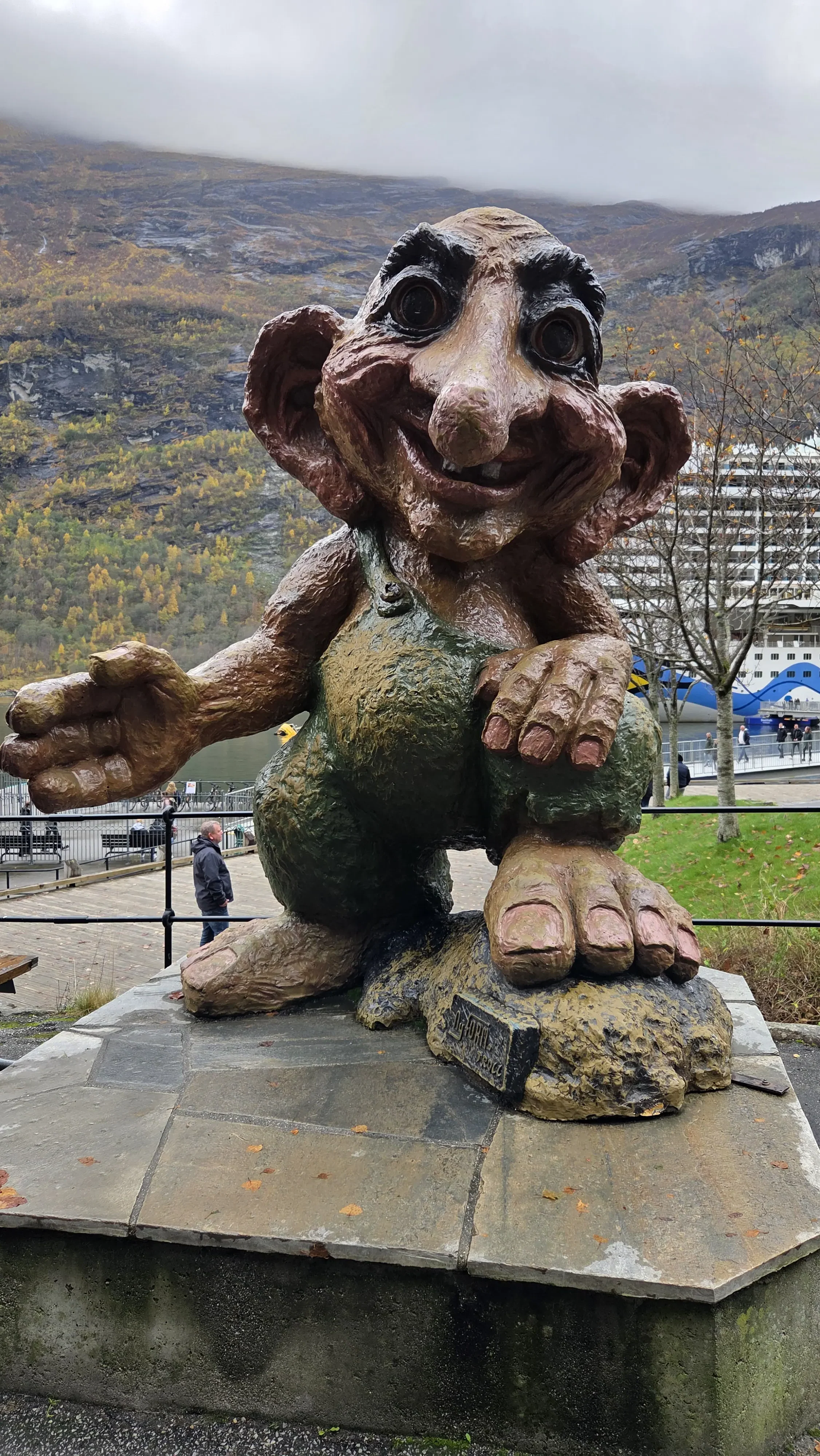 Beneden aangekomen parkeren we de auto en zien meteen een grote Troll ik blijf ze leuk vinden. Aangezien hier een souvenir winkeltje is gaan we even schoppen, dit is de eerste die we tegenkomen en die open is. Ik koop natuurlijk een Troll en ook een mok, altijd handig.