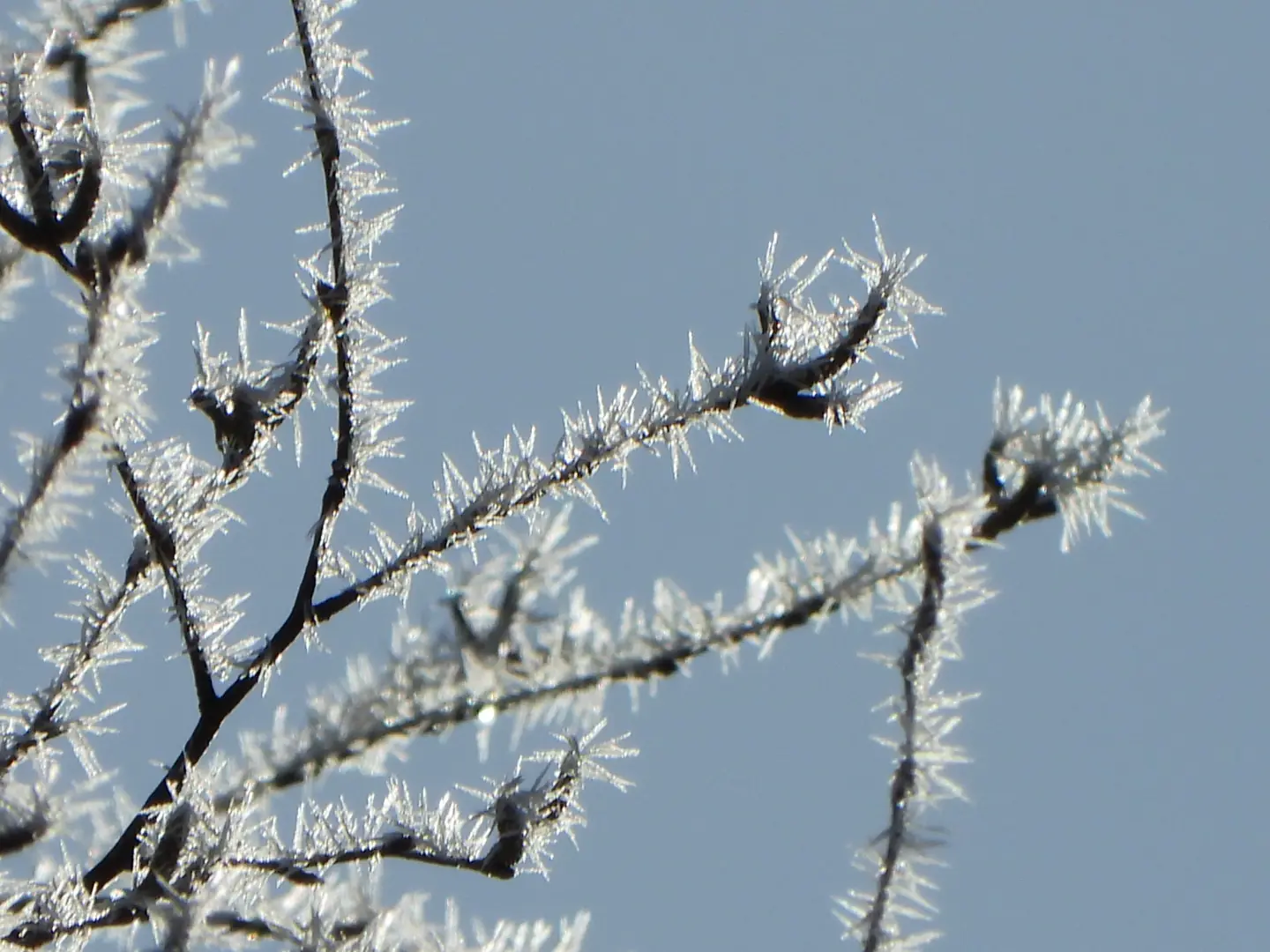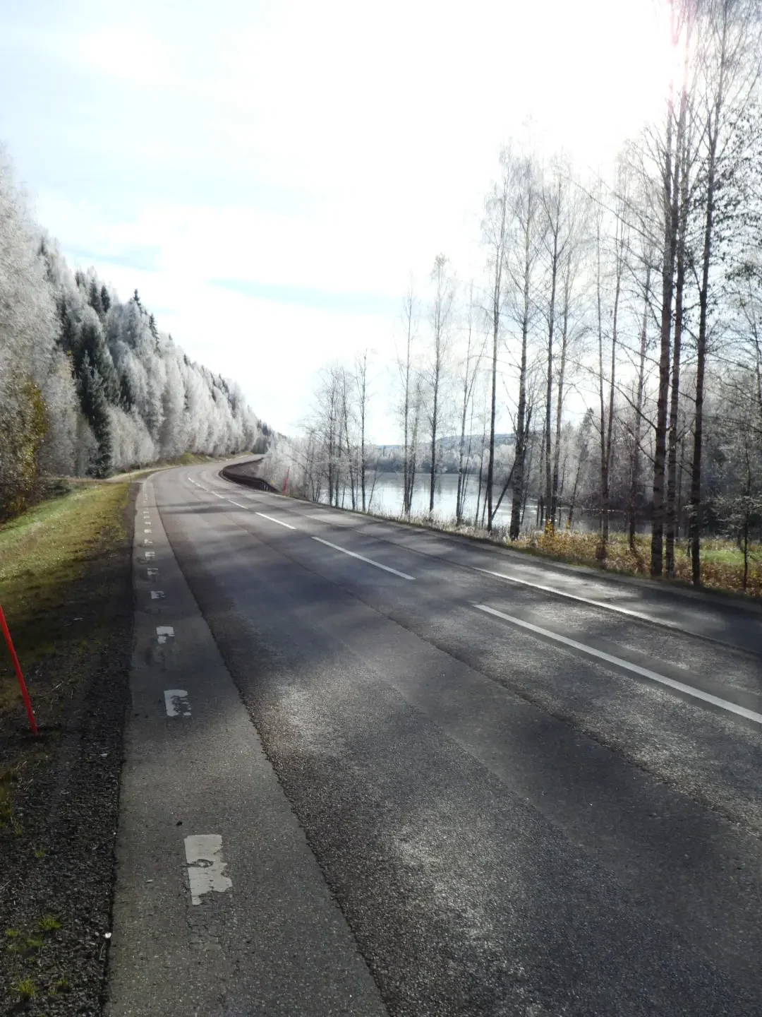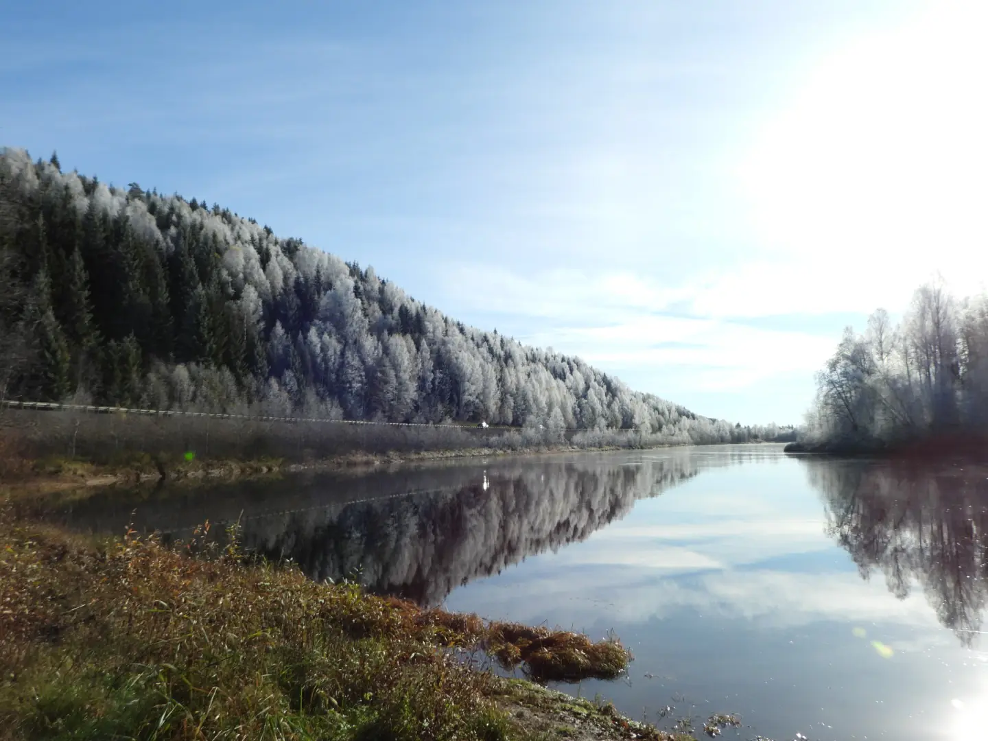 Langs deze weg loopt ook de rivier en we zien dat de bomen nog steeds schitterend zijn met al die rijp en nu de zon erop. We stoppen ergens om een paar mooie foto’s te maken.