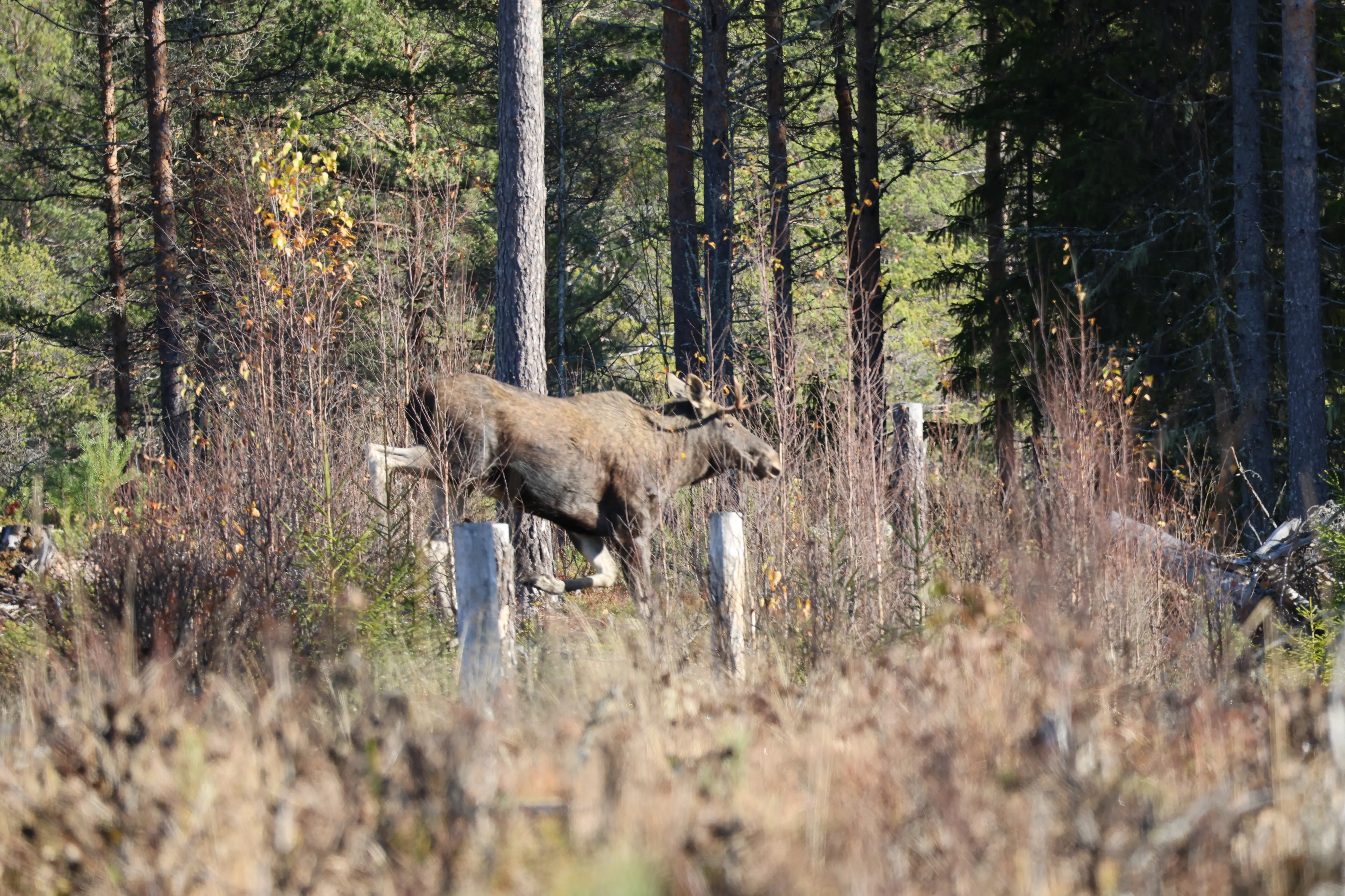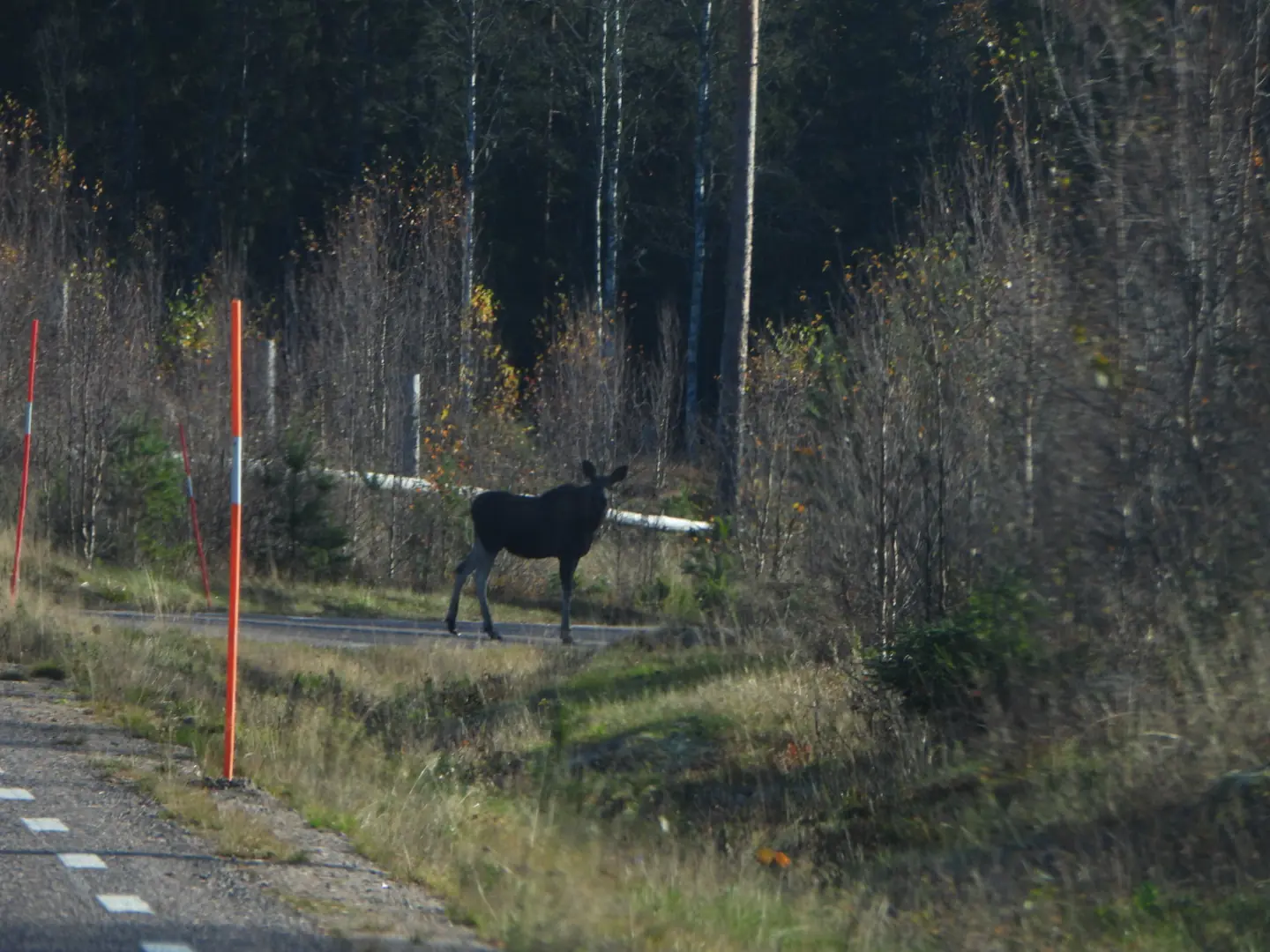 Helaas komt er van de andere kant ook een auto, dus de eland loopt meteen terug en dan zien we er nog 2. Jammer genoeg lopen ze heel snel weg en is foto’s maken bijna onmogelijk. Als we denken dat ze weg zijn rent er nog een 4de achteraan. Dit is zo gaaf om te zien.